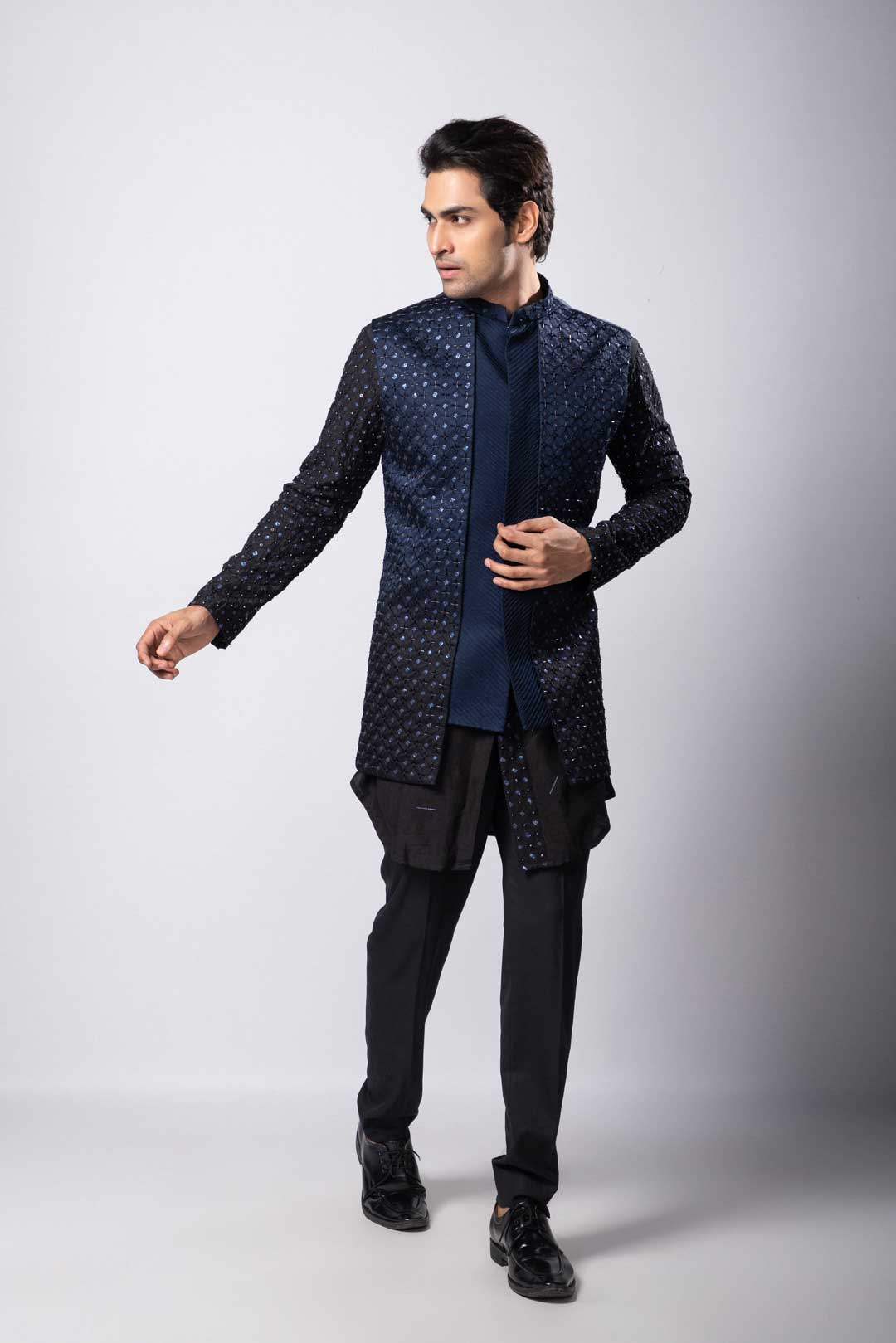 Easiest way to shine this wedding season is with a classic colour combination of navy to black accentuated by matching embellishments. Diagonal pintucks on the front provide a layered look. Just as summer’s most popular styles have started to feel stale, our stylish kurtas are here to help you hit the reset button. This black shirt style kurta with blue embellishments on the collar, placket and sleeves makes one stand out from the crowd. Comes with matching black pant pajama.