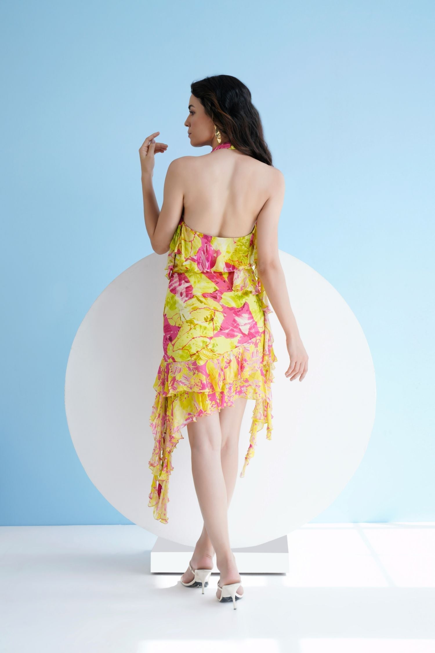 Featuring a neon pink floral printed short dress in chiffon with a ruffled halter neck and frill detail.