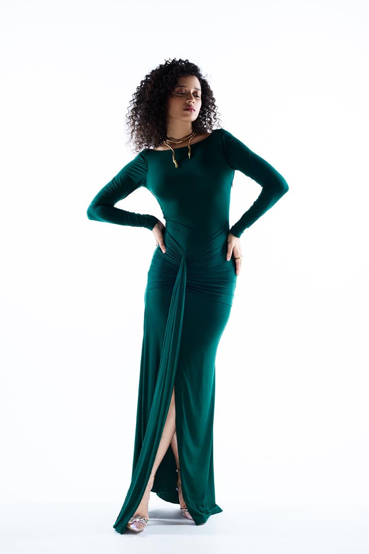 Luxurious lycra fabric in a rich green hue shapes our maxi dress. A split skirt with a statement knot brings attention to our gorgeous silhouette. Prefect for after parties, bachelorette parties.