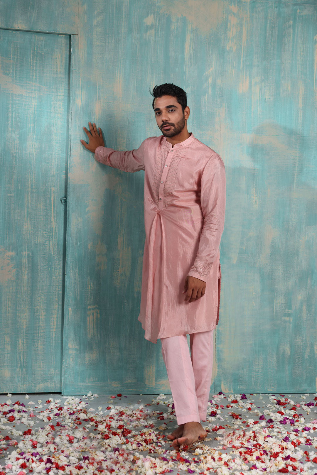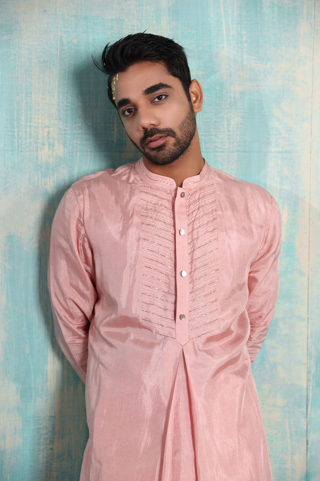 Keep traditions alive with this classy kurta crafted in silk. Adorned with embroidery on yoke and cuffs, this onion pink attire is ideal for festive occassions. Kurta length is 38". **The color may slightly vary due to screen lighting.