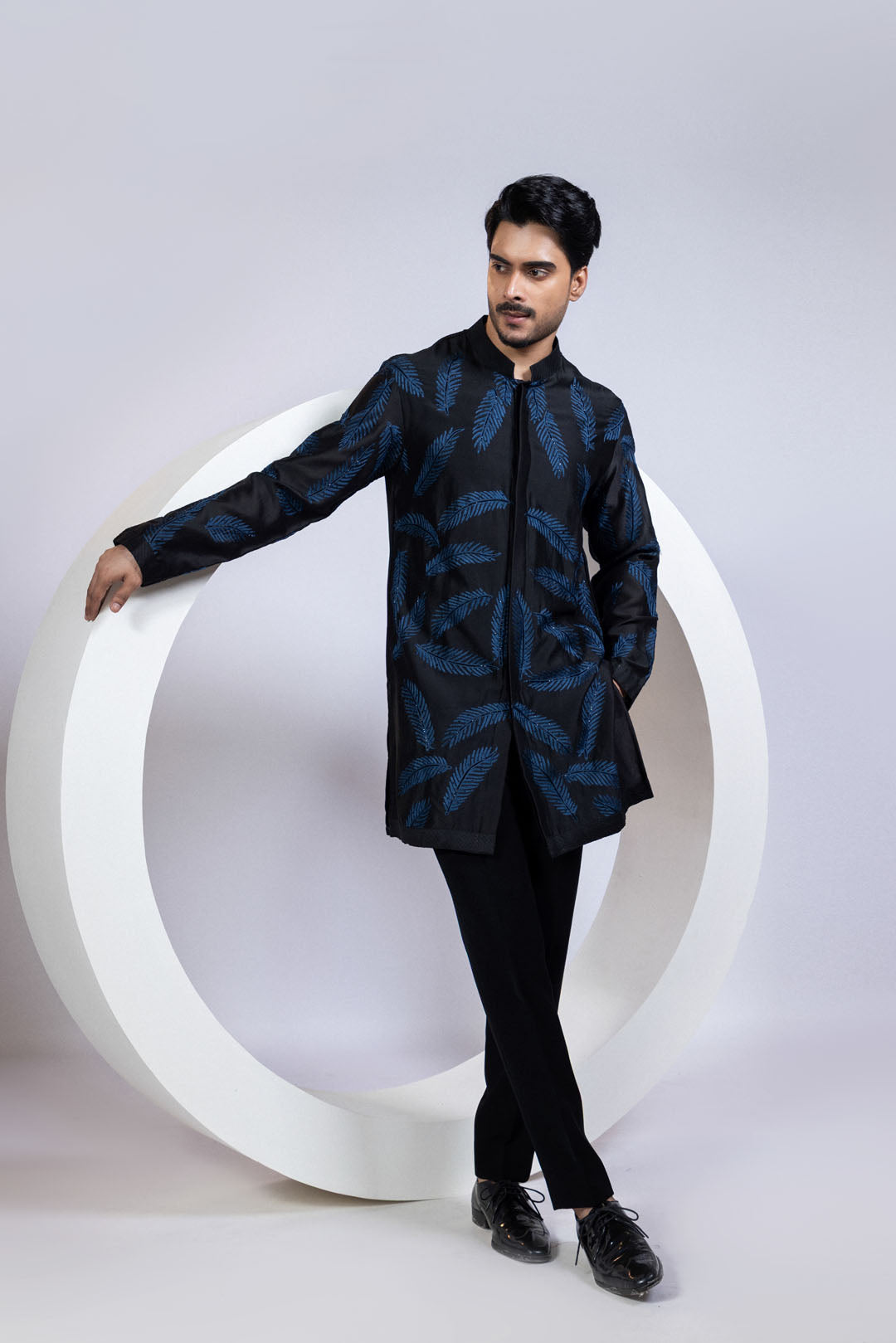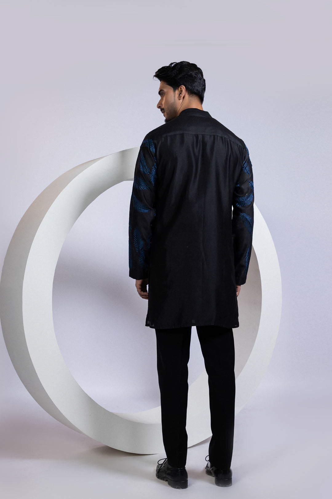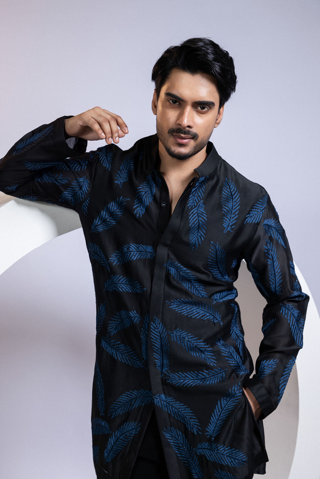 A black two-piece kurta set featuring bold indigo fern leaf embroidery in thread and cutdana across the front, back yoke, sleeves, and collar. The detailed anchoring adds depth and structure to the botanical-inspired design. A refined look with subtle edge—perfect for evening festivities and modern celebrations.