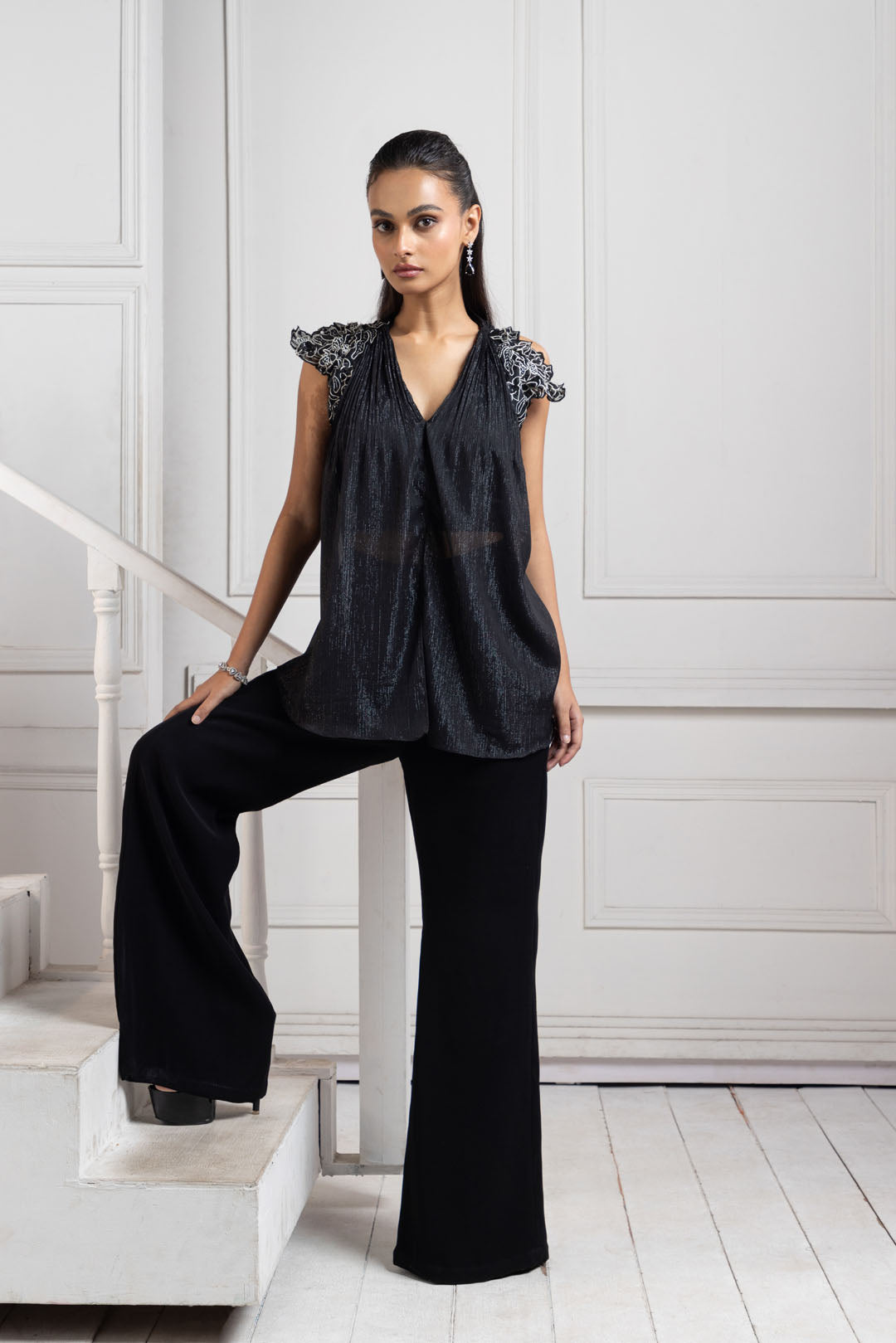 Sleek and contemporary, this black co-ord set is the epitome of modern sophistication. The top showcases intricate textured detailing, adding depth and charm, while the wide-leg trousers ensure a relaxed yet polished silhouette. Perfect for formal evenings, casual chic outings, or semi-formal events, this versatile ensemble pairs effortlessly with statement accessories or minimalist styling. Crafted for comfort and style, it's a must-have in your wardrobe for any occasion.