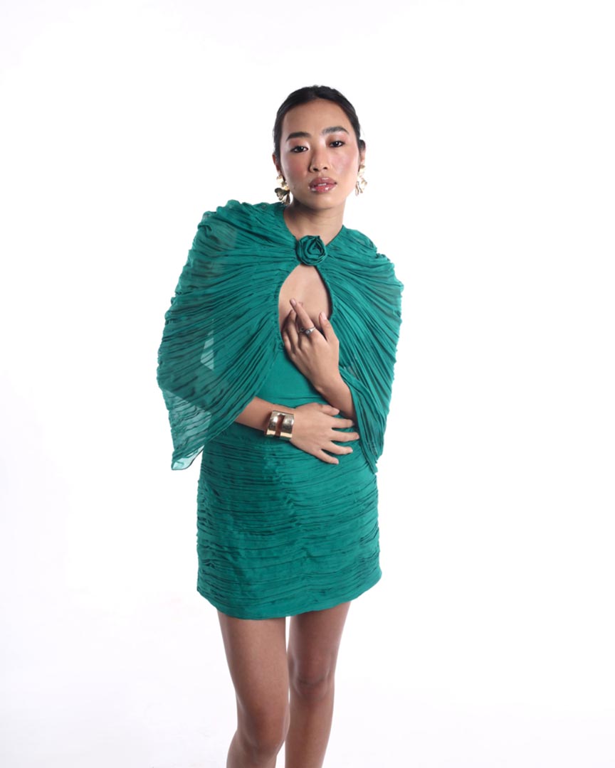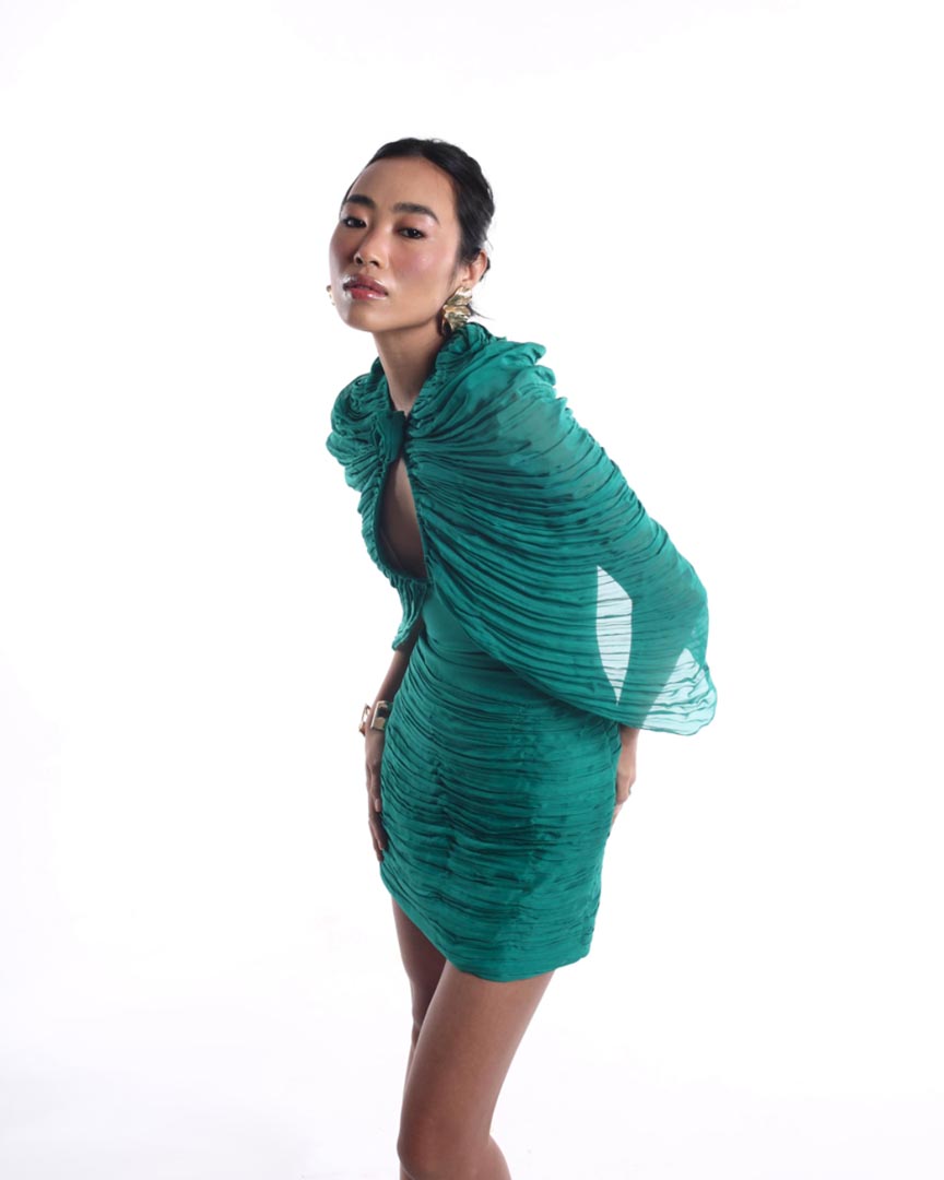 The NORA dress is a sculptural mini designed for bold elegance. Crafted from delicately ruched fabric, it features a structured silhouette, high neckline with gathered detailing, and a keyhole cut-out that adds just the right touch of drama. Draped sleeves fall into a cape-like shape, giving the piece regal energy while maintaining a modern edge.