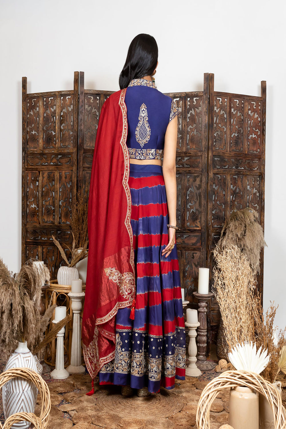 Royal blue- red tie dyed embroidered lehenga in chanderi. royal blue embroidered blouse with cap sleeves and red embroidered dupatta with tassles.