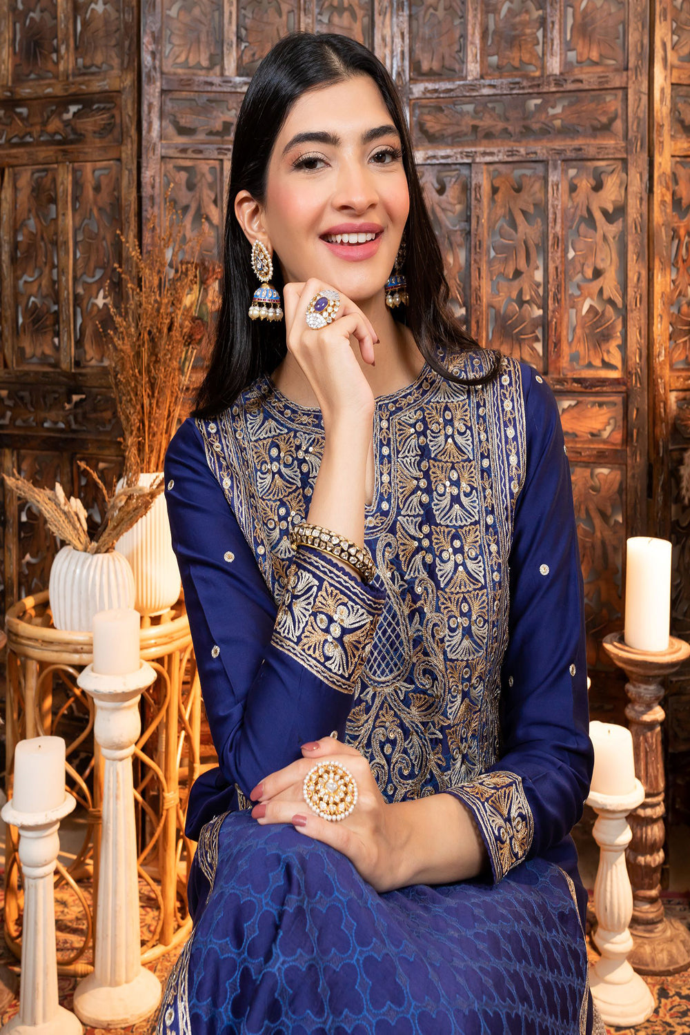 Royal blue embroidered kurta set in chanderi. comes with embroidered pallazzo pants and matching embroidered dupatta with gota-patti and crochet lace details.