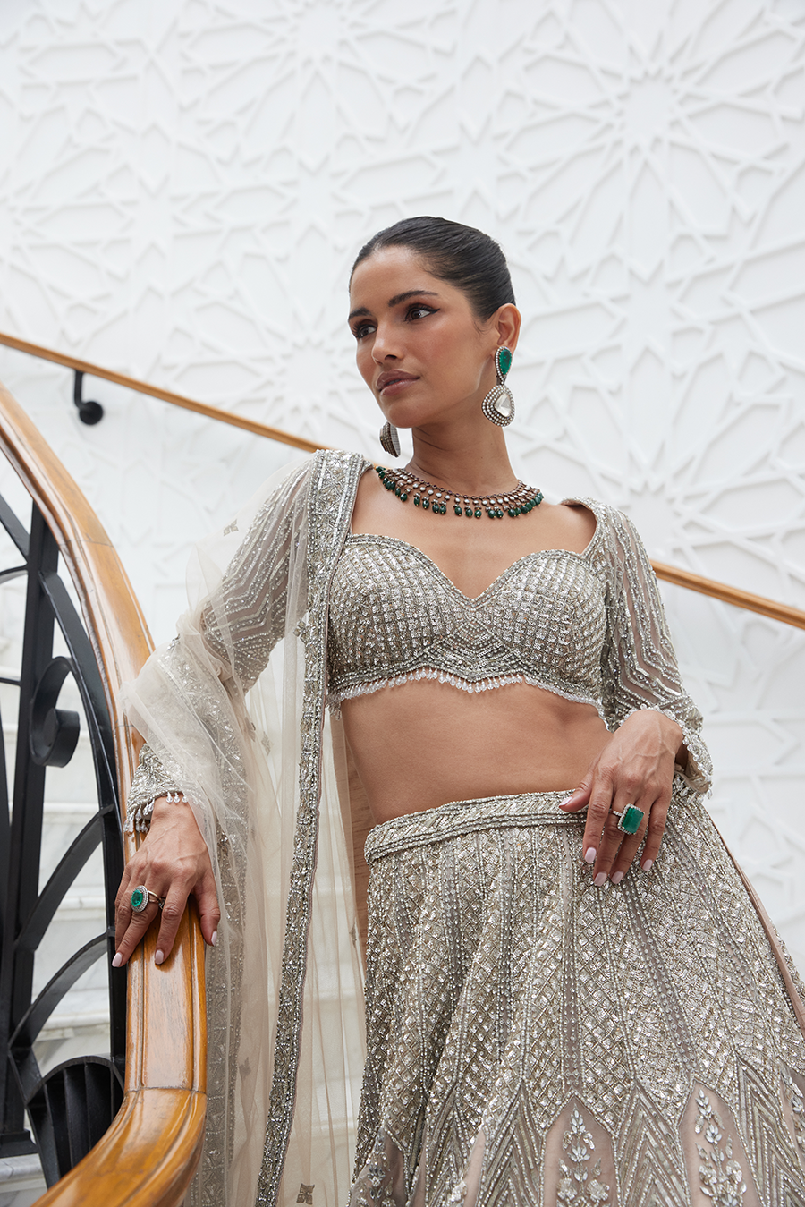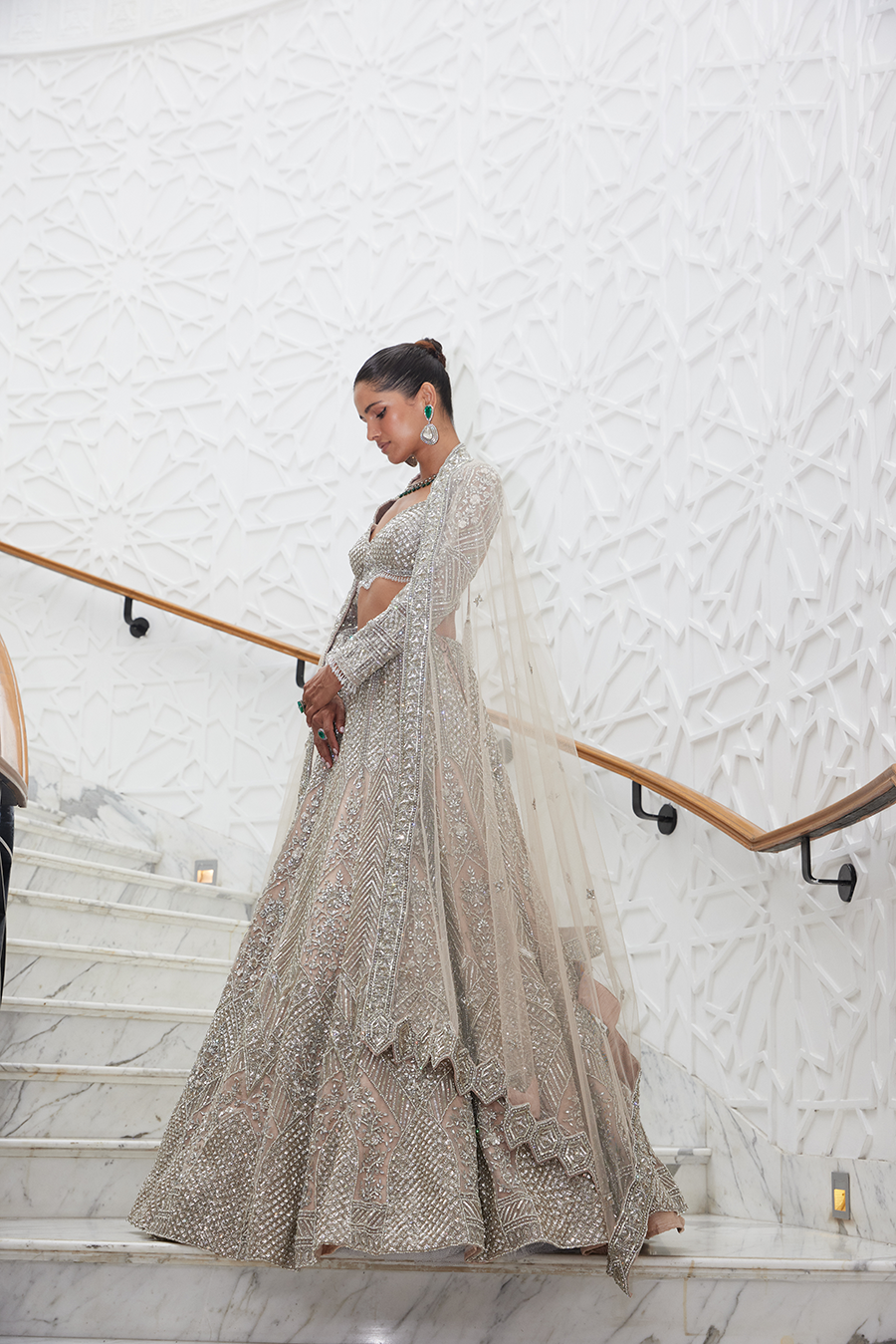 Nude Net Lehenga Choli And Dupatta Embroidered With Tonal And Silver Beads, Sequins And Crystals.