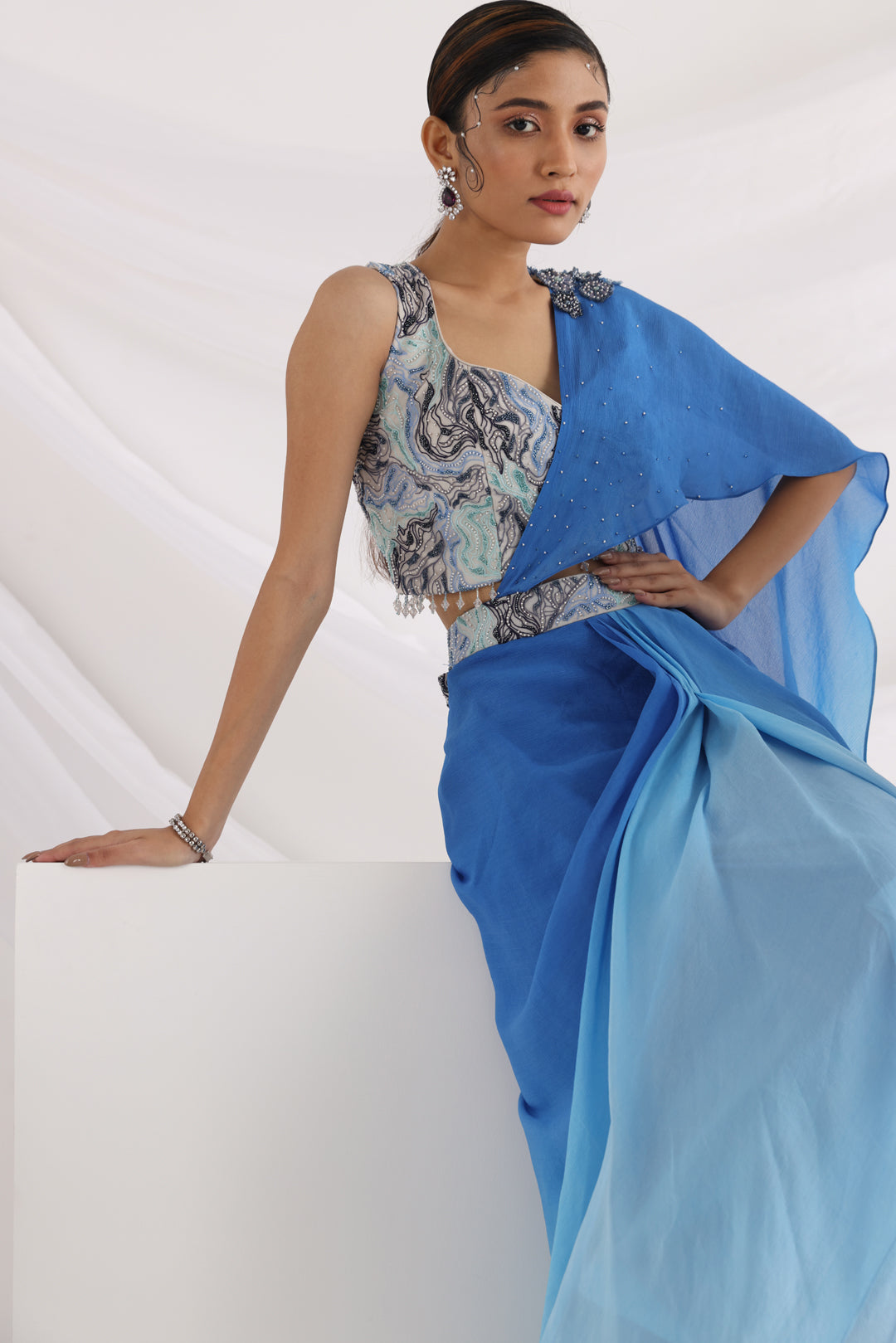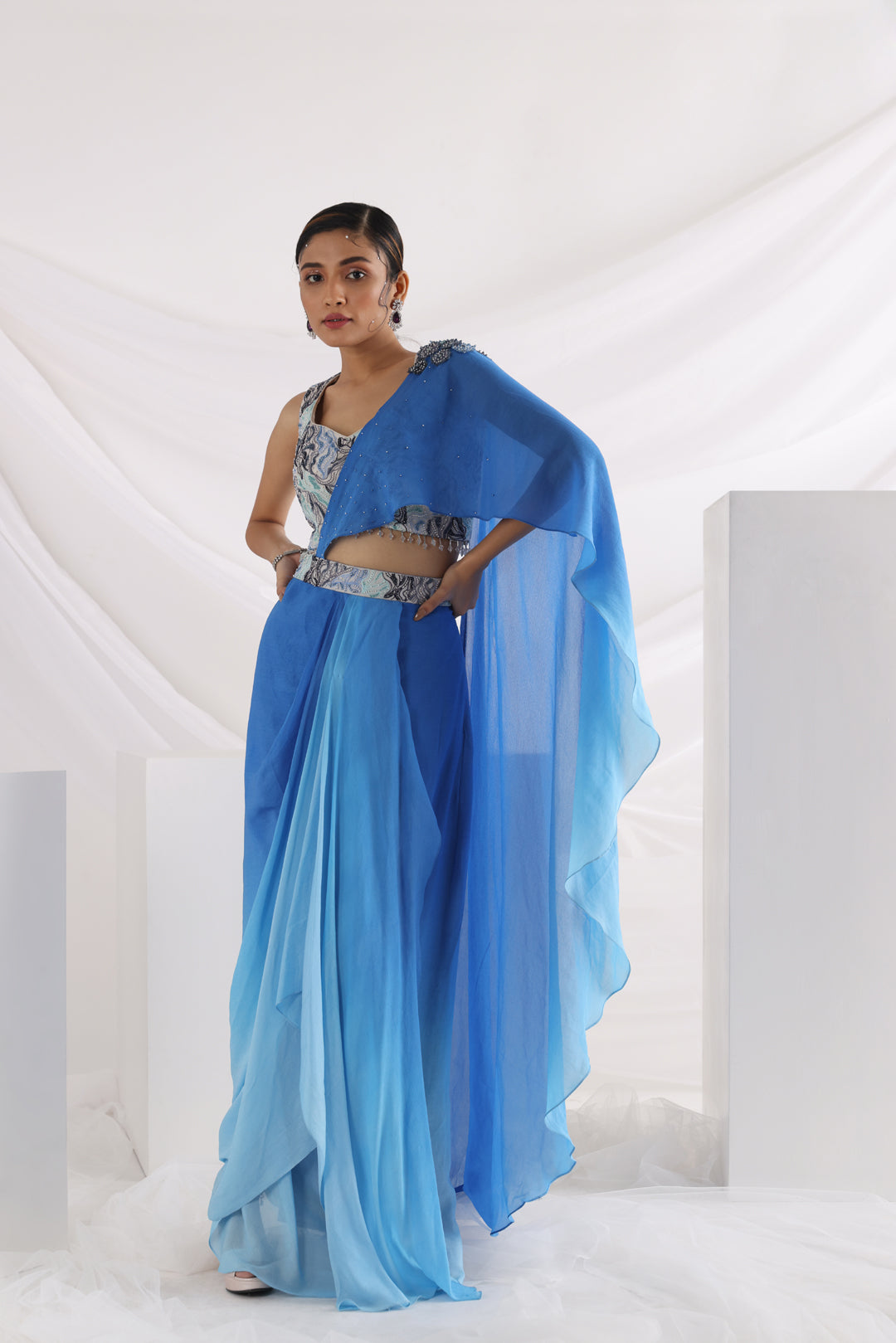 bring uniqueness to your wardrobe this saree season. Shades of blue on this set resembles the serene ocean.