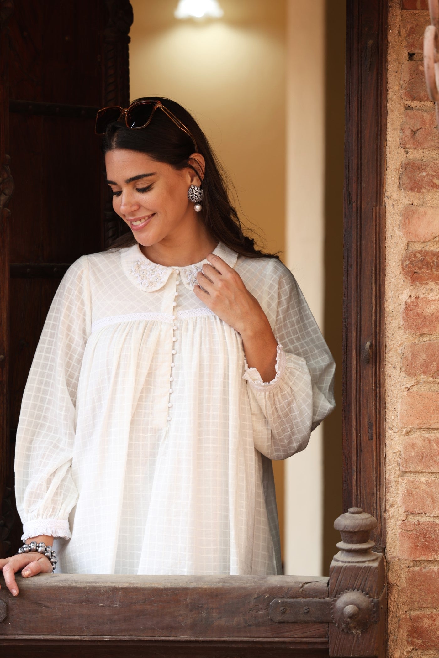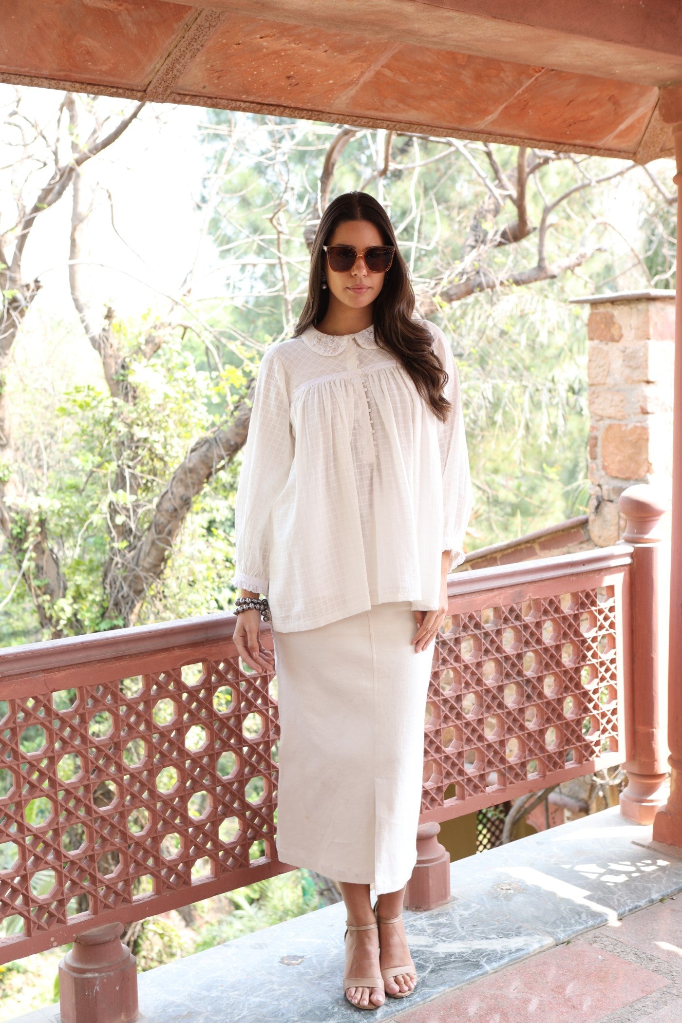 This Is An Off-White Handloom Pure Cotton Checks Short Blouse With Front Gathers, Handmade Buttons And Hand-Embroidered Collars. The Blouse Has Been Lined With Pure Cotton For Added Comfort.