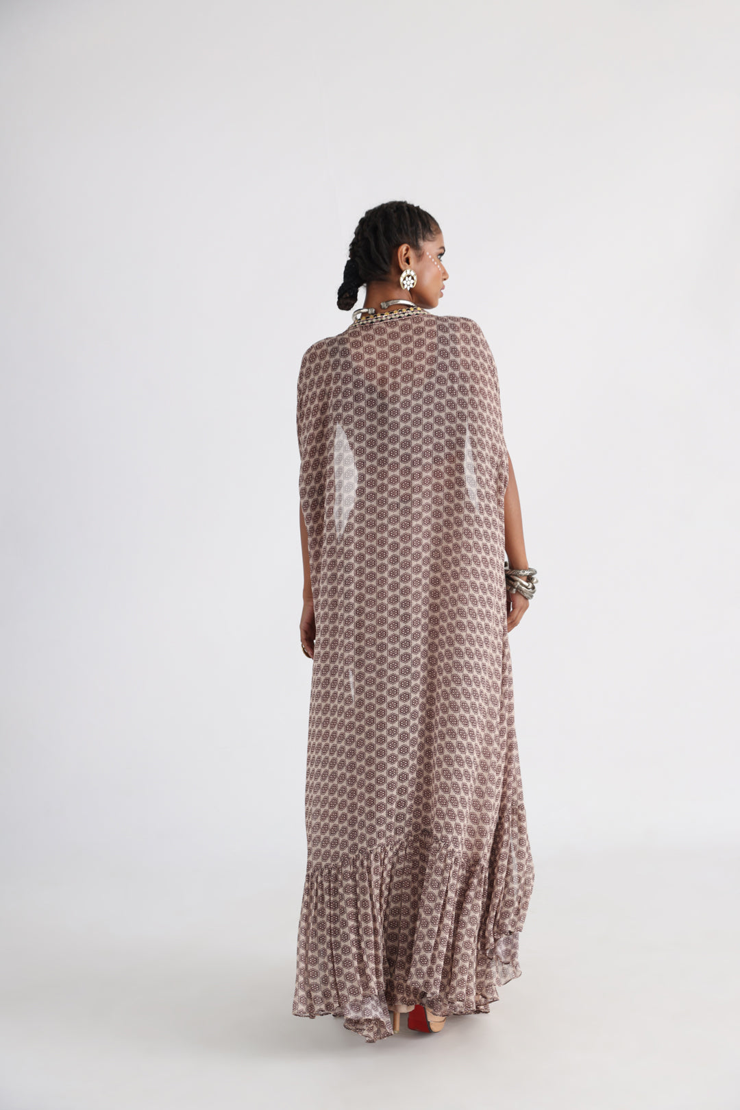 Swipe right on this printed sharara accompanied by a matching printed cape. Exquisite work inspired by afghani goldozi embellish the brown blouse, featuring complementary colors. Gold coins dangle above the hemline.