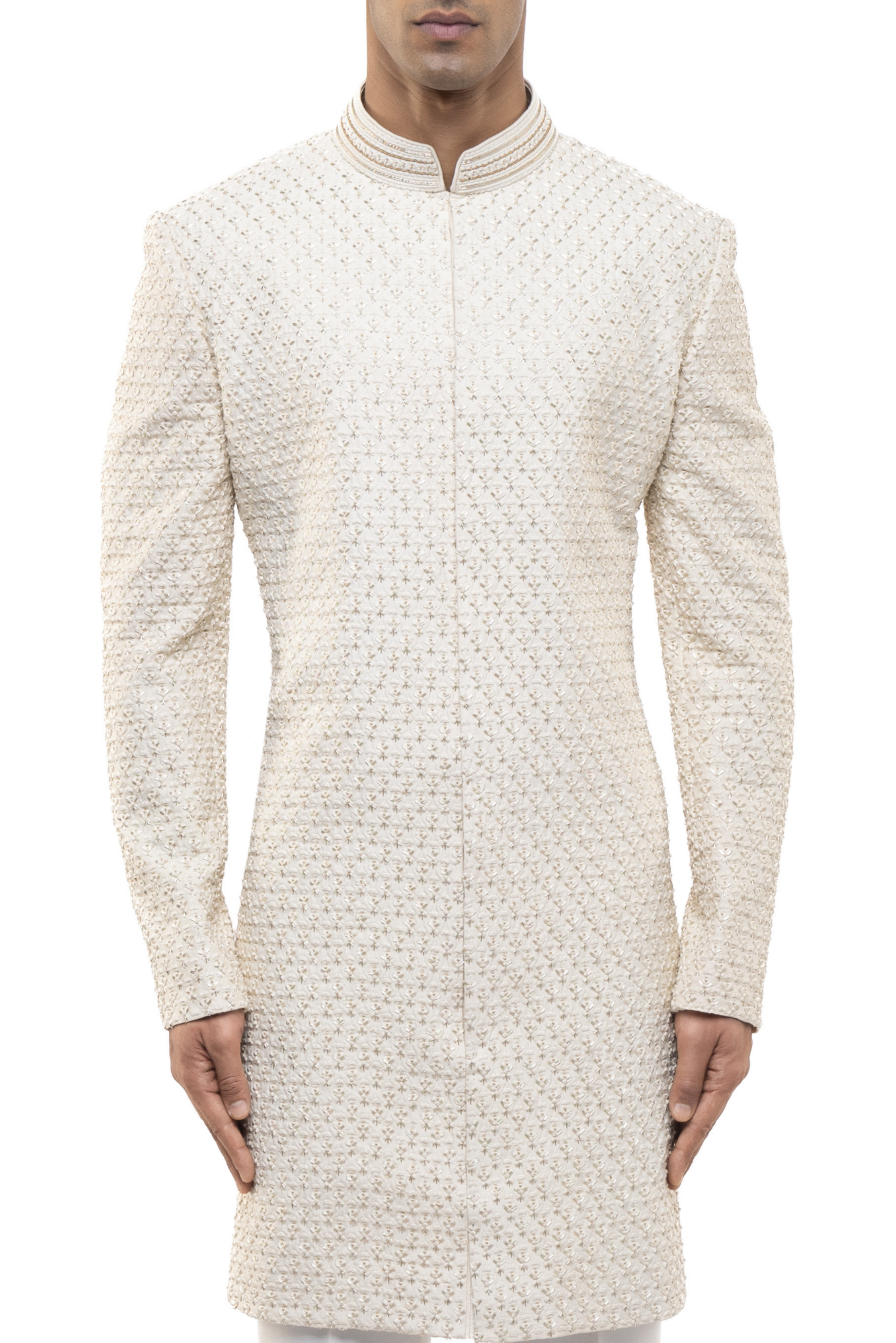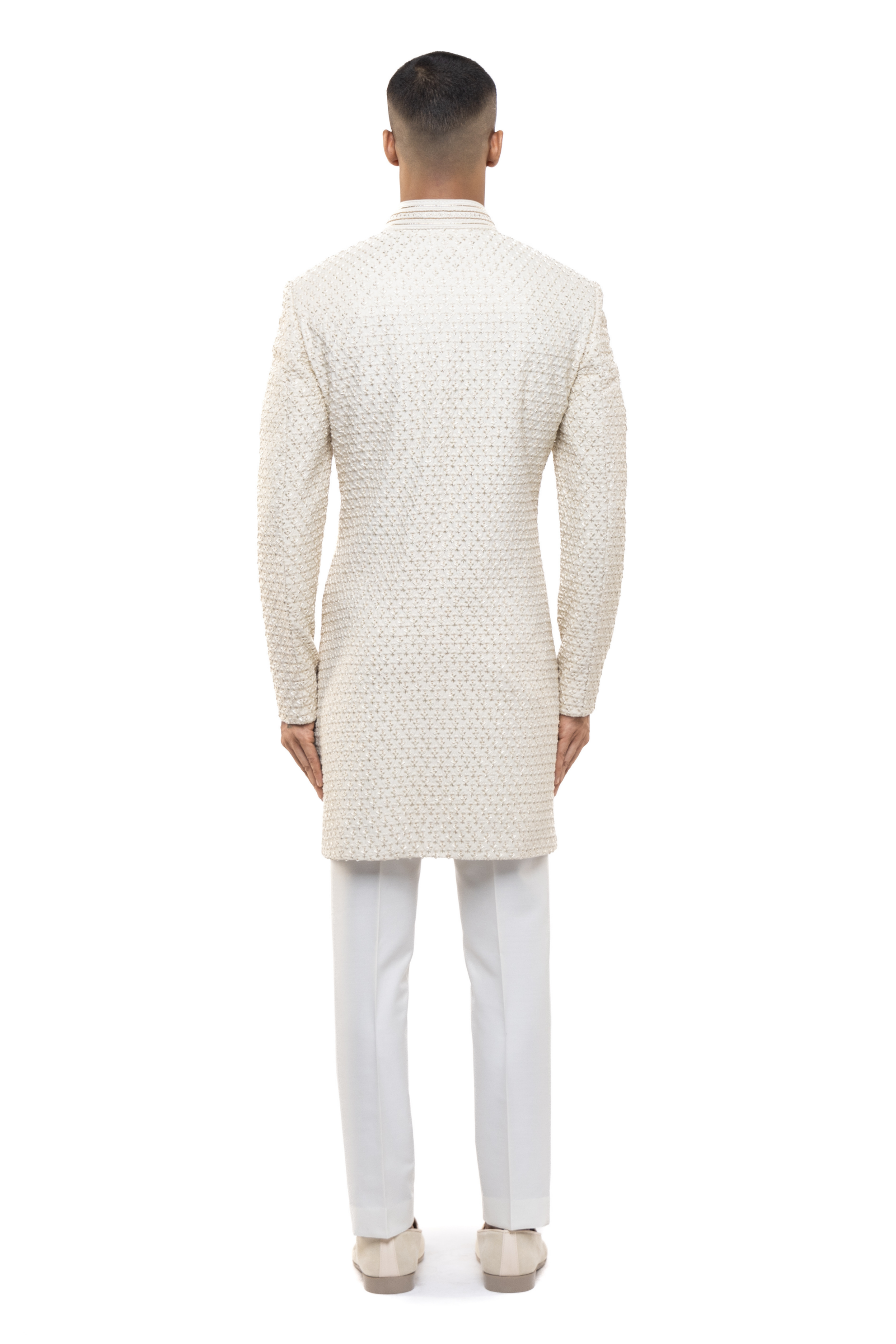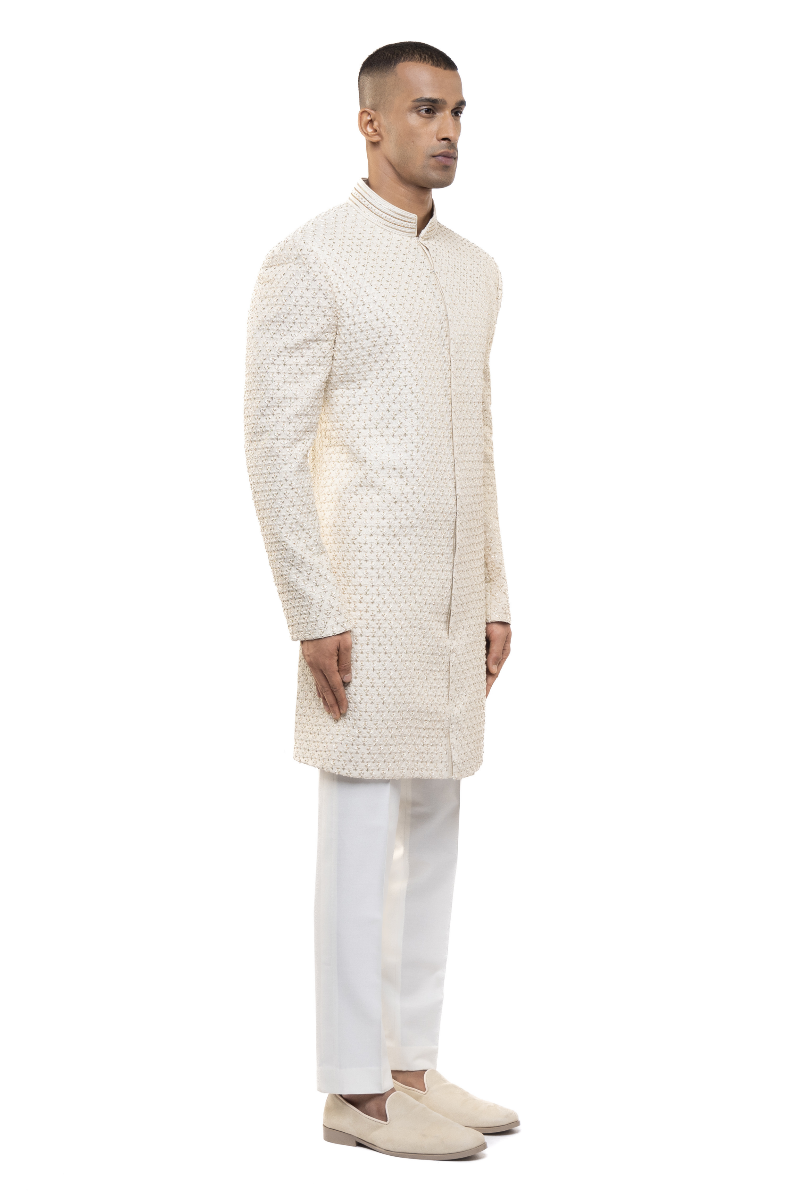 Adorned with intricate beadwork, this off-white silk sherwani is a luxurious choice for weddings.