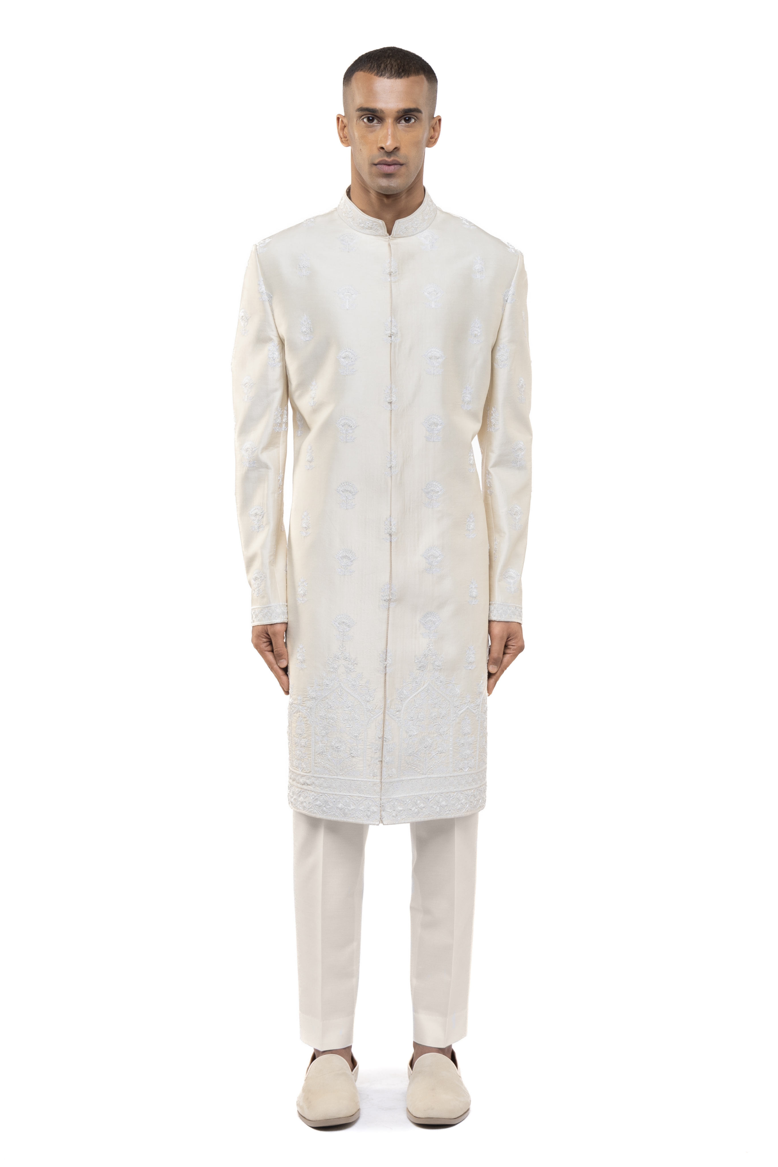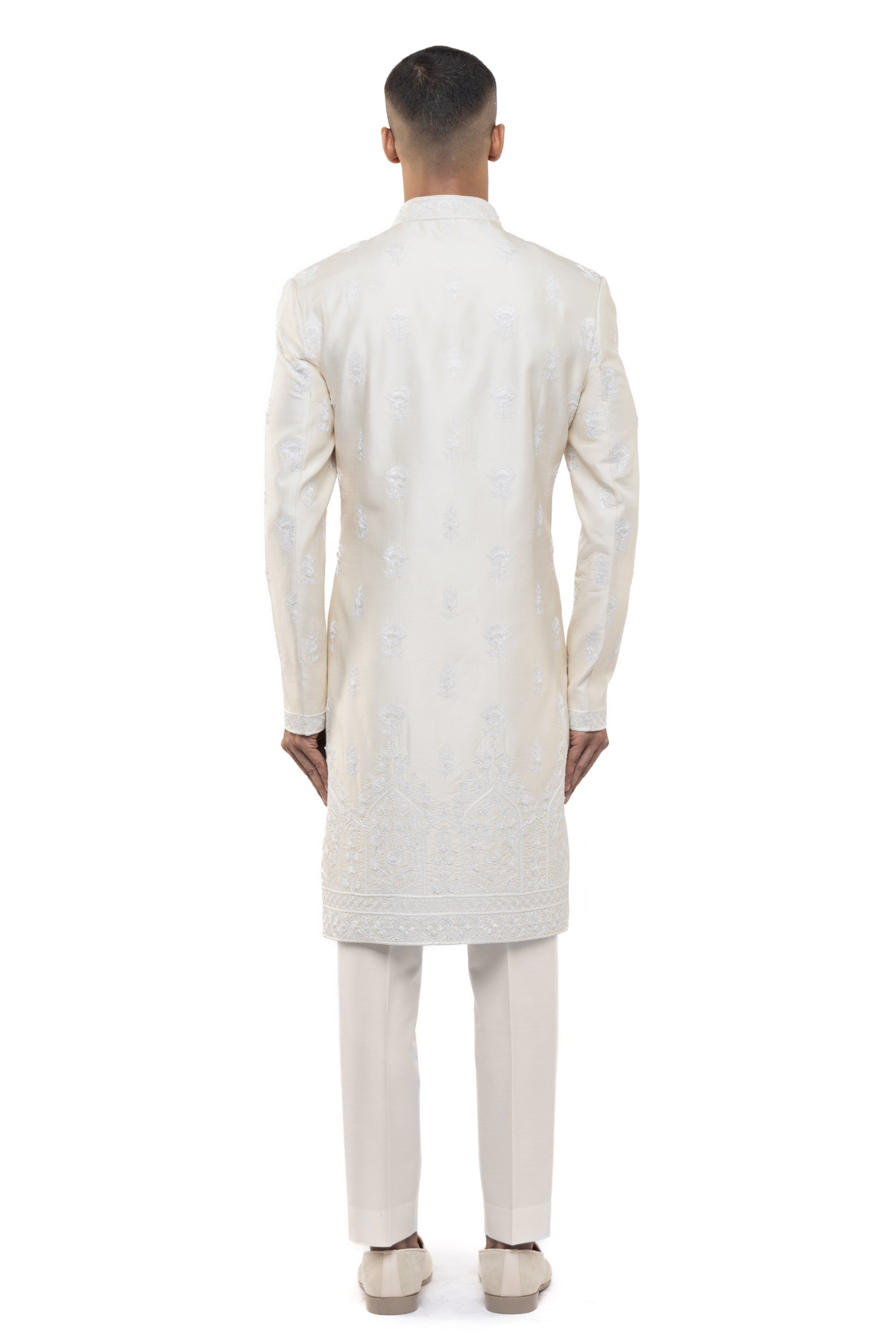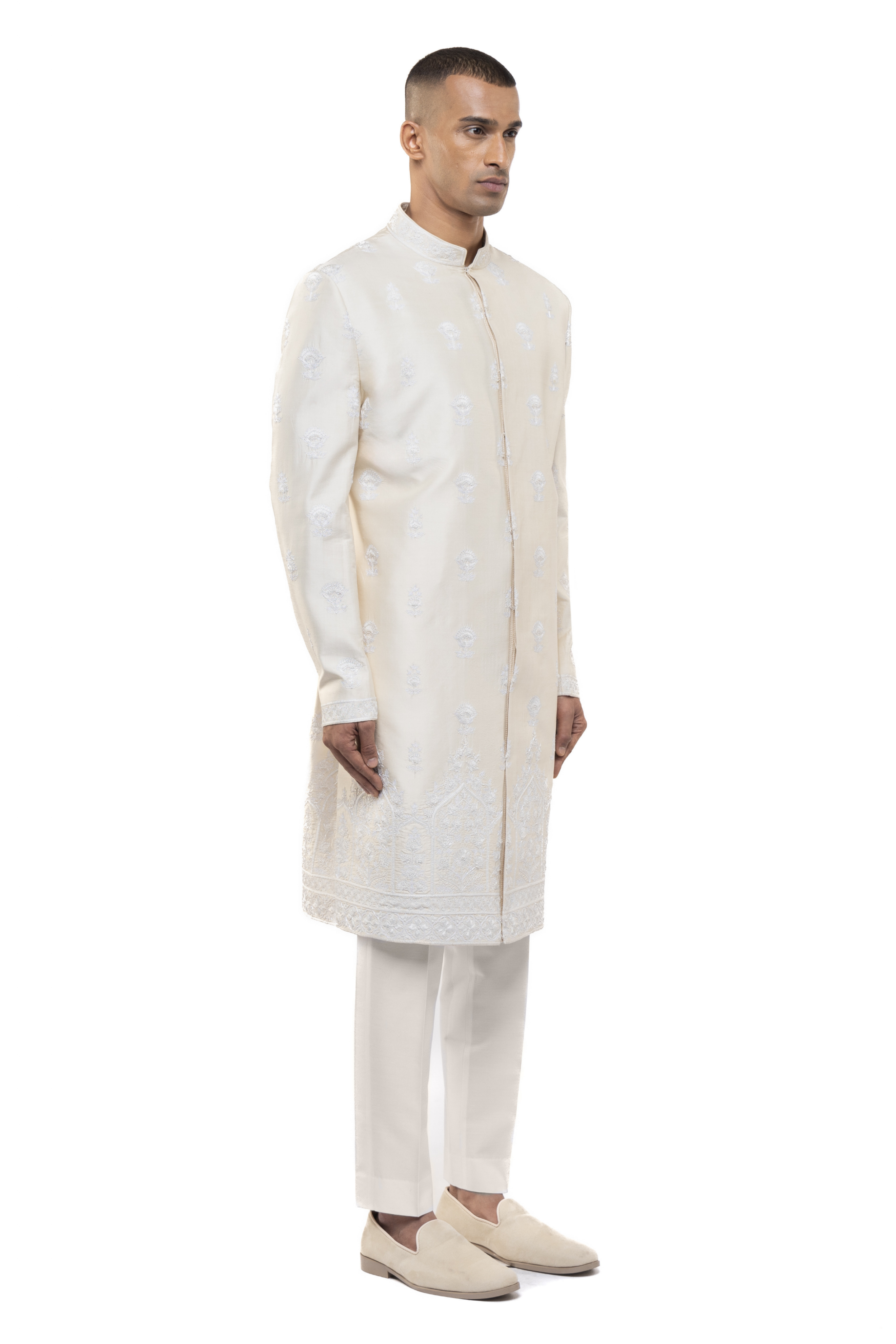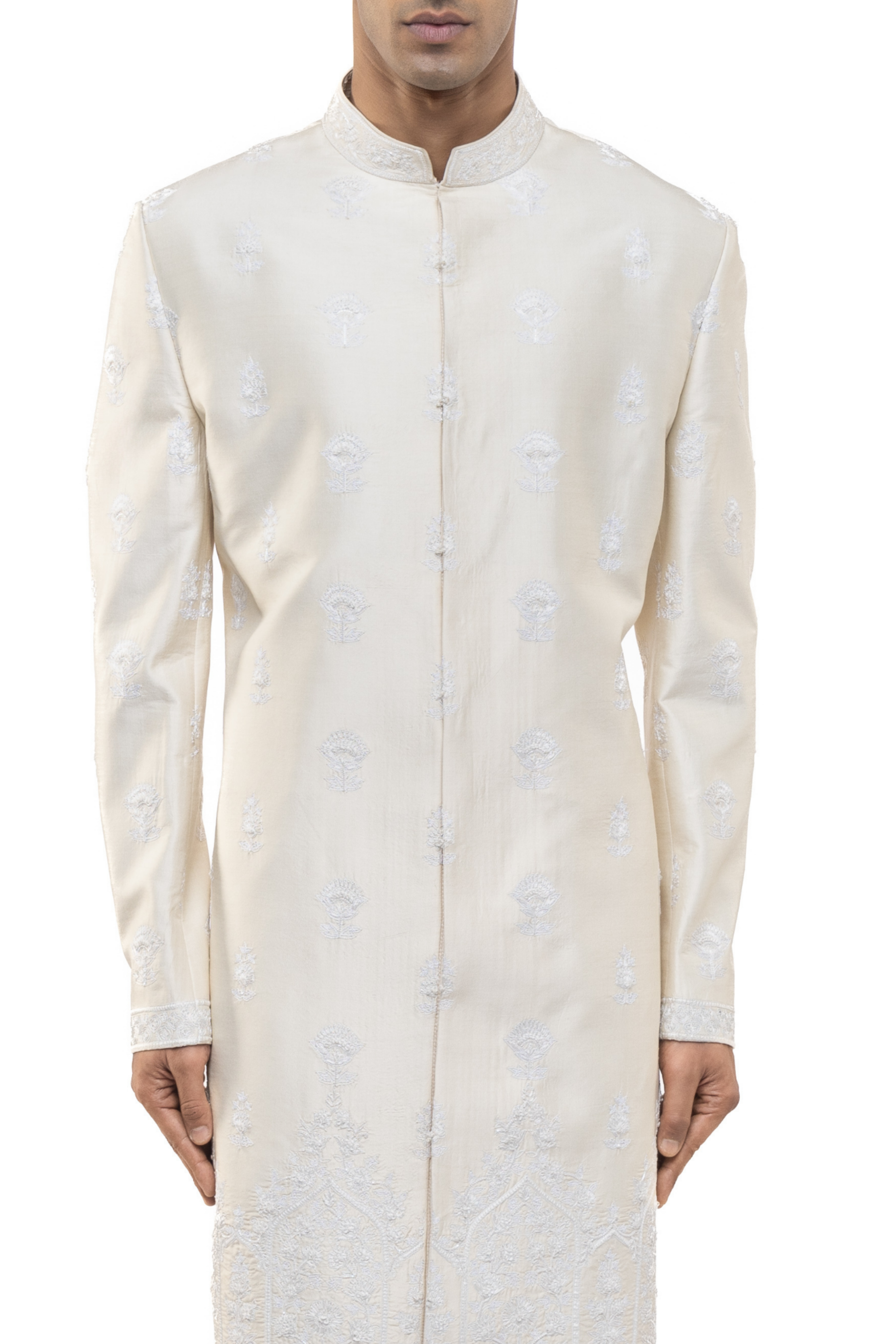 Featuring floral embroidery, this off-white and white silk sherwani combines tradition and style, ideal for weddings.