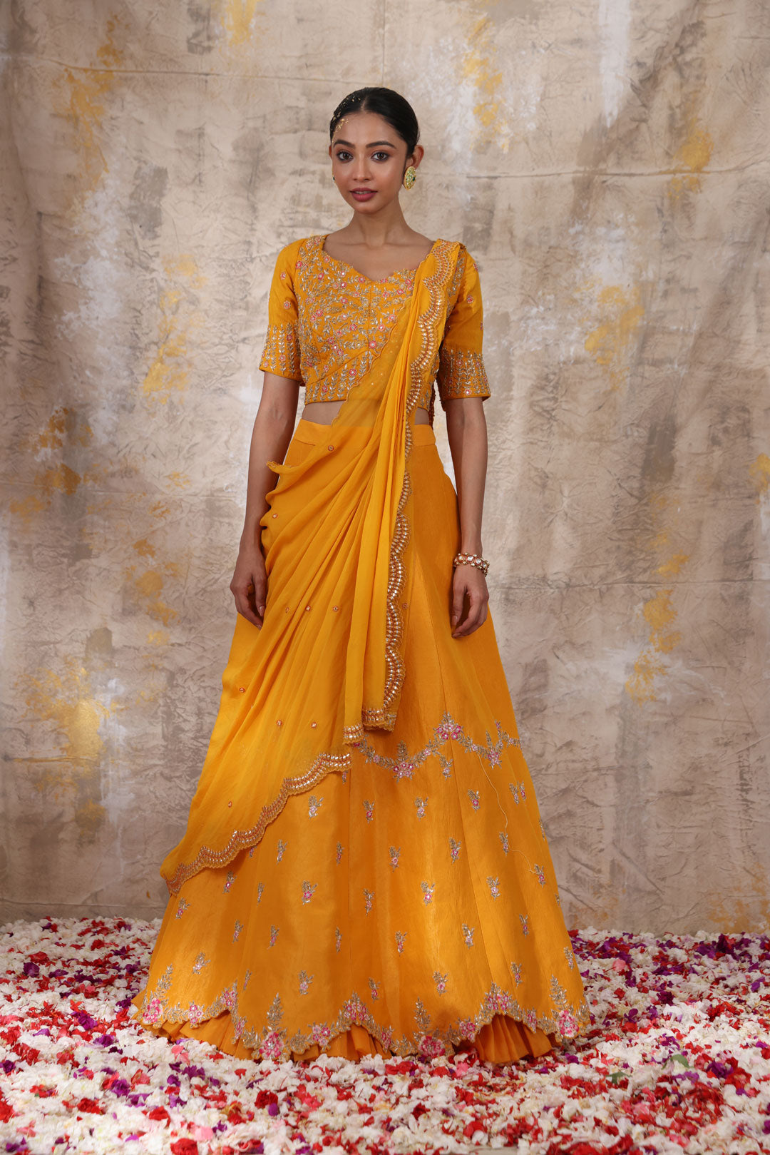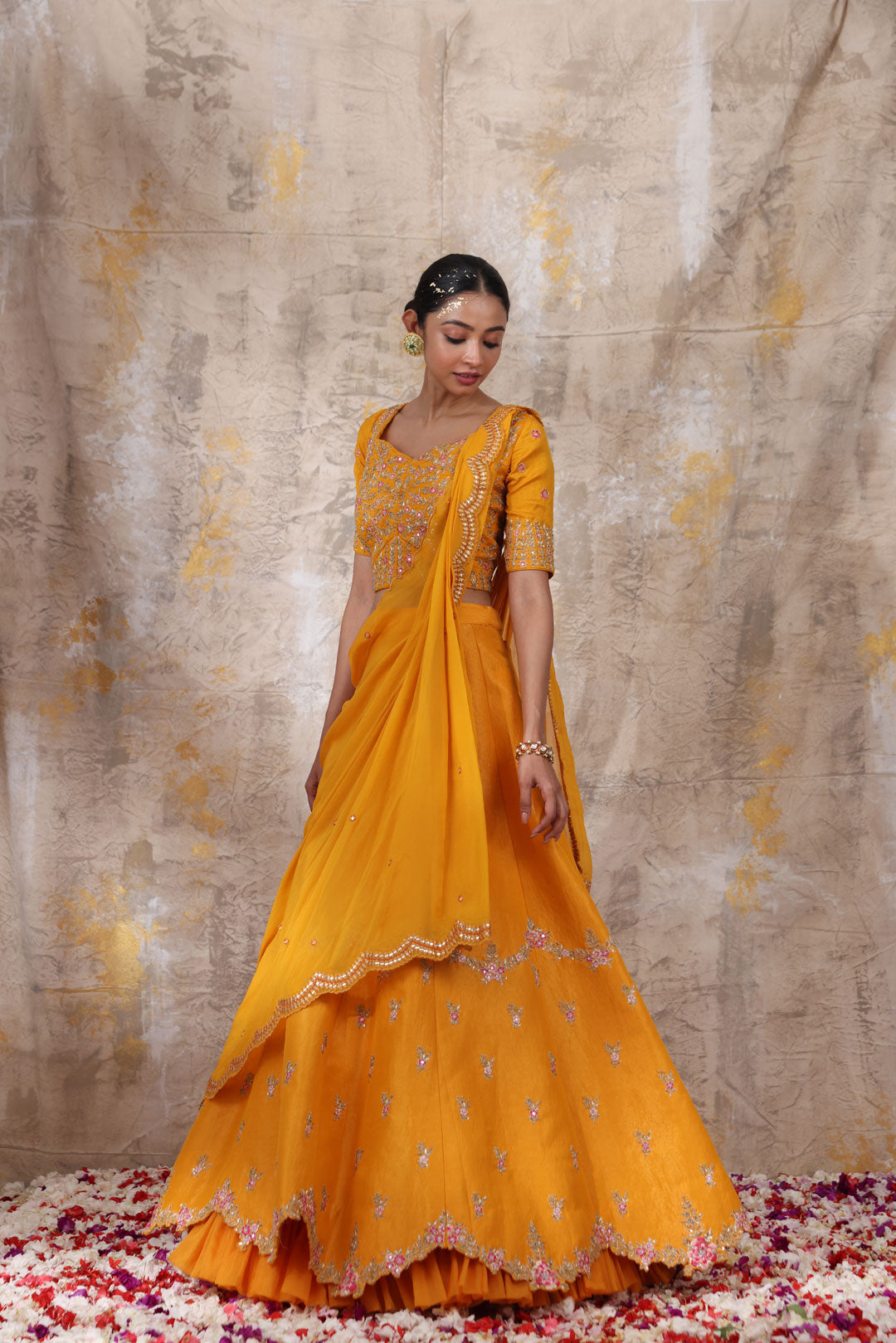 This radiant layered lehenga draws attention to its scallop hem cutwork and heavy handwork blouse. It centers a pink floral embroidery design and mirrorwork on the mustard yellow base. Blouse length is 15.5" from the shoulder and 9" in the neckline. Lehenga length is 44". **The color may slightly vary due to screen lighting.