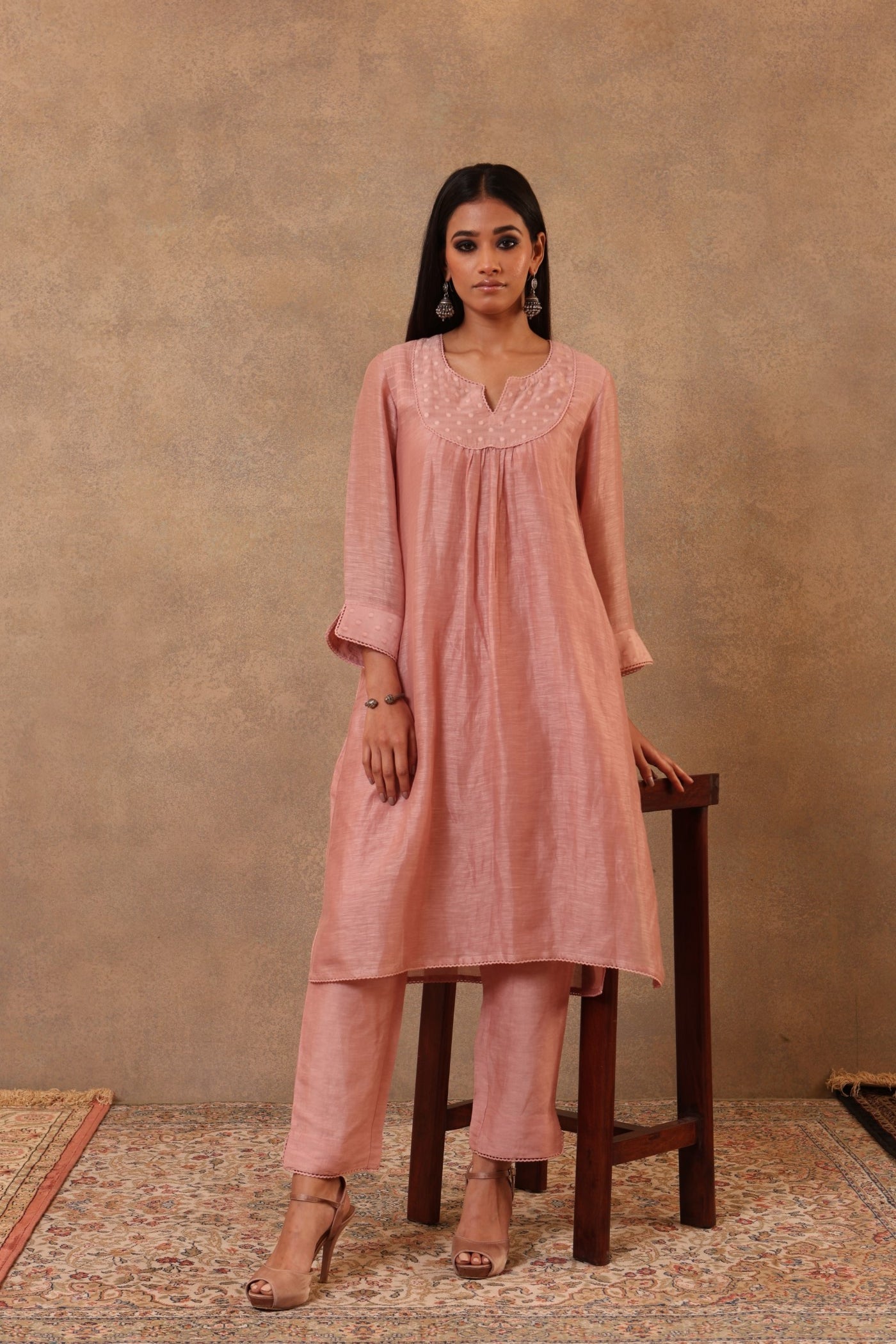 Old-Rose Co-Ord Set: Pure Silk-Linen Long Tunic Paired With Linen Blend (Viscose) Trousers