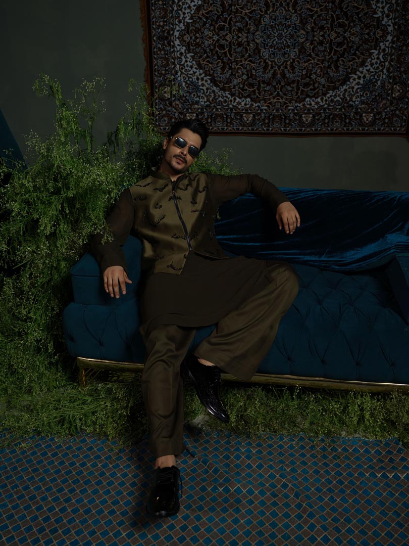 An olive green bundi adorned with black embroidered motifs arranged in a symmetrical pattern with statement zipper opening.