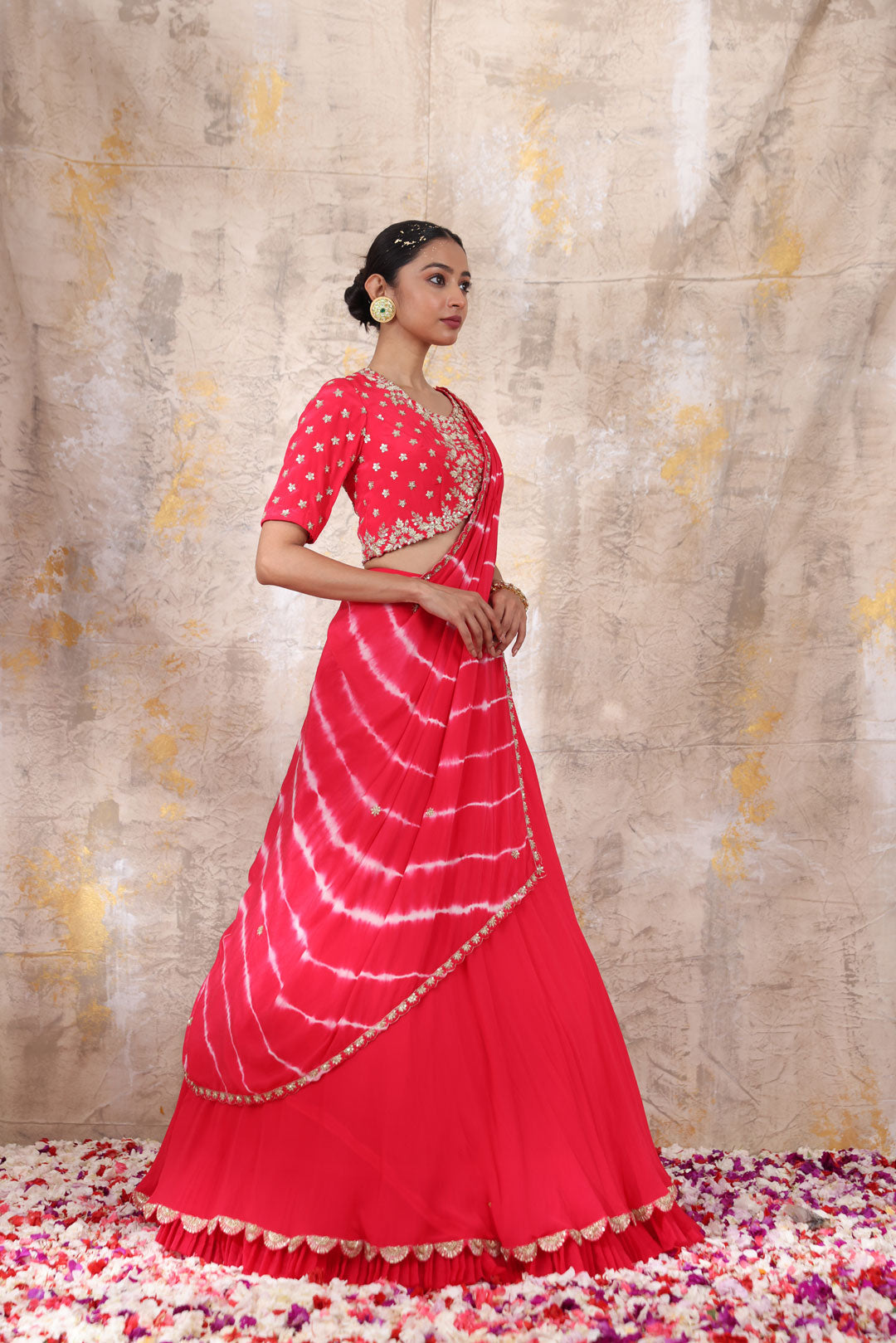 The leheriya dupatta calls attention to this solid ruby red lehenga, partnered with a booti zari-embroidered blouse. Blouse length is 13" from the shoulder and 7" from the neckline. Lehenga length is 44.5". **The color may slightly vary due to screen lighting.