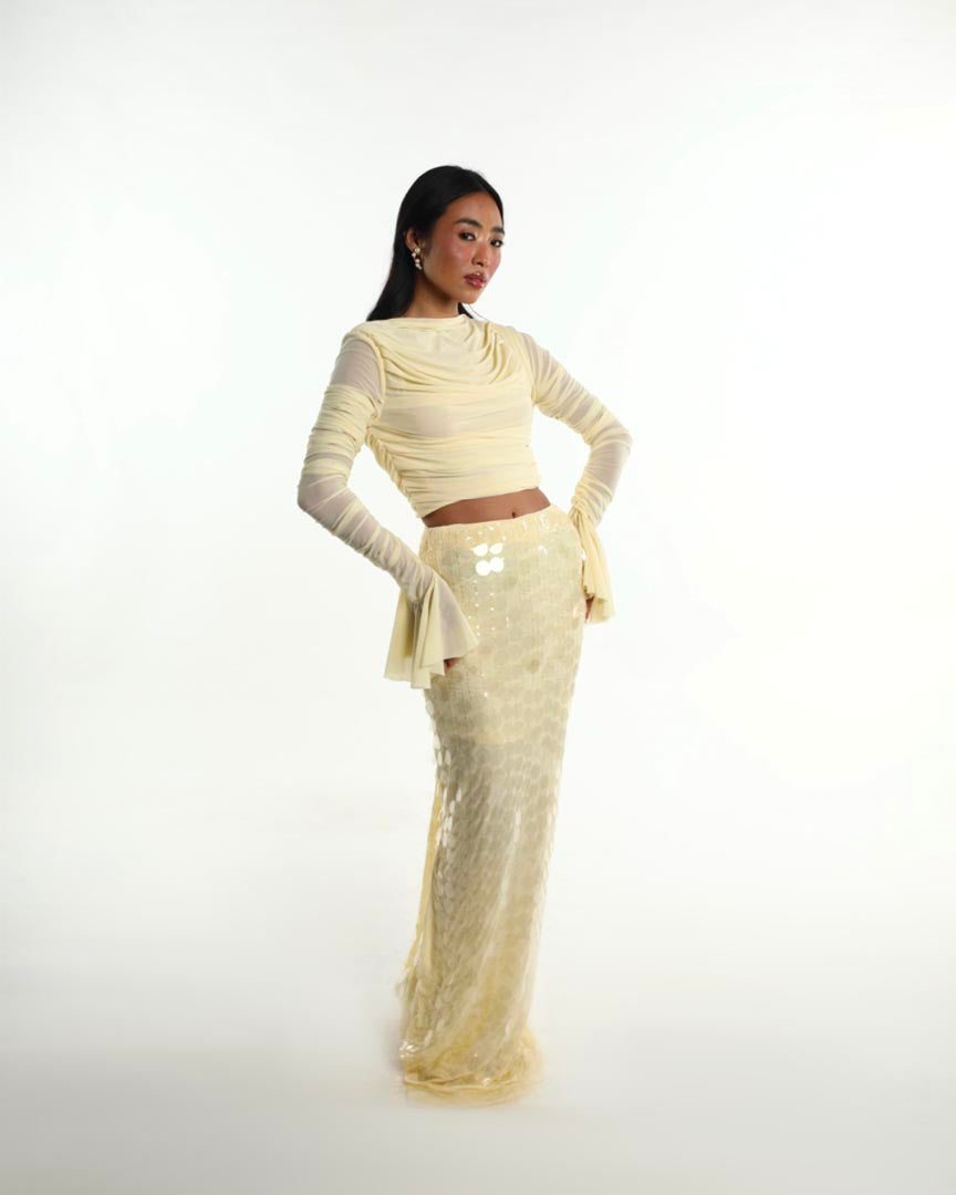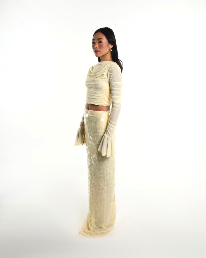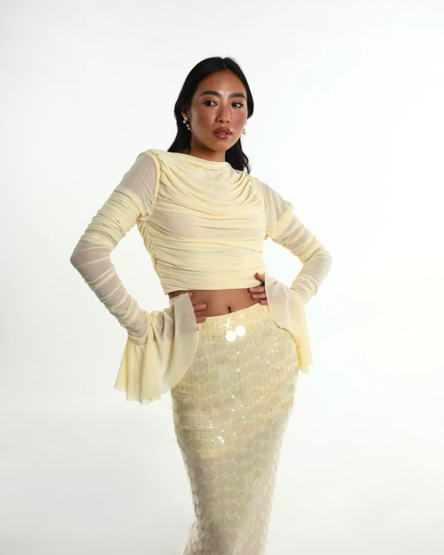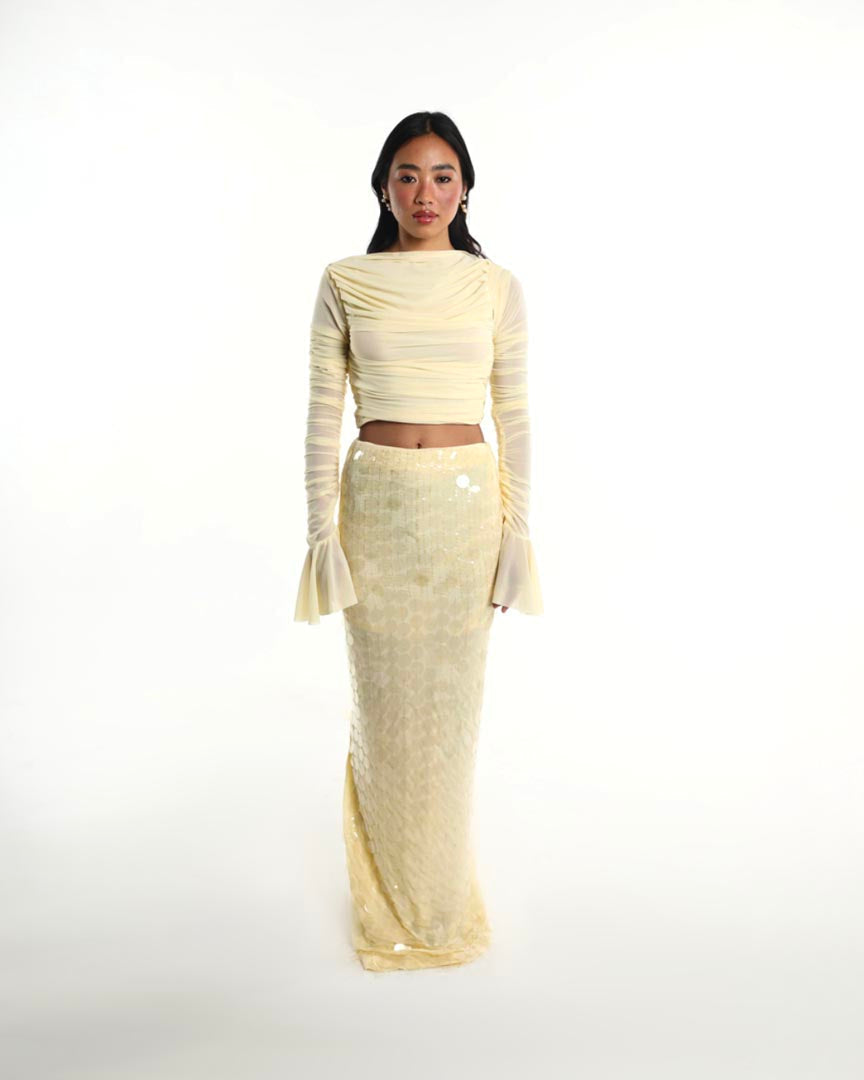 The ONDINA set pairs a softly ruched mesh crop top with draped bell sleeves and a figure-skimming sequin skirt that catches the light with every step. Done in a buttery pastel yellow, the look radiates warmth and sophistication, perfect for sunset celebrations, summer weddings, or your standout festive moment.