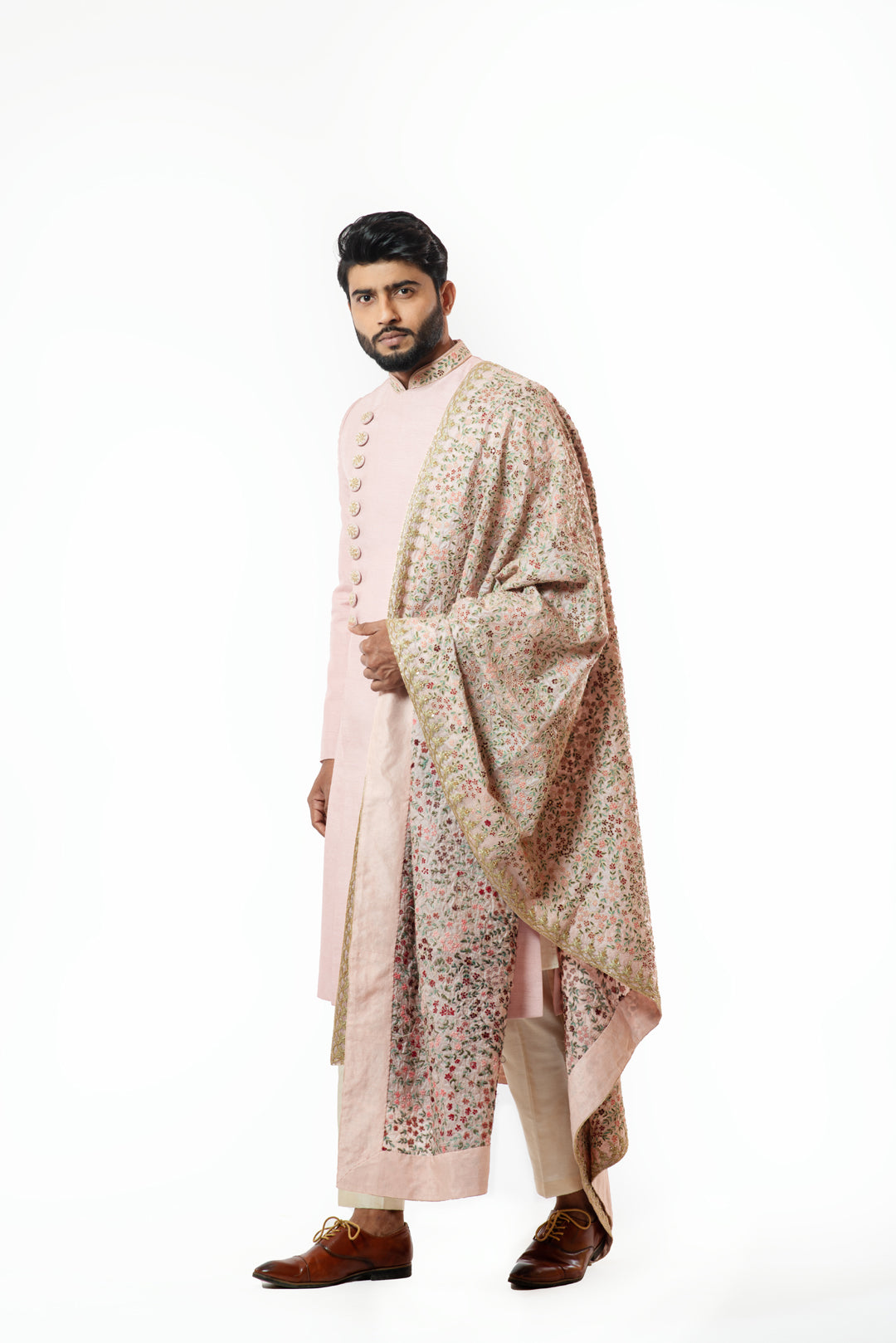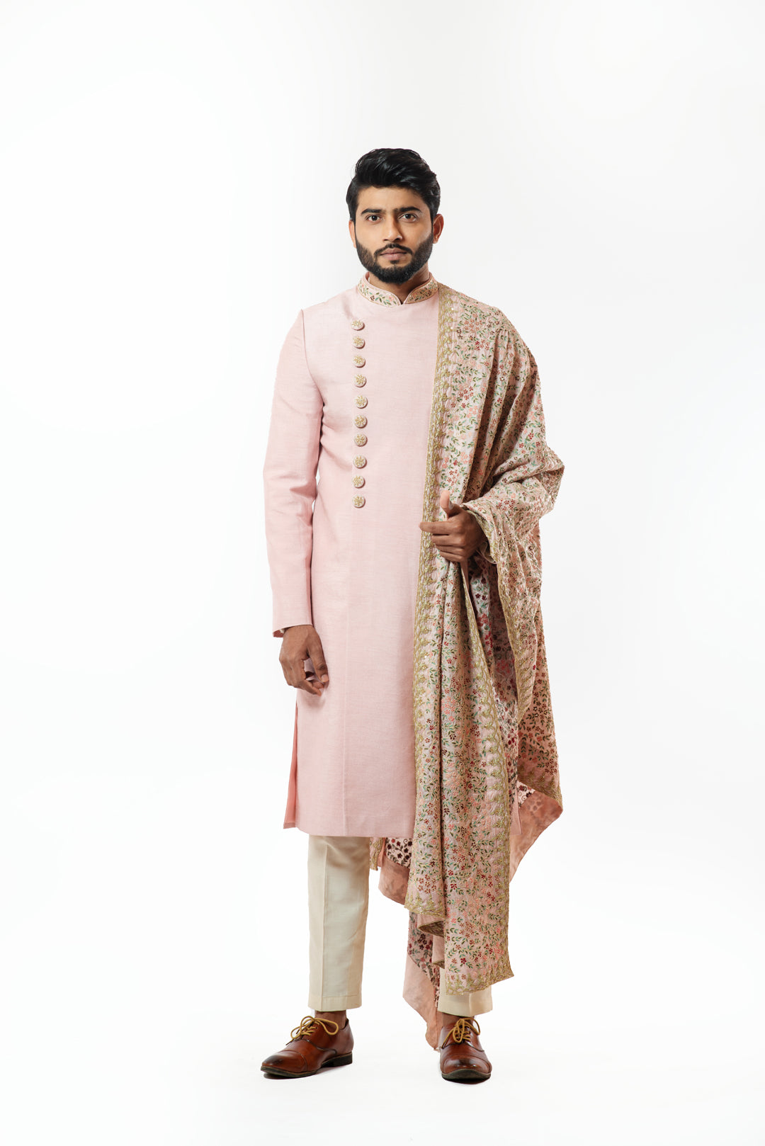 Shervani and stole- Onion Pink & kurta Pant Pajama- Cream |