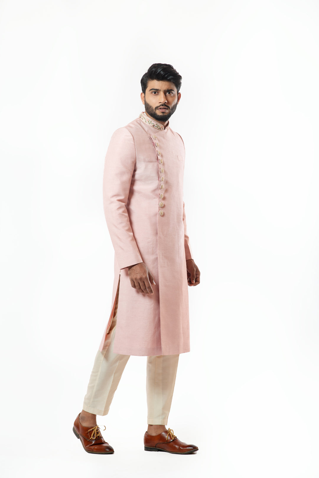 Onion pink kurta with embroidered collar band along with embellished buttons paired with pant pajama. Shervani length is 46". **The color may slightly vary due to screen lighting.