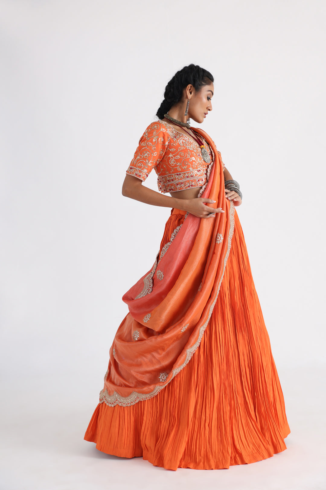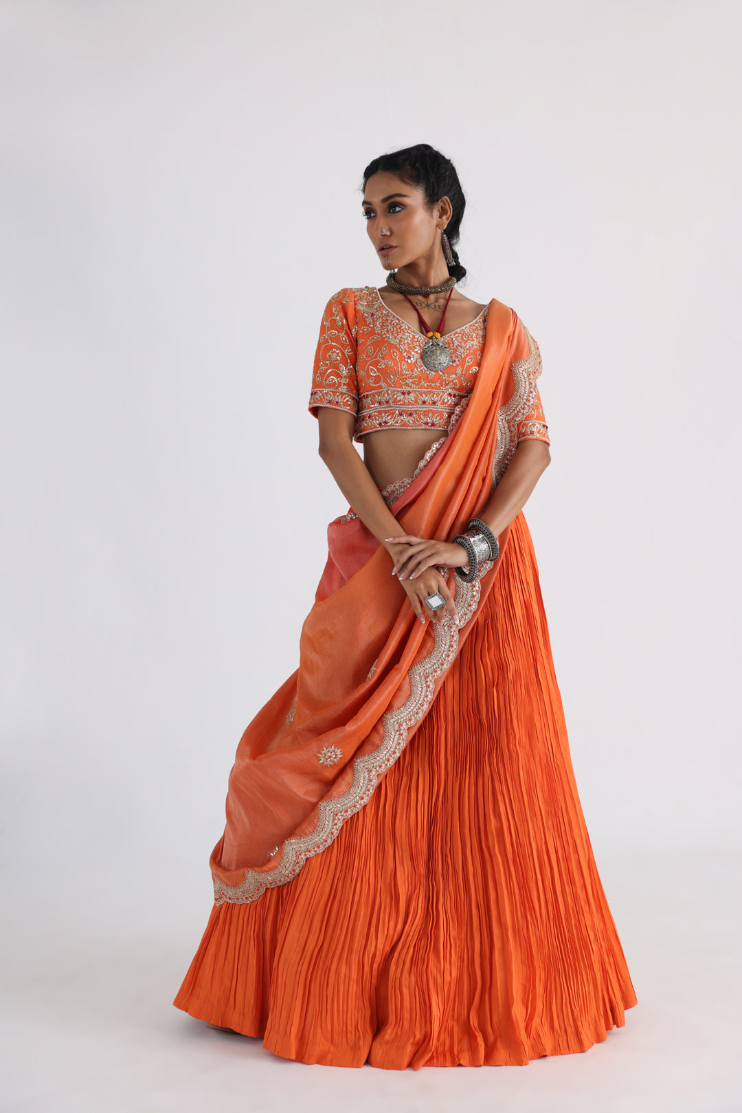 This luxurious style is exactly what you need. Make a statement with this tangerine lehenga set, featuring a micropleated skirt, paired with a heavily embroidered blouse with dabka and sequins. Maroon knots scatter across the border in a floral pattern, same on the dupatta border in orange.