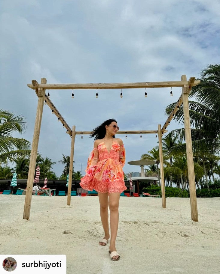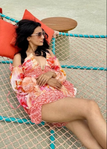 Featuring an orange pastoral mist and mushroom printed short dress in chiffon with a halter neck tie and frilled hem.