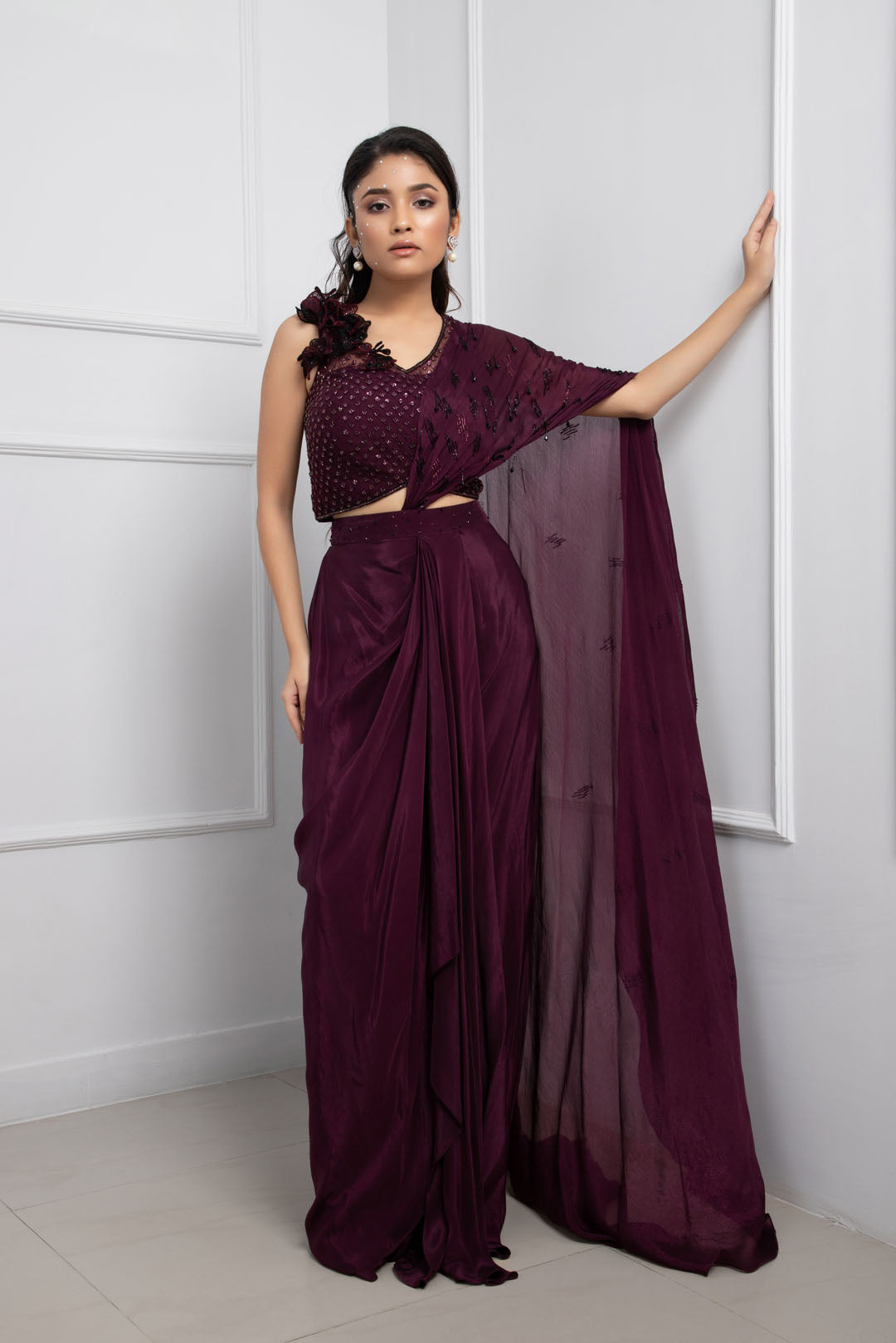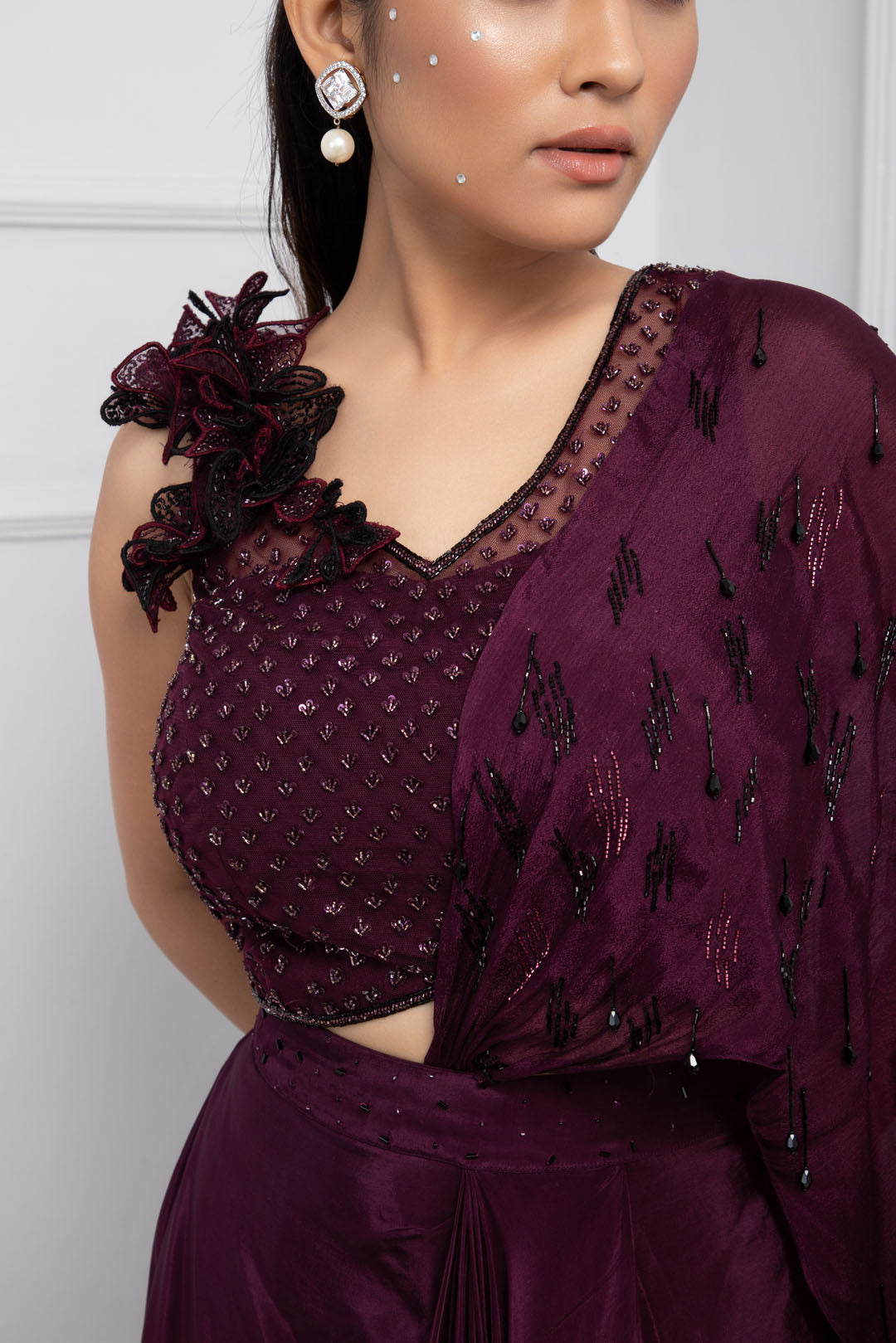 This drape saree set features a drape skirt with an attached palla and an embroidered blouse with 3D floral embroidery on the shoulder.