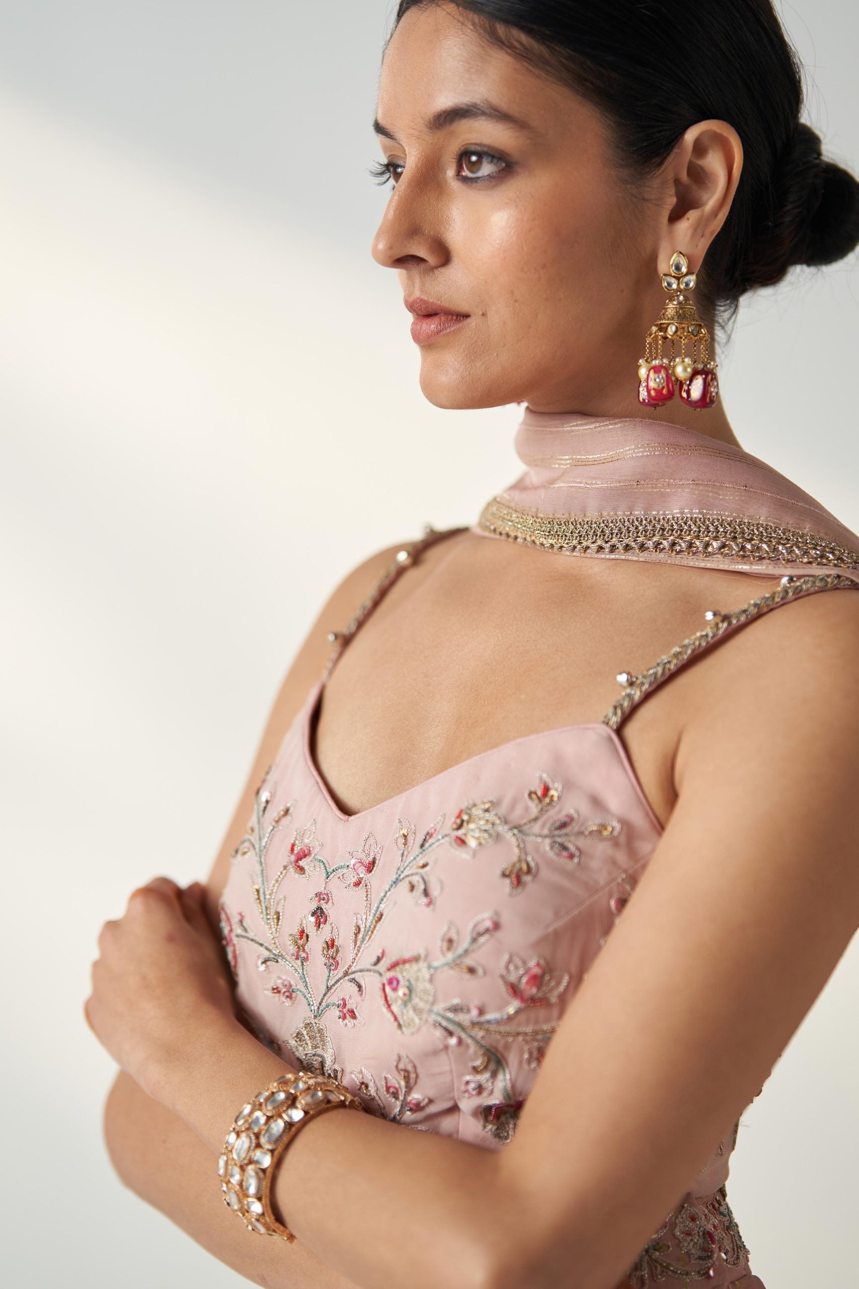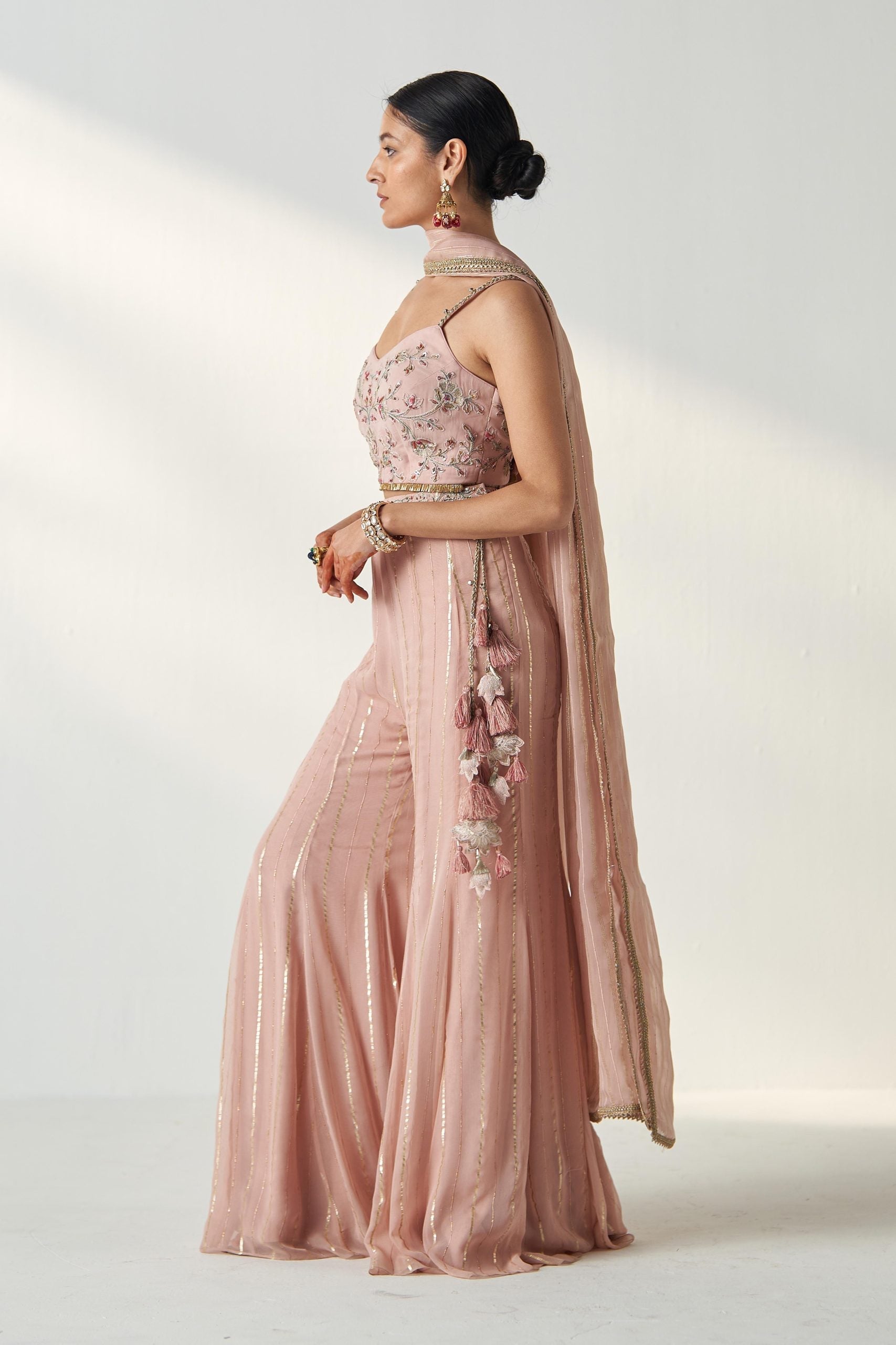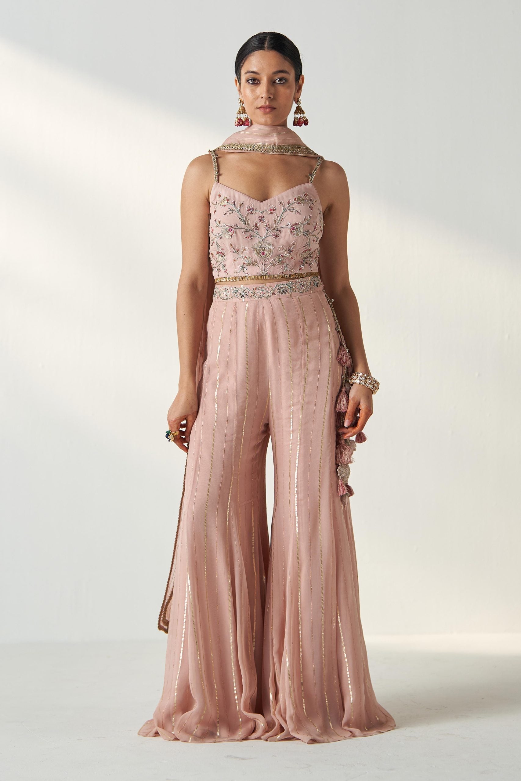 This set includes a bustier, sharara, and dupatta. The bustier features intricate embroidery, with straps detailed with braiding. The sharara has embroidery on the belt and adorned tassels. The dupatta is finished with gota and hand embroidery.