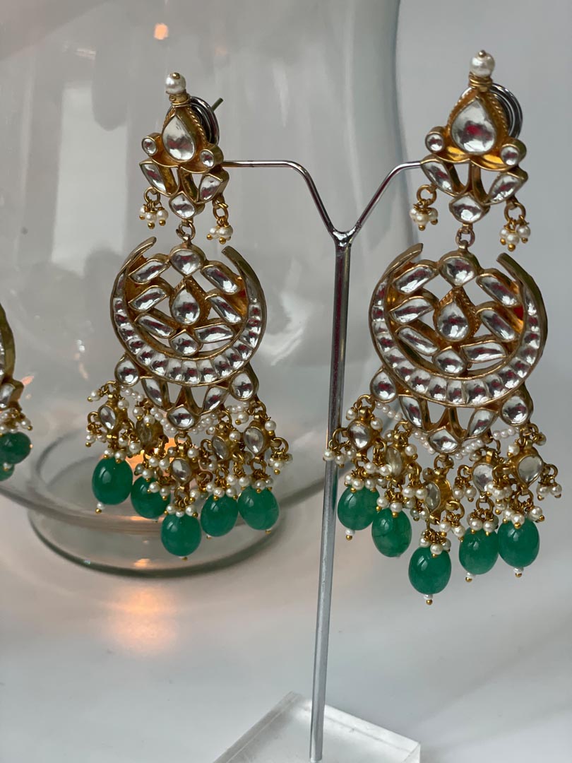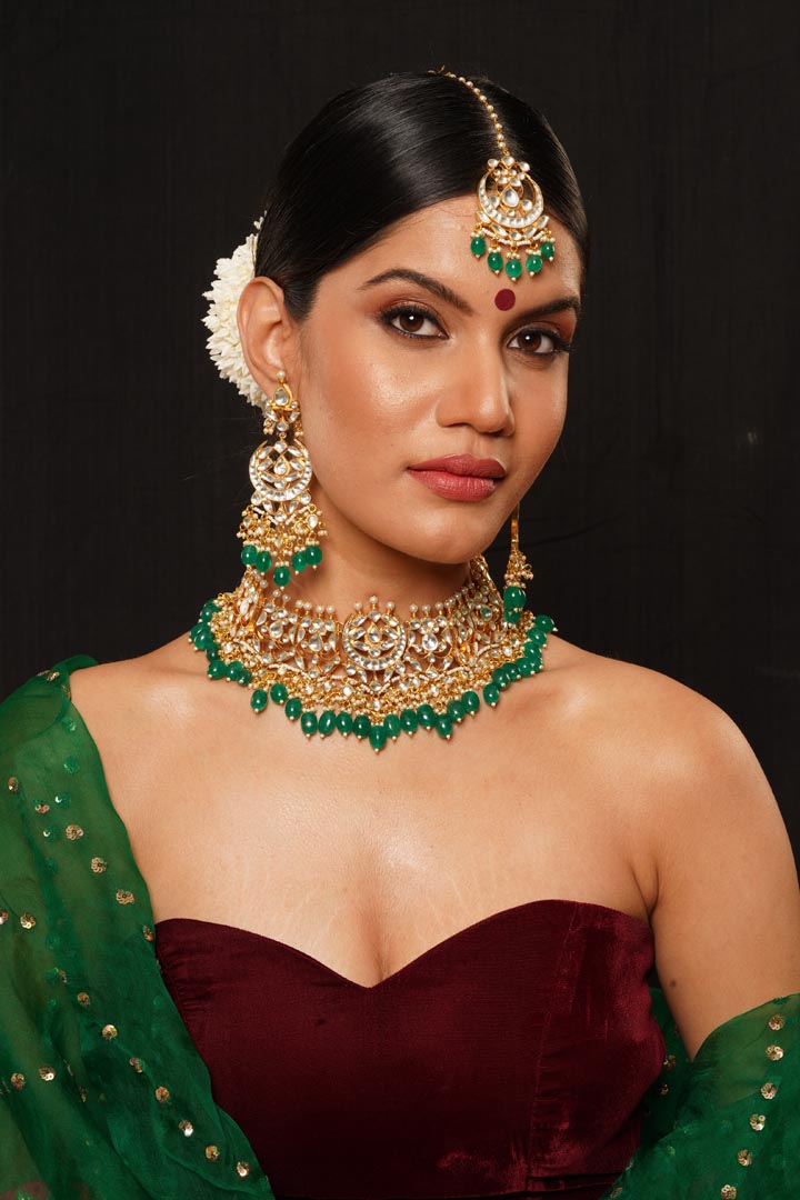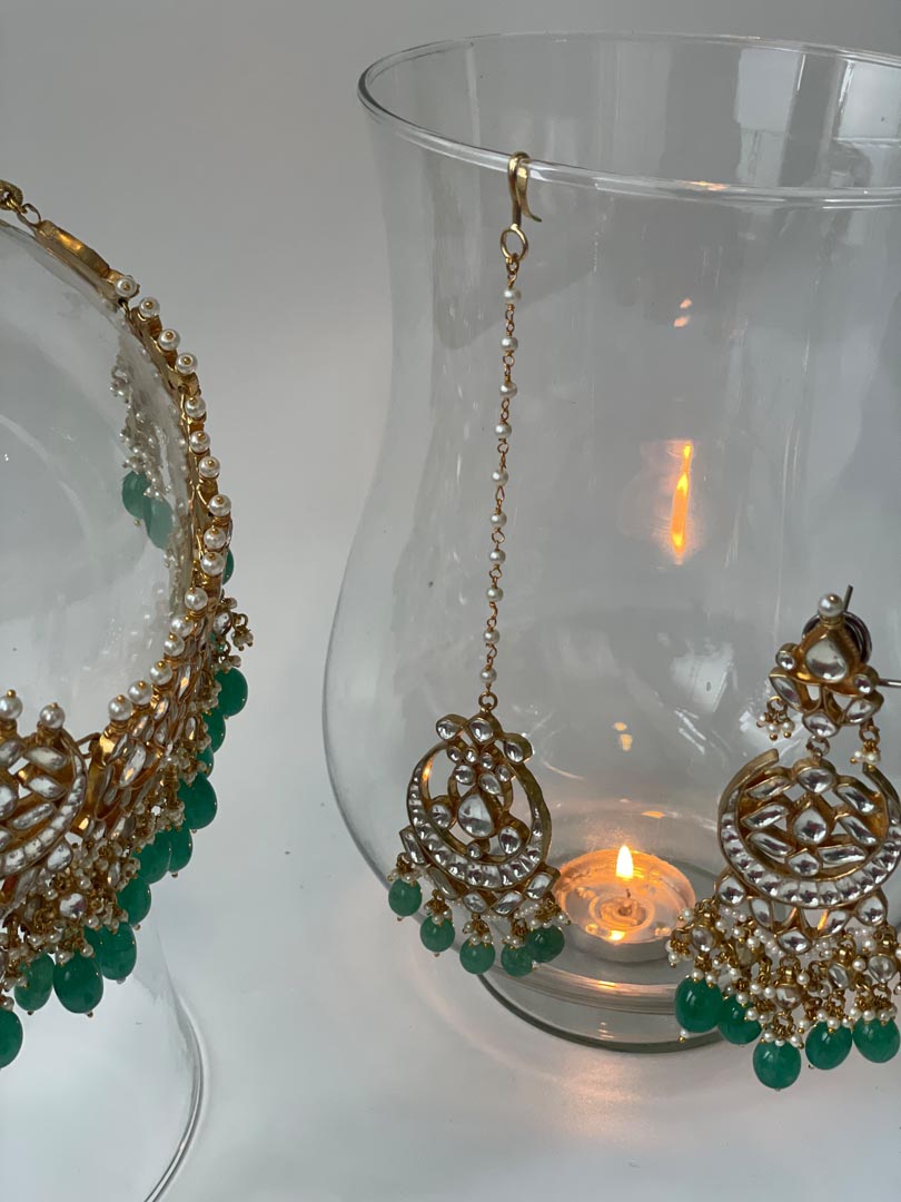 Pacchi Kundan Necklace Set with Green Beads , Necklace L :3, W: 13