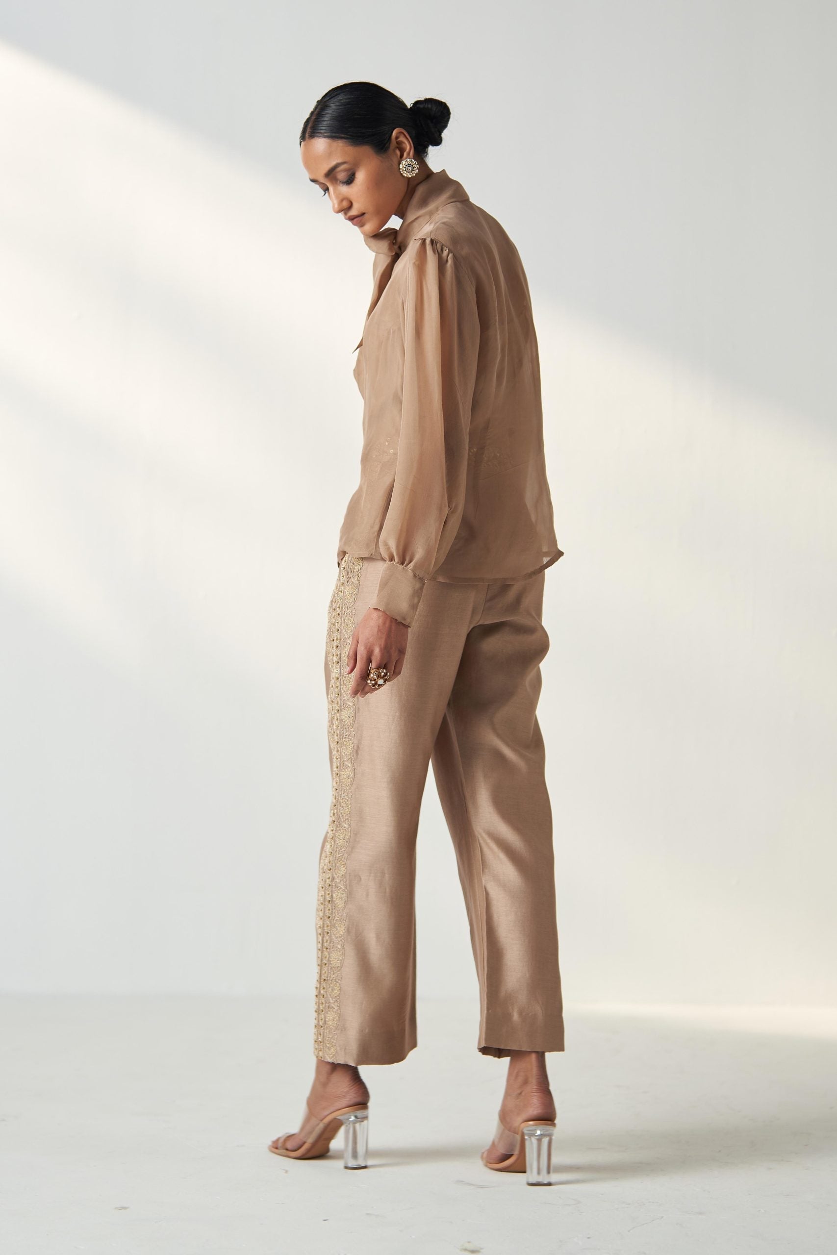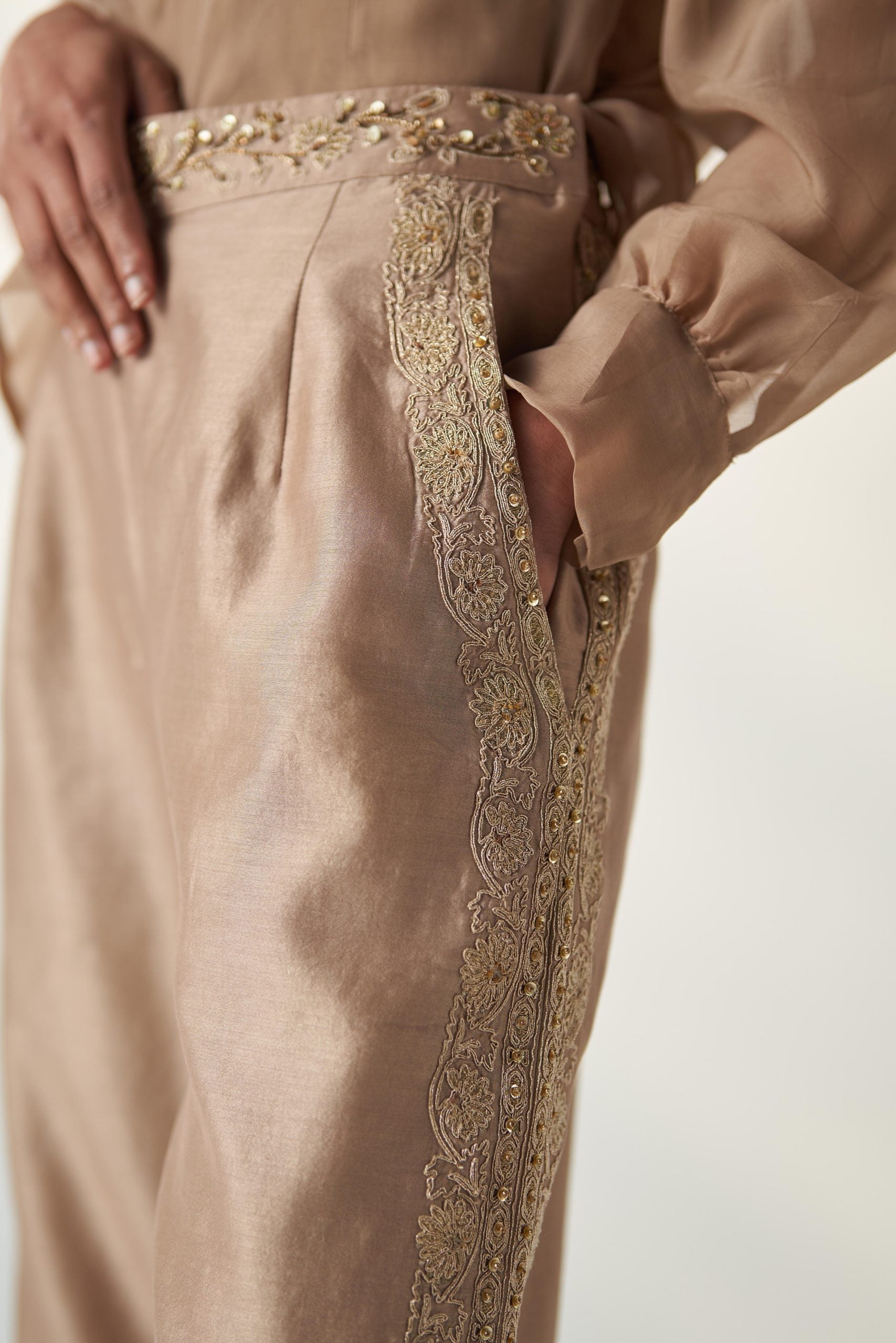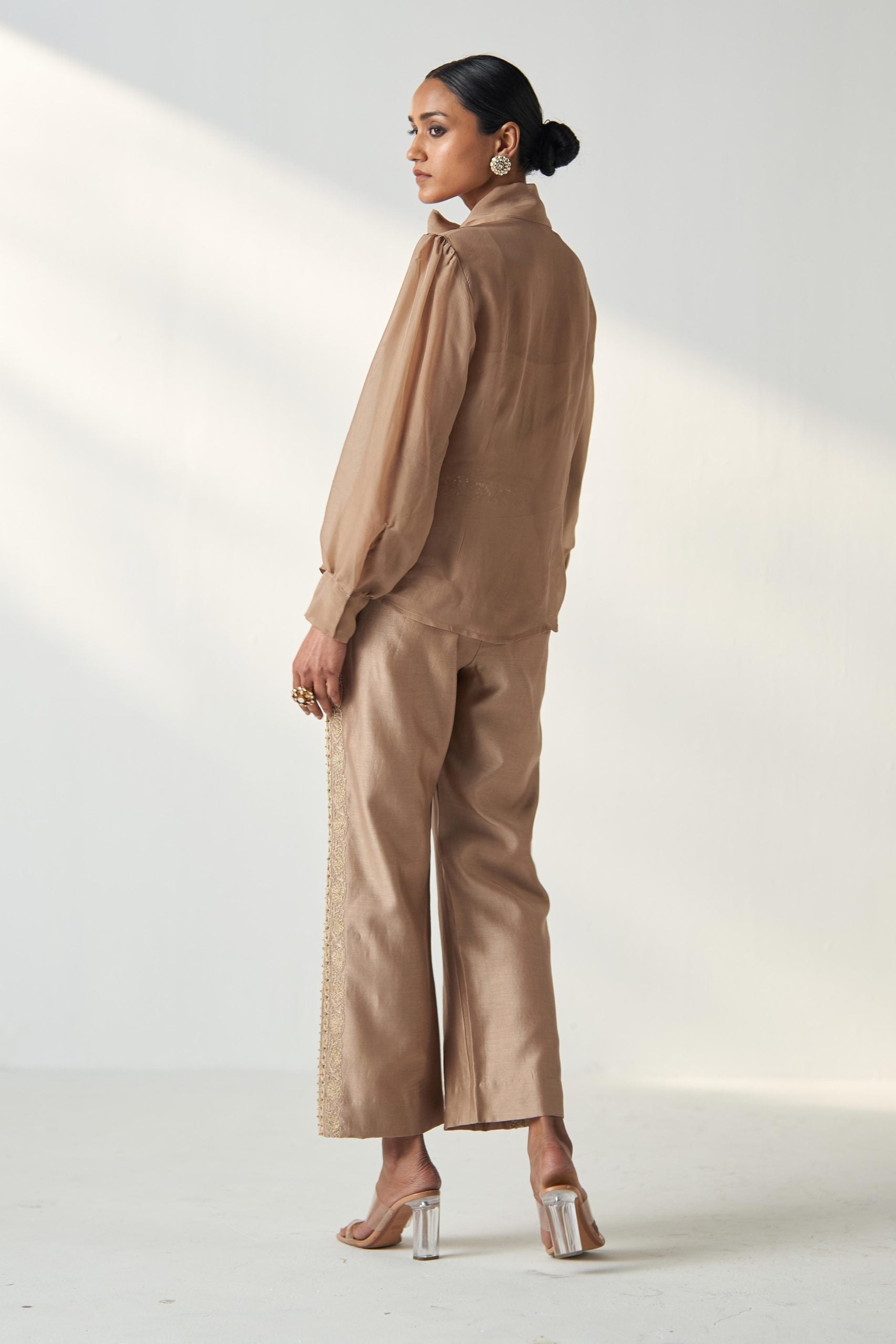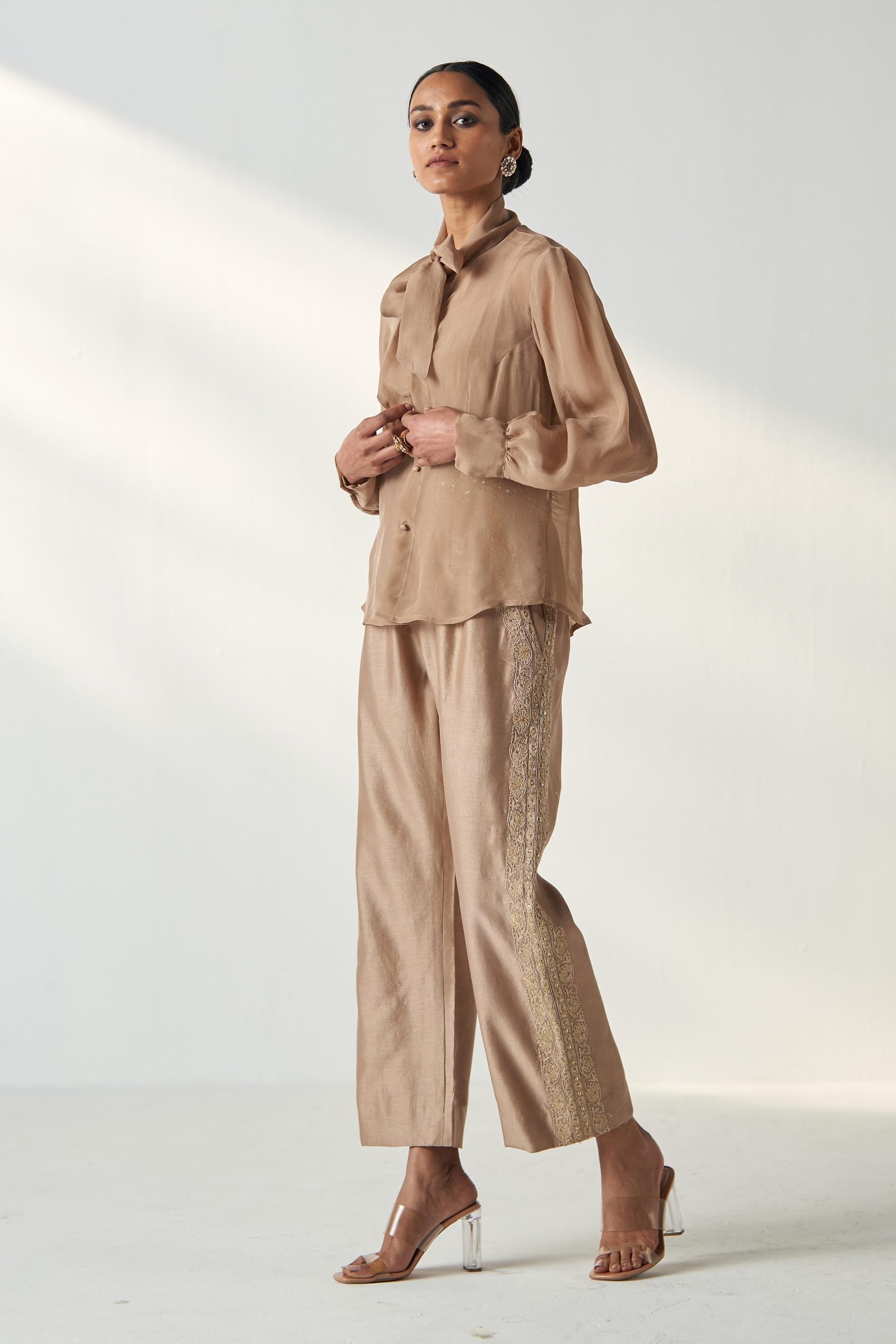 This set includes a shirt paired with pants. The shirt features a bow tied on the collar, while the pants have detailed embroidery on waist band and side panels