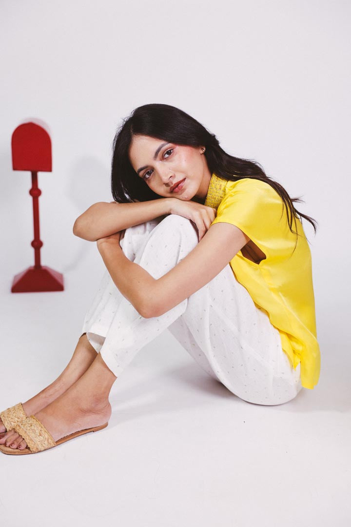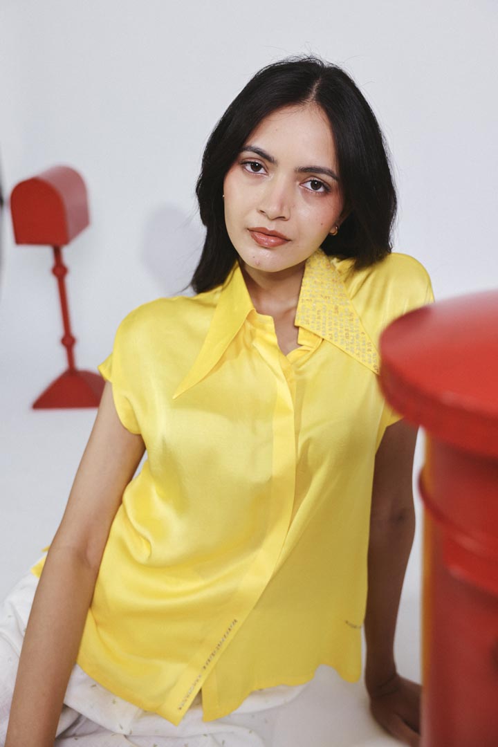 || this buttery satin shirt brings the shine, but the real charms in the details: tiny Xs hand-embroidered in zari on the placket and one side of the collar. a whisper of edge.