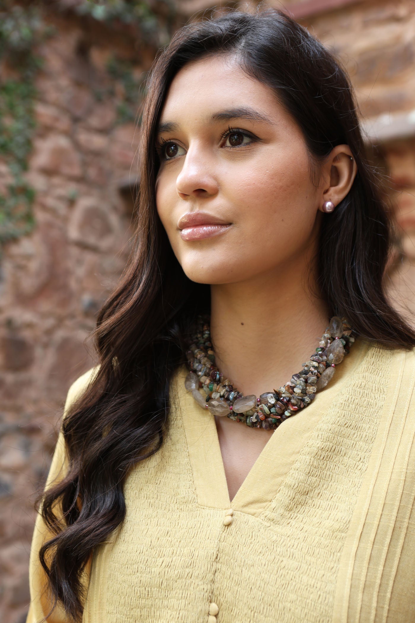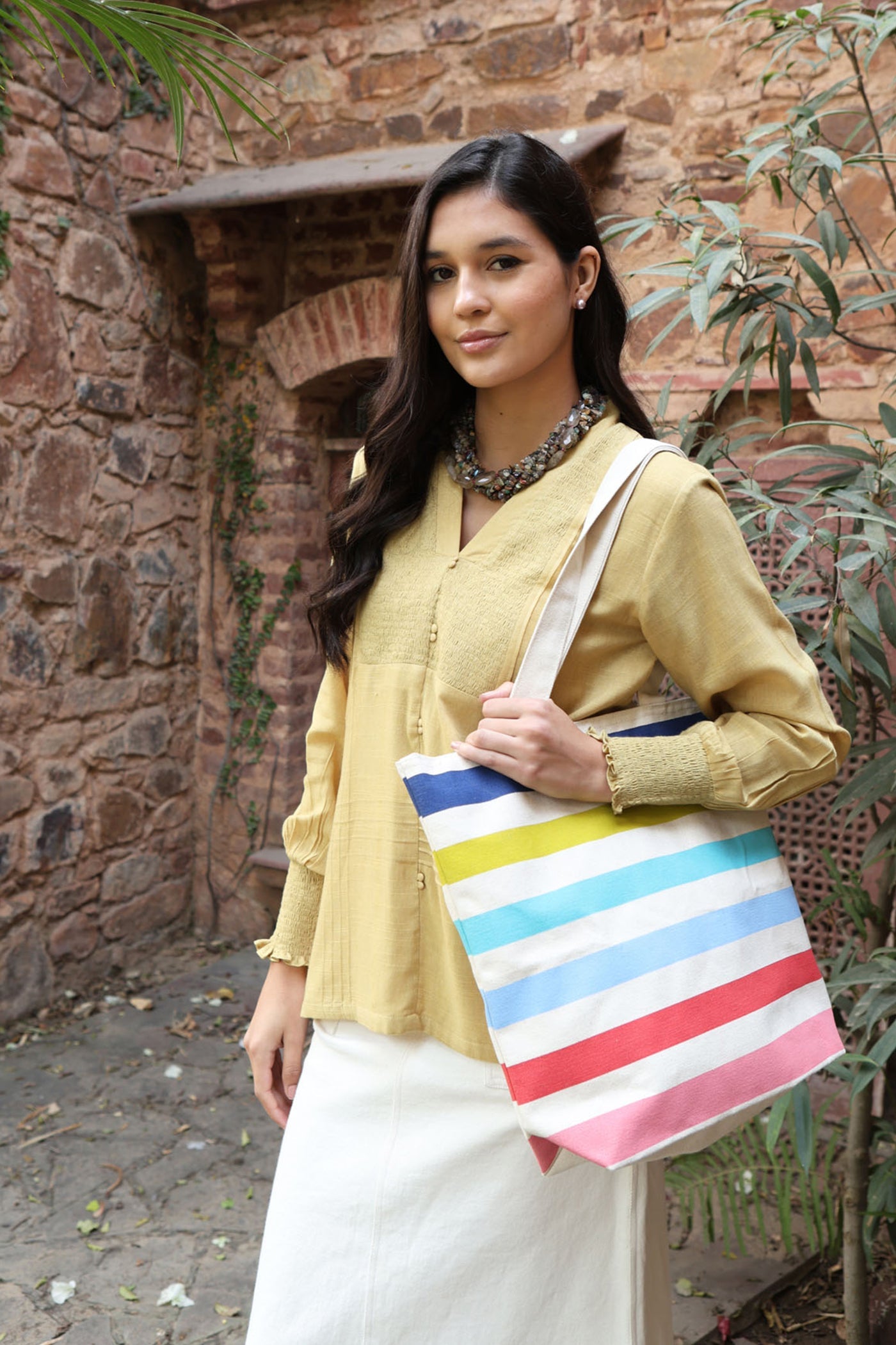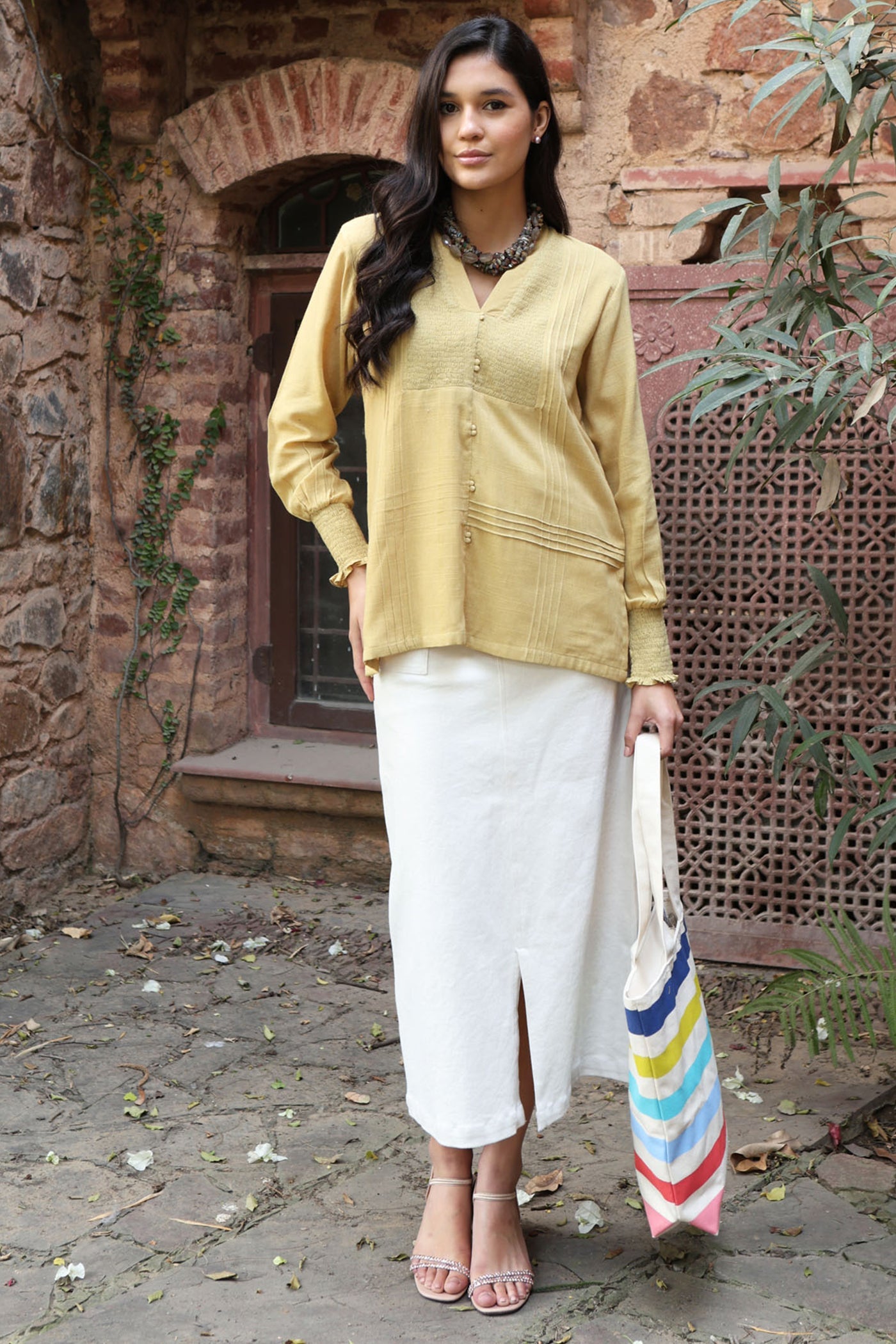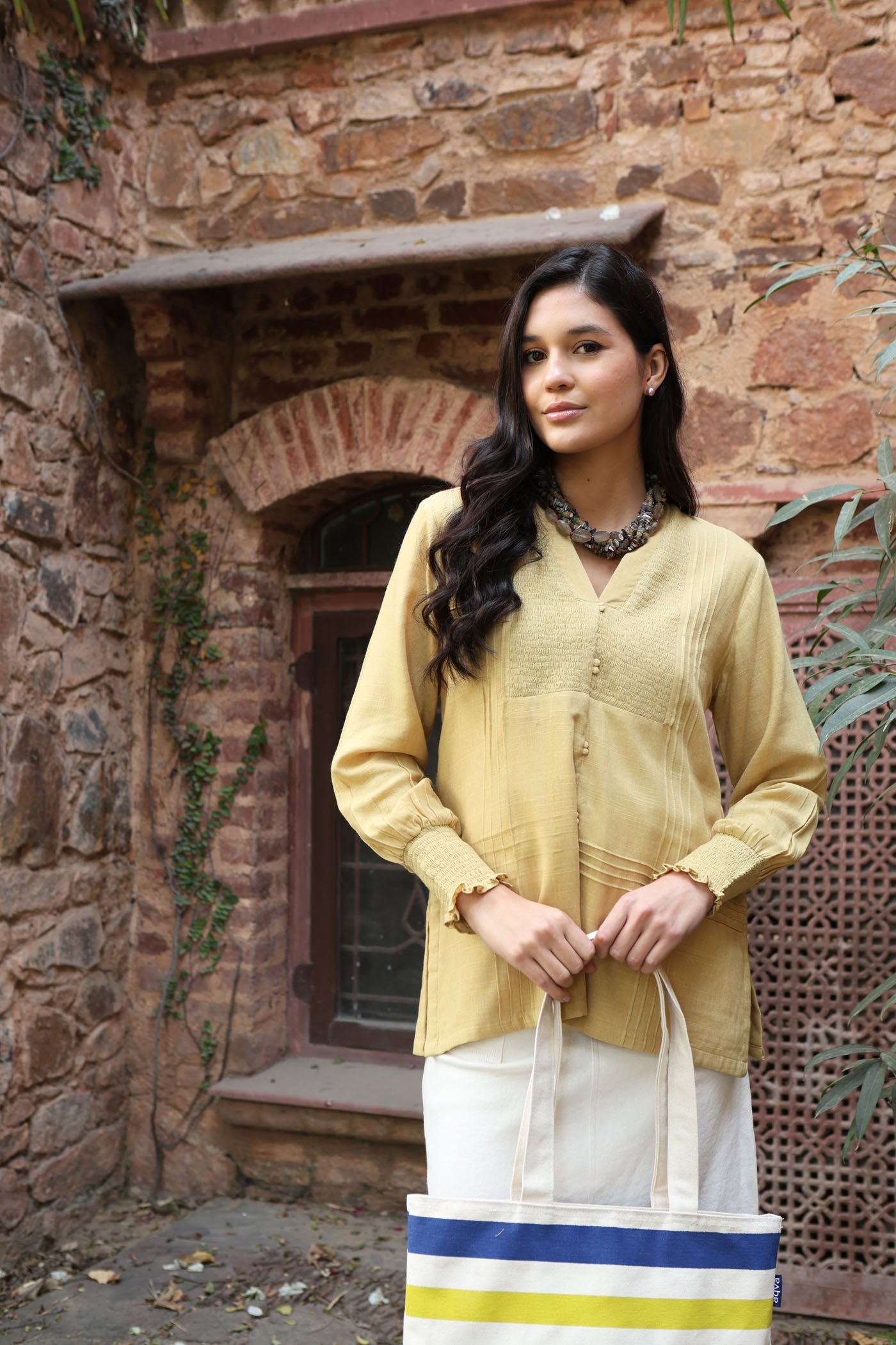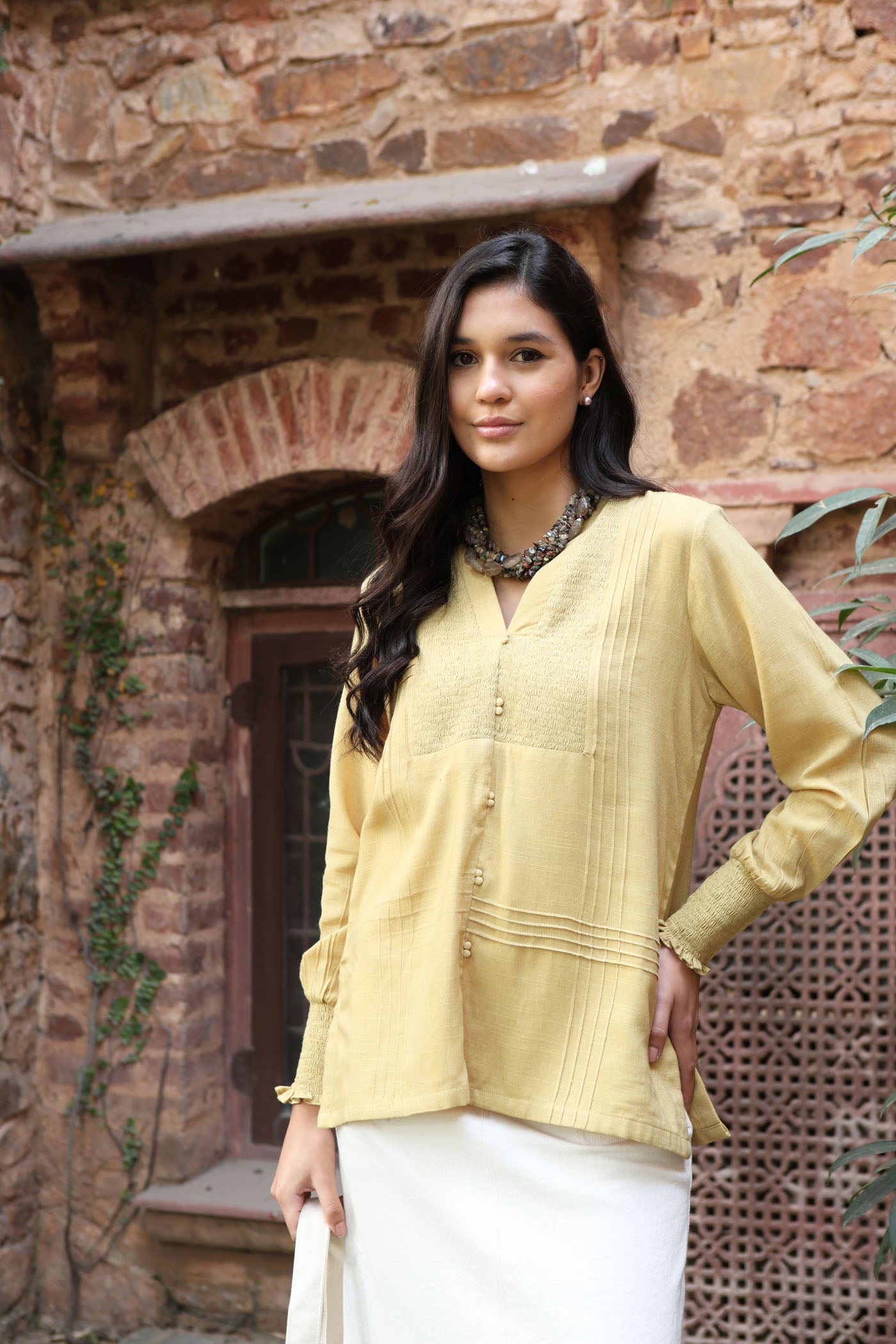 This Is A Pampas-Green Pure Cotton-Slub Short Tunic With A Smocked Yoke And Pintucks. The Tunic Has A V-Shape Band Collar. The Tunic Has Been Lined With Pure Cotton For Added Comfort.