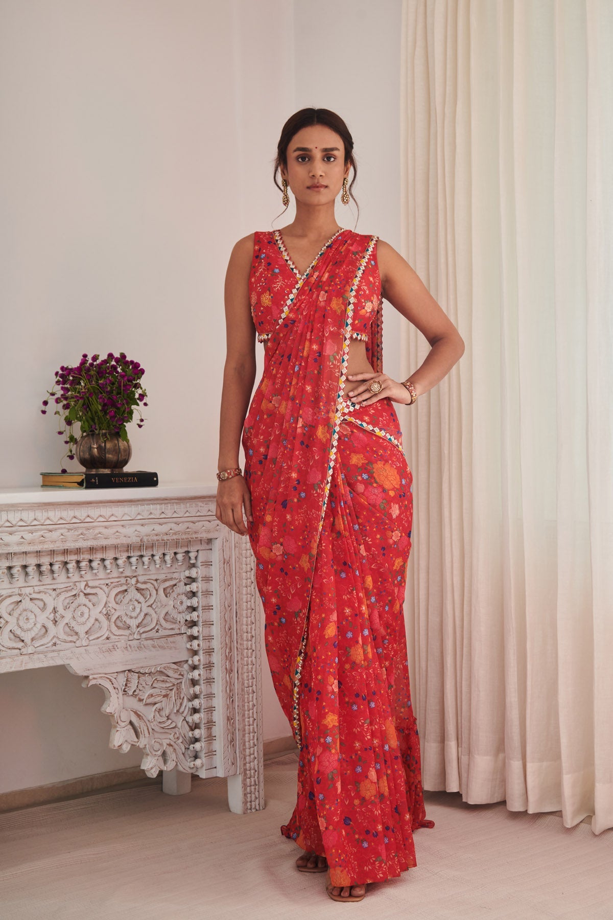 Bright red floral printed pre-stitched saree with rhombus thread and pipe embroidery work with multicoloured thread and sequence details , comes with cut sleeves blouse
