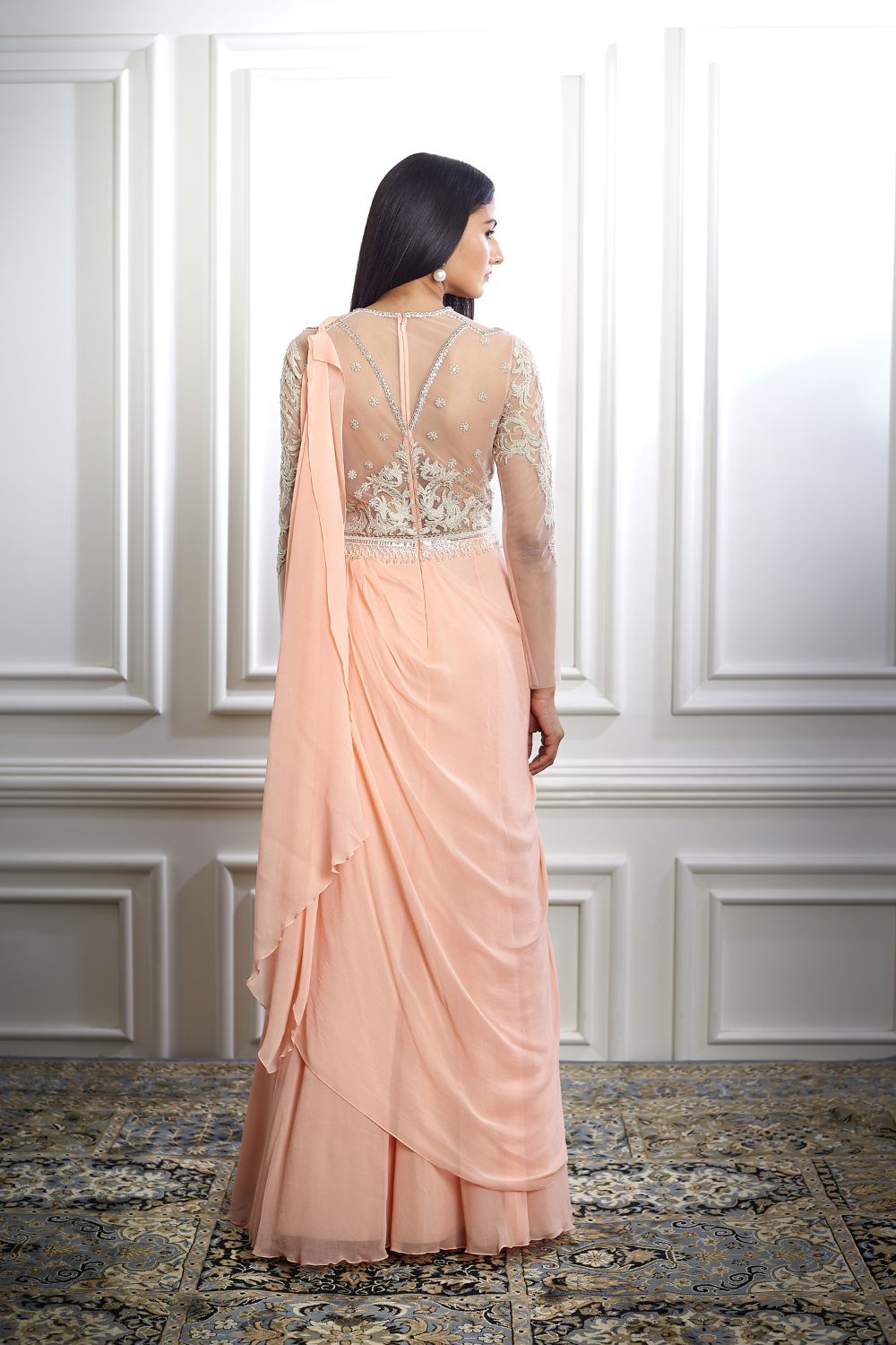 Peach drape dori embroidered saree with sequin and pearl embellishment. Crafted from a blend of viscose georgette and net fabrics, this saree is a luxurious choice that drapes beautifully, ensuring you feel graceful and comfortable throughout your special occasion.