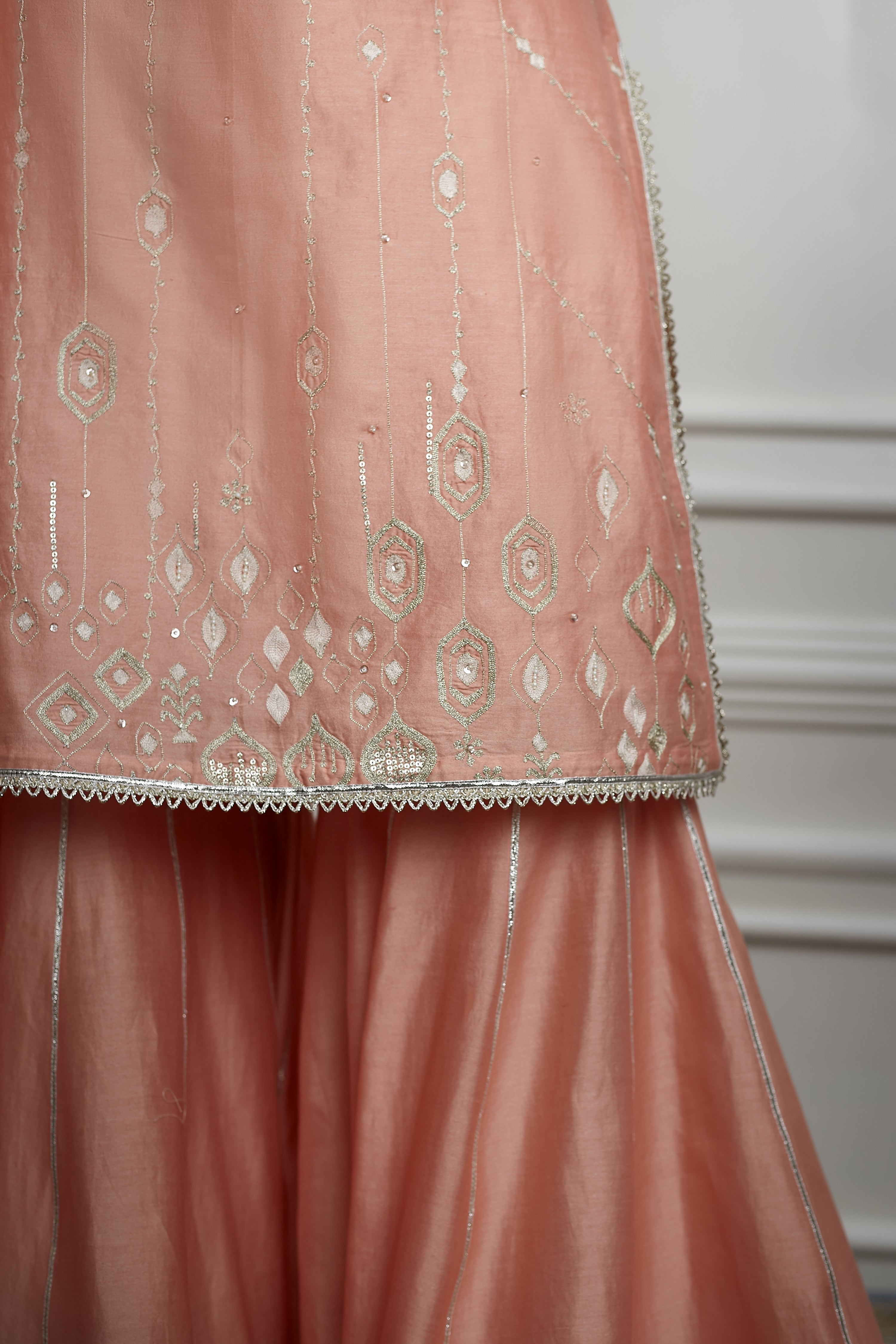 STYLING: Embrace the epitome of grace and glamour in this Peach Embellished Kurta Sharara Set, ideal for both formal gatherings and special occasions.