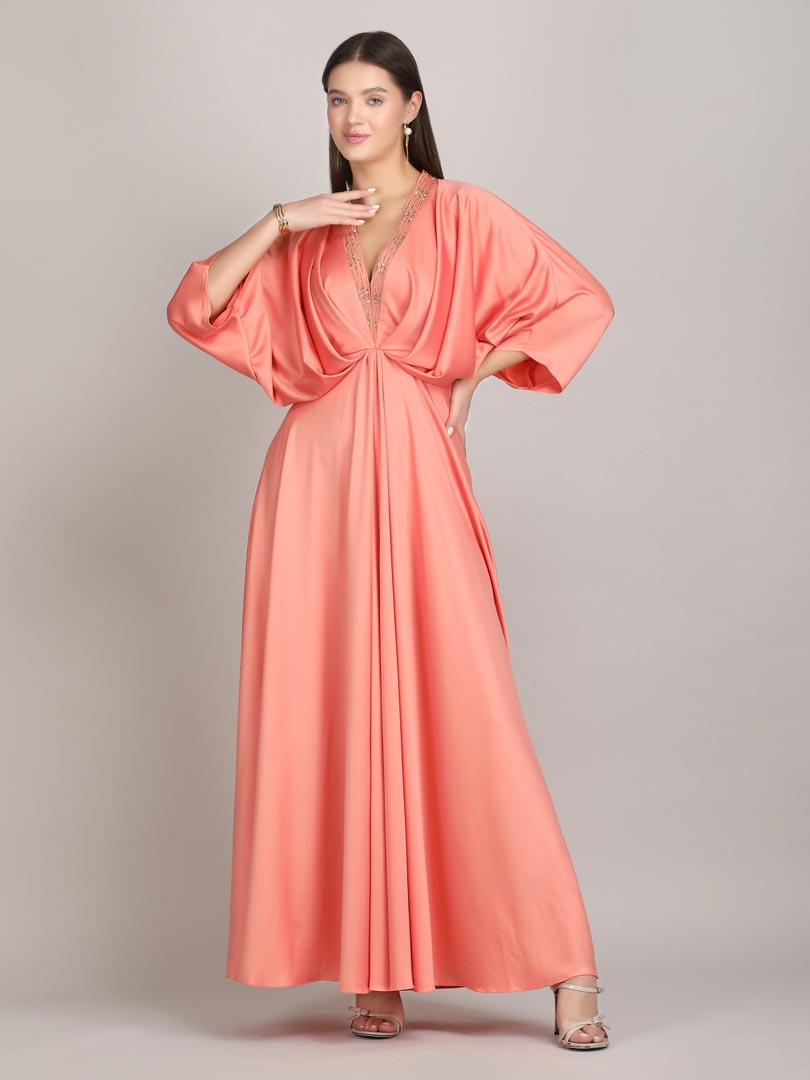 Radiate effortless elegance in this Peach Draped Kaftan, featuring delicate gold embroidery, elevated dressing. Fluid drapes and subtle shimmer make it a statement piece for resort or special occasions.