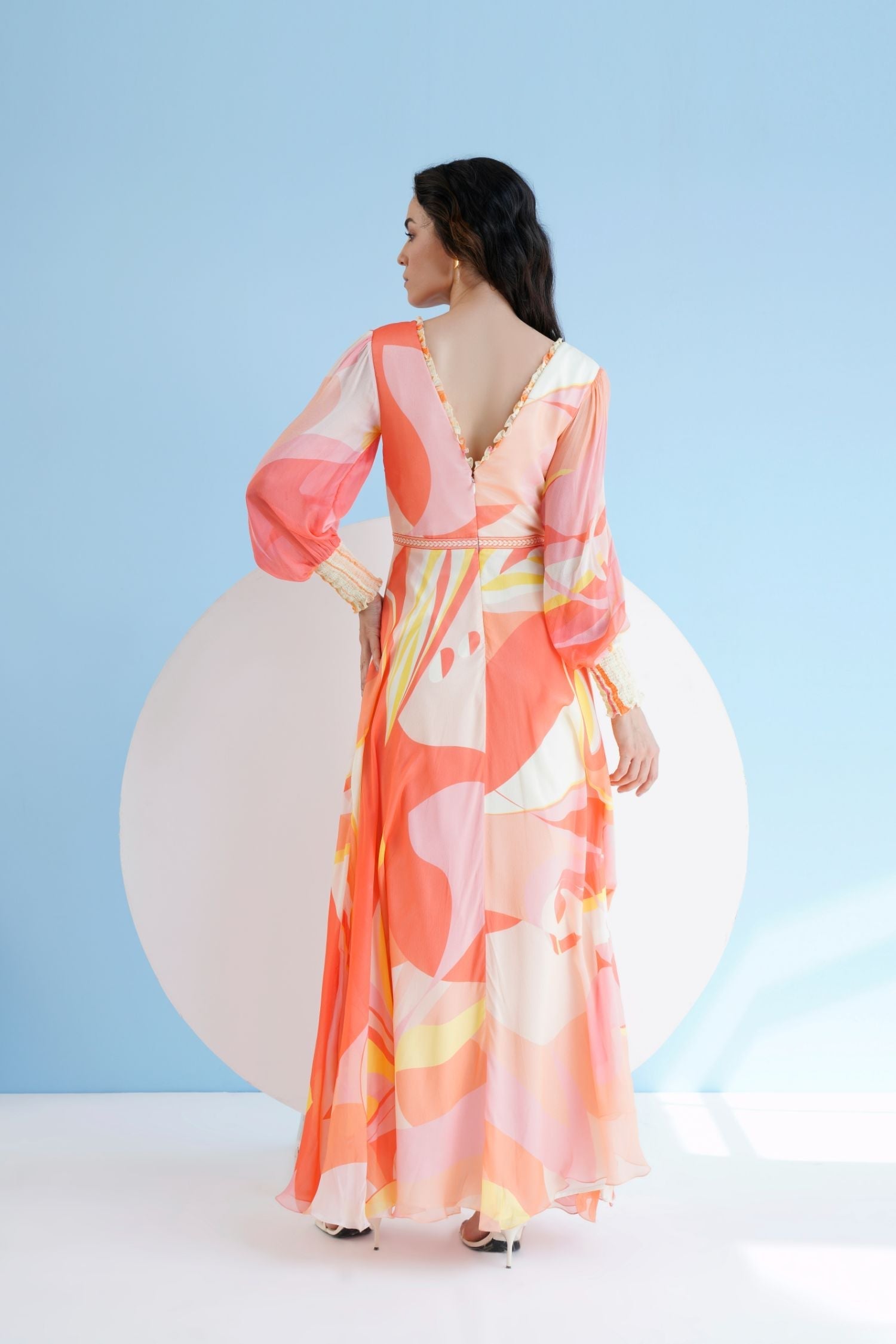 Featuring a peach golden ratio printed long dress in chiffon with a plunging neckline and puff sleeves.