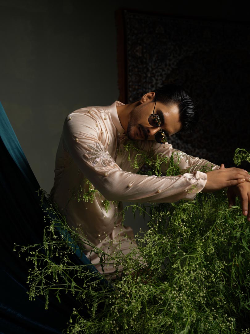 Peach kurta featuring delicate hand embroidery. The sleeves are adroned with palm tree motifs , all over kurta is covered with chheta work , paired with brown pant pajama.