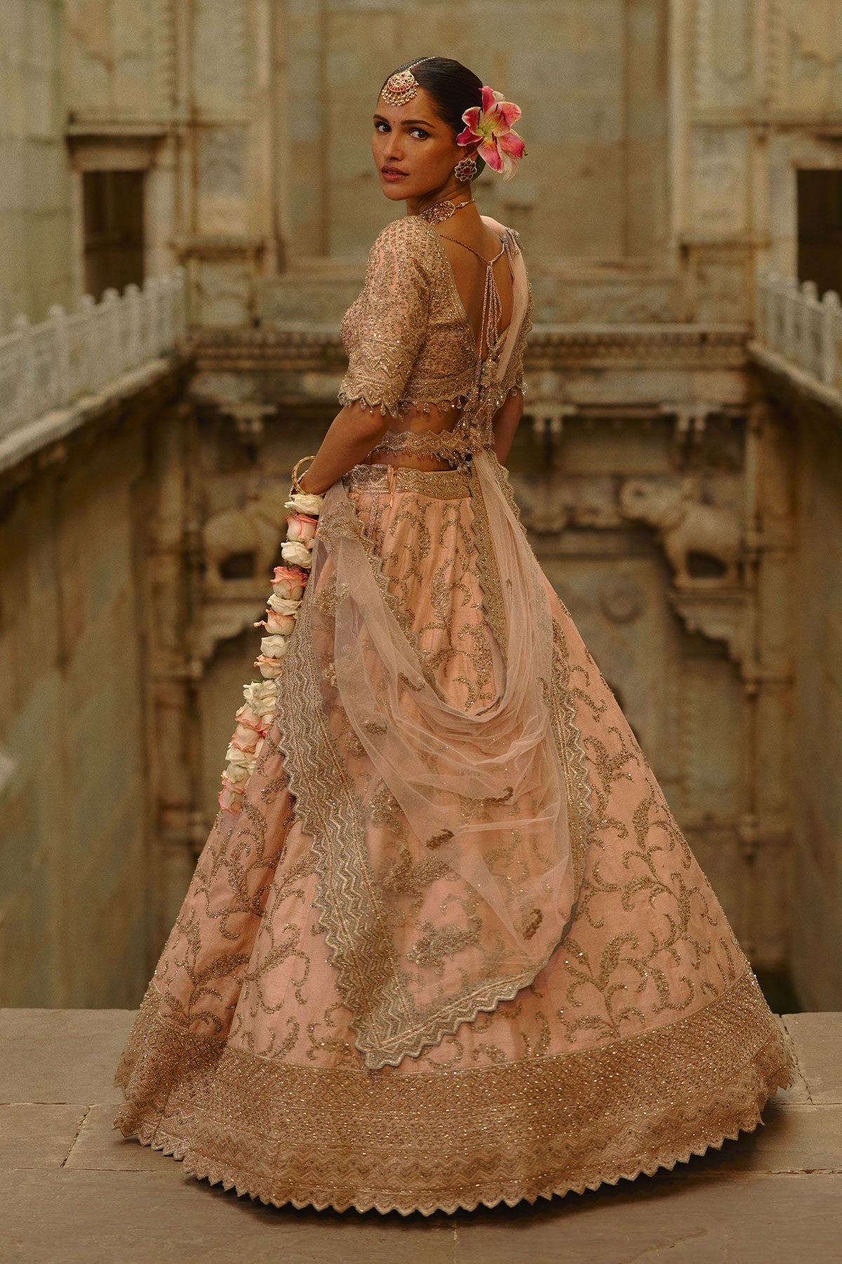 Peach raw silk lehenga choli dupatta set intricately embroidered with dabka, sequins and beadwork . It can be paired with an optional veil