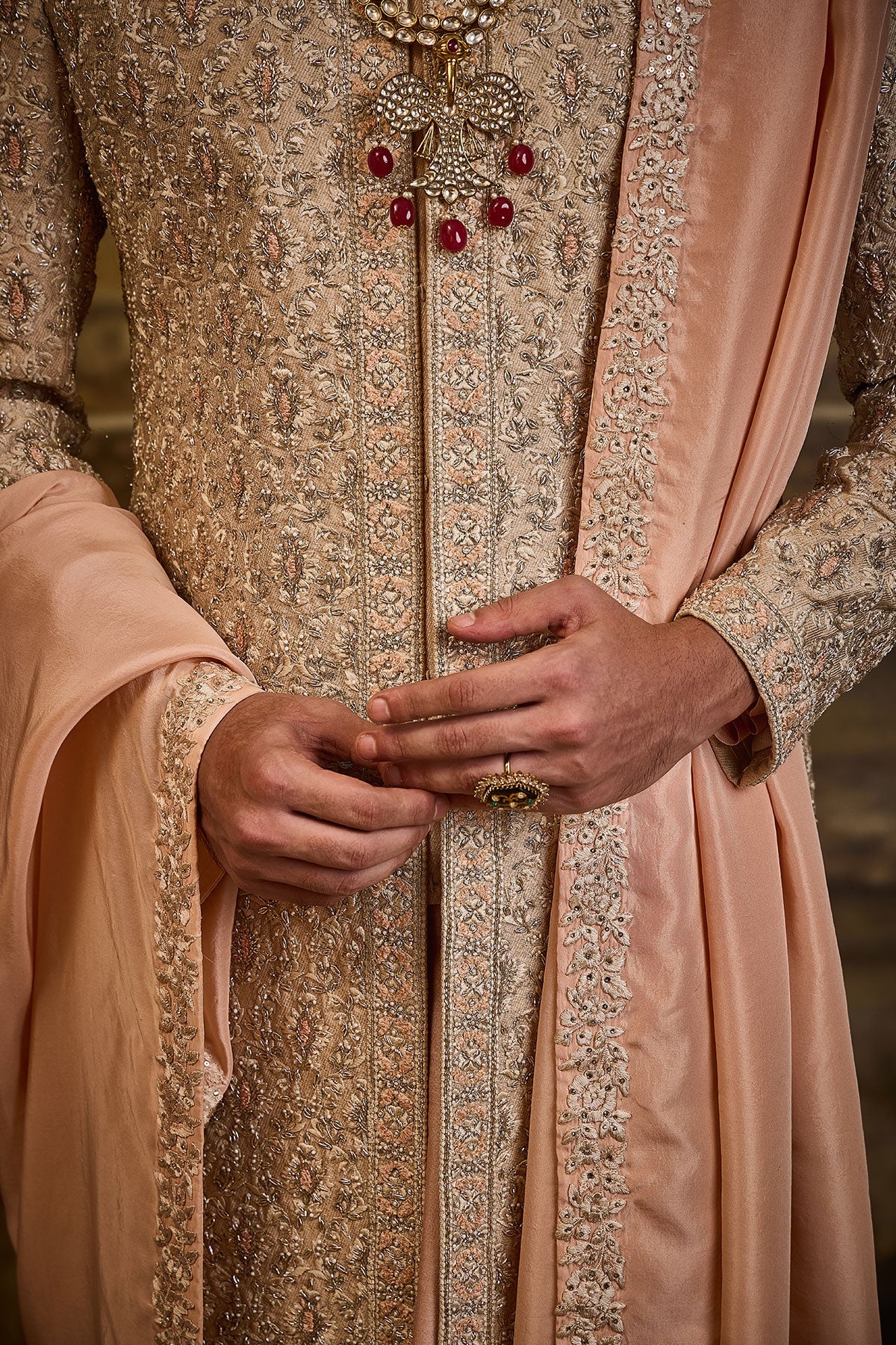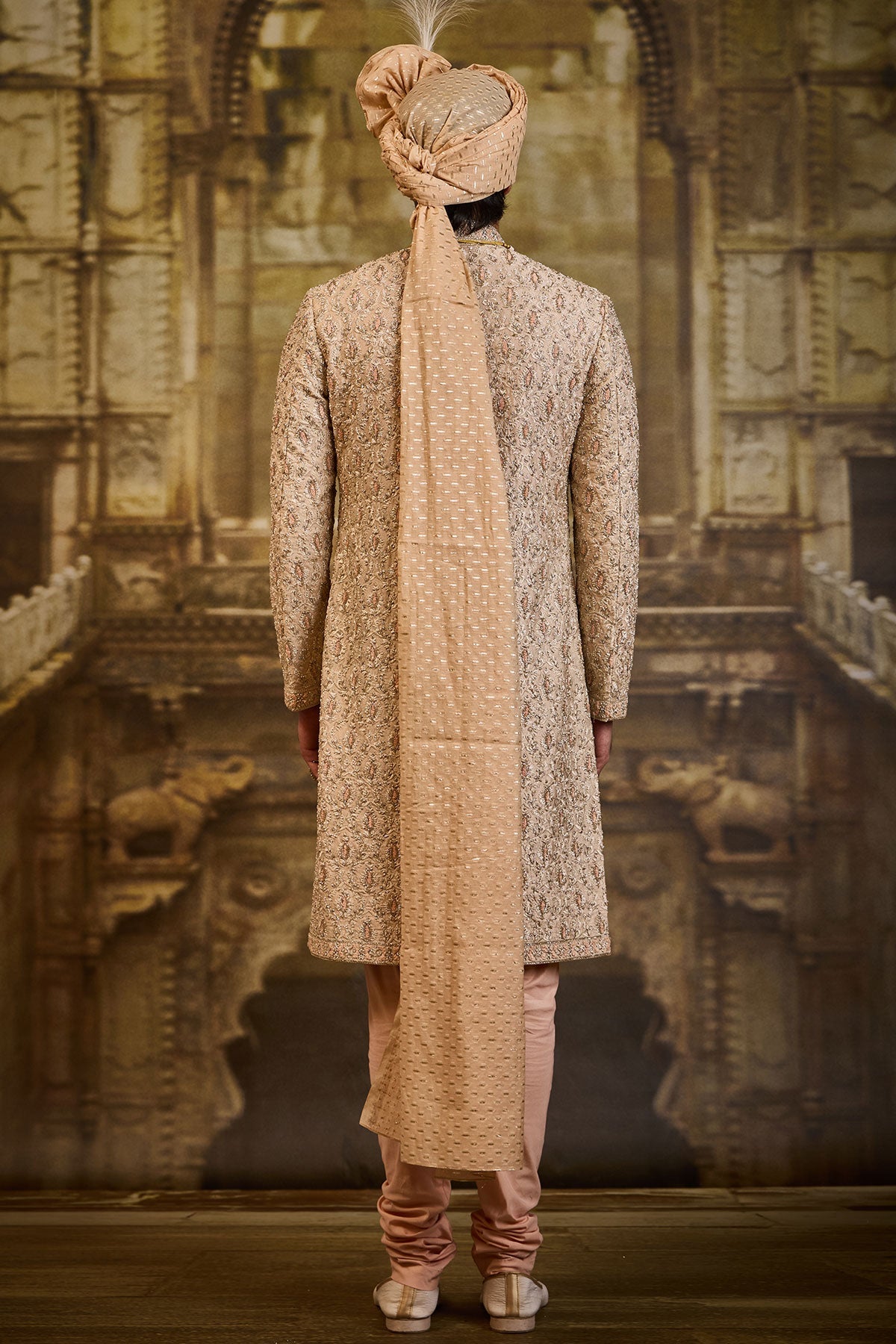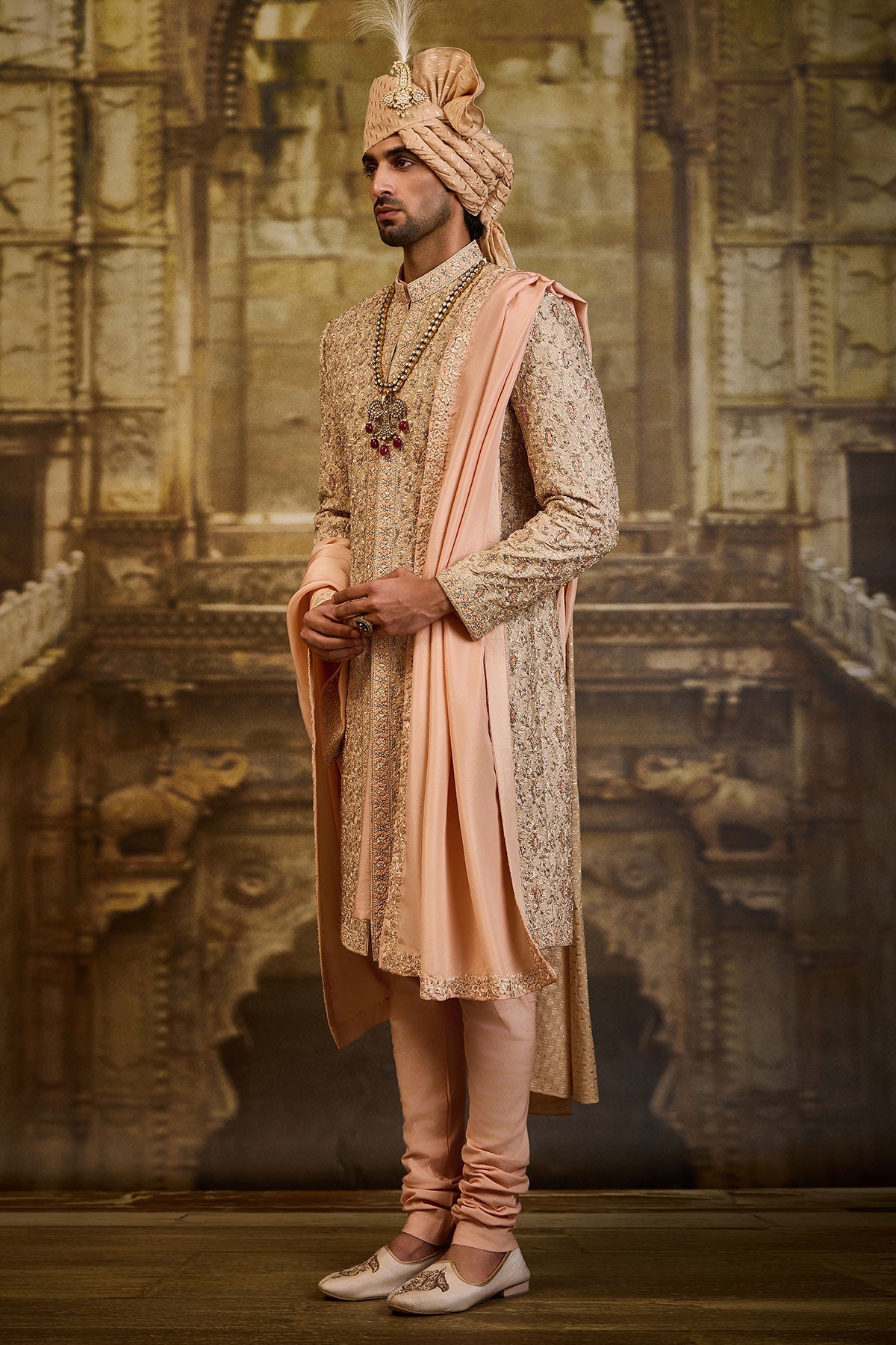 Peach Twill Woven Brocade Sherwani Embroidered Resham And Highlighted With Zari, Dabka, French Knots ,Beads And Crystals. It Comes With A Cotton Silk Kurta And Churidar. It Has An Optional Worked Stole And Jutis That Can Be Ordered In Addition.
