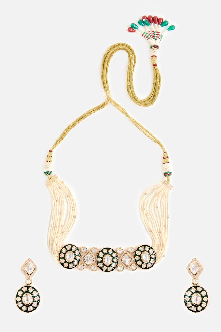 Stylish pearl choker set with matching earrings, featuring black and white stone floral motifs. A perfect blend of elegance and tradition, ideal for weddings, festive occasions, and evening wear.