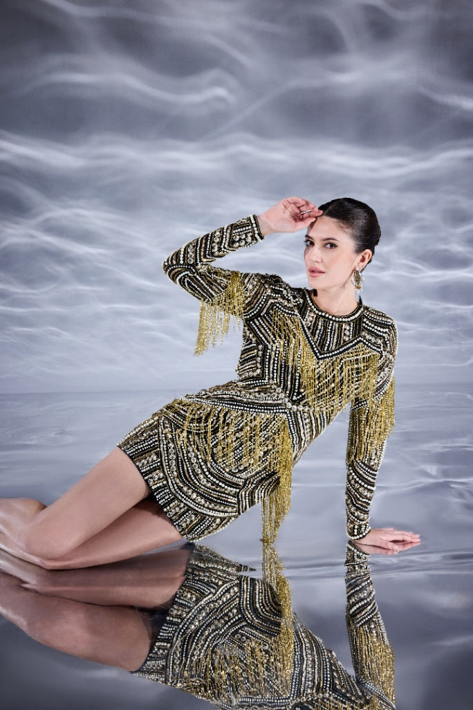 maxi garment,beaded, white dress with sweetheart neckline and then strap with fringes.top portion is fitted to the boby and then flows into a sheer, flowing skirt with a high slit up the side.with a pattern of silver and purple beads that resembles a floral pattern .