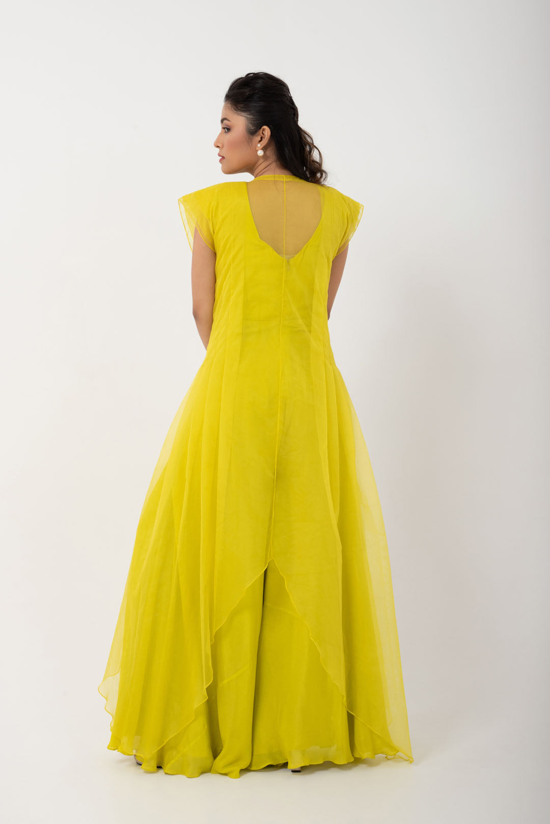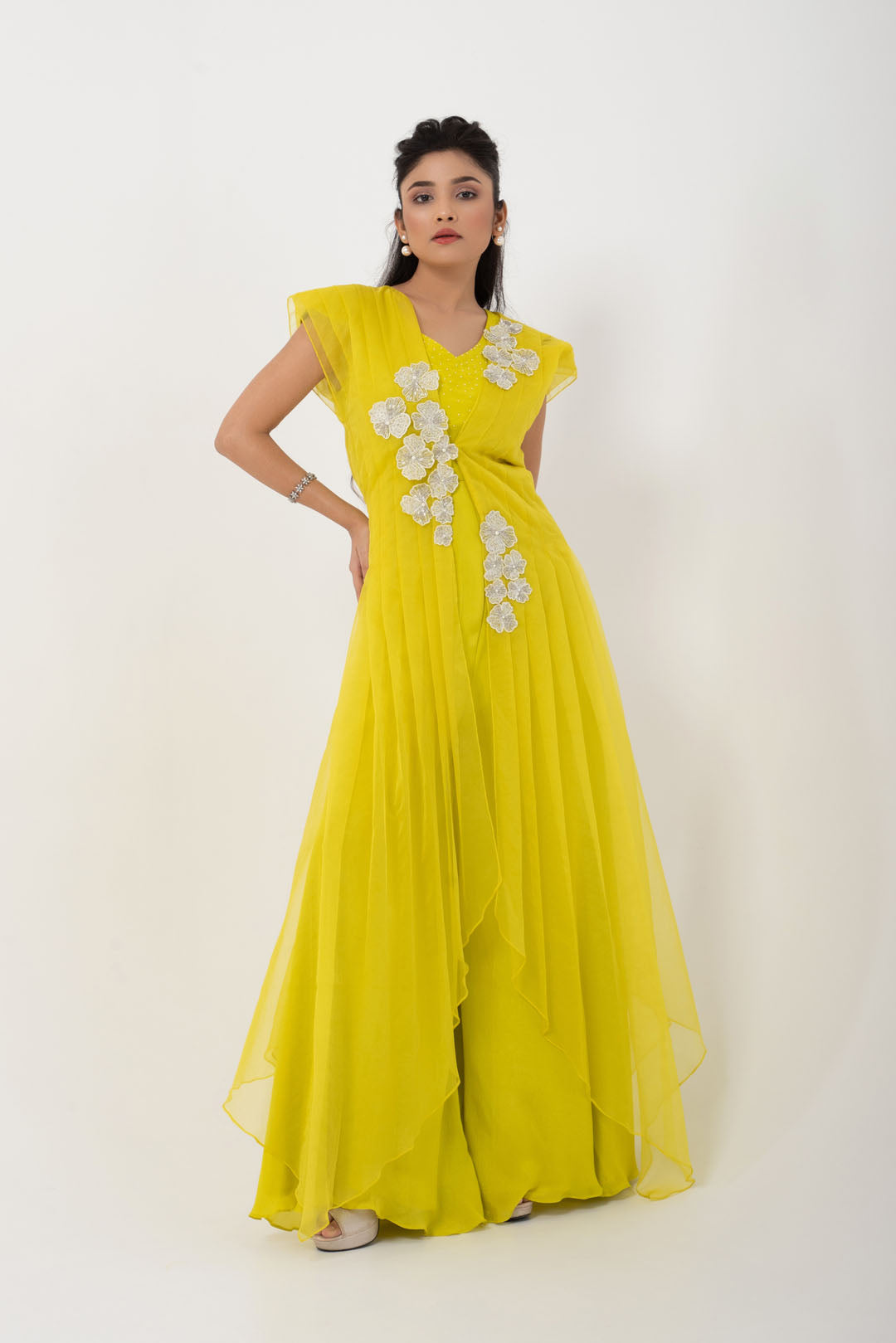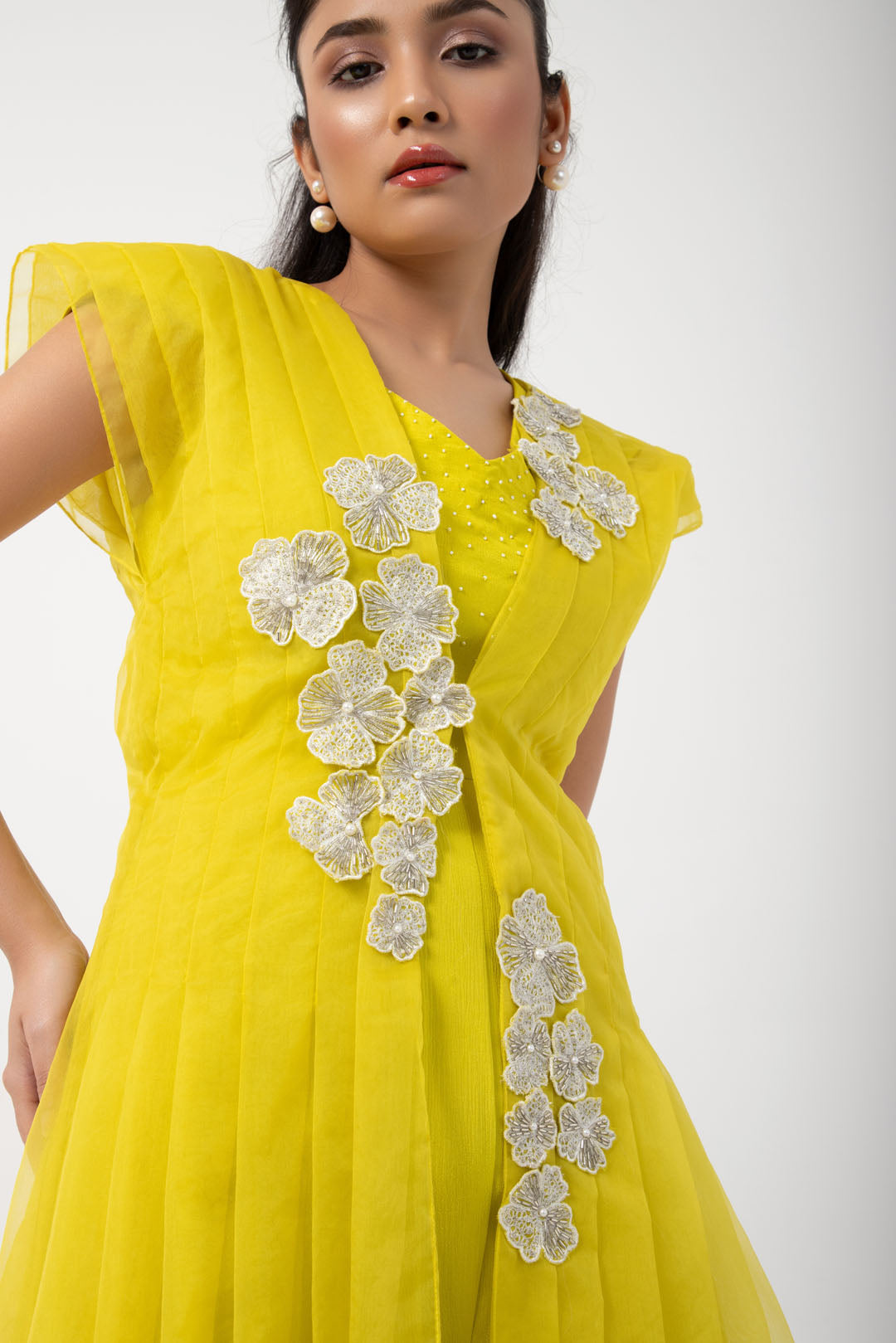 Elevate your look with this chic jumpsuit paired with a marvellous organza jacket. The jumpsuit features a sleek silhouette with flared leg and a flattering waist. The sheer jacket features pleats that create a structured shoulder, highlighted by 3D floral applique across the front.