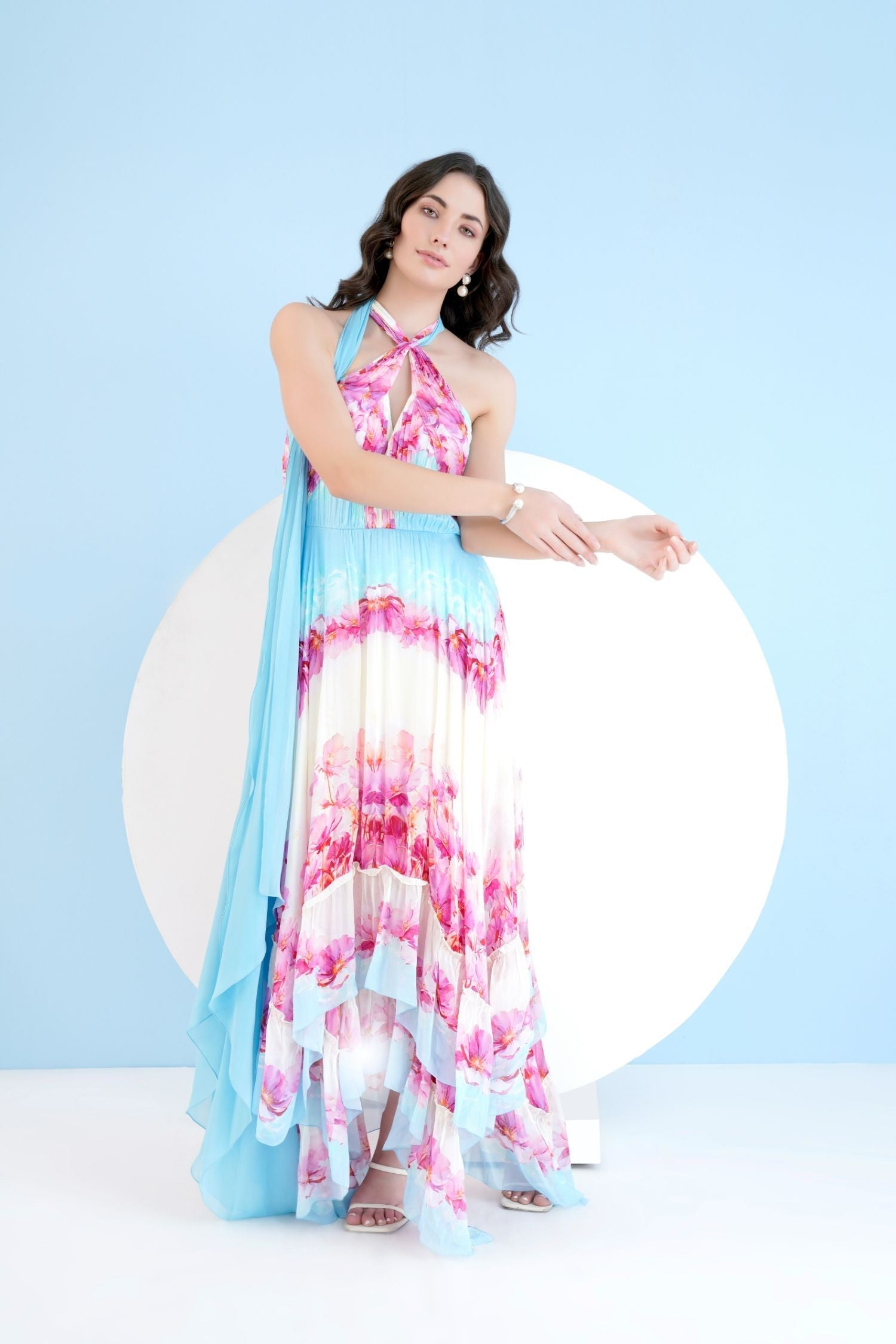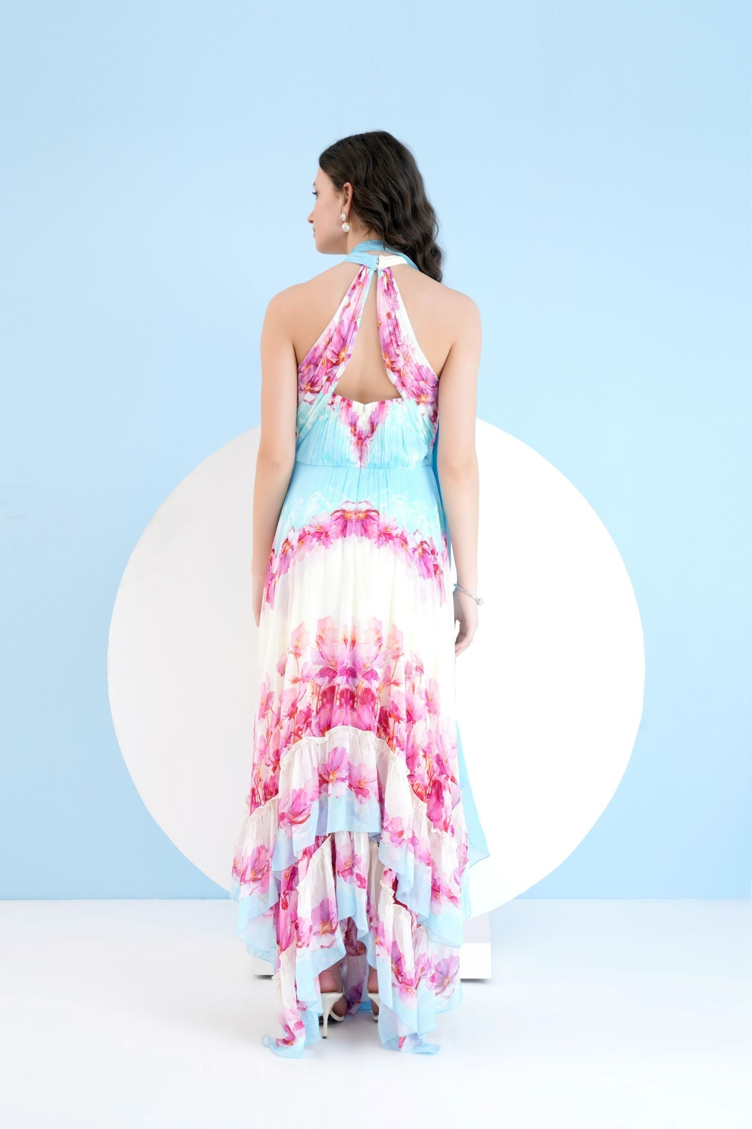 Featuring a pink dune printed high-low dress in chiffon with a cross neckline.