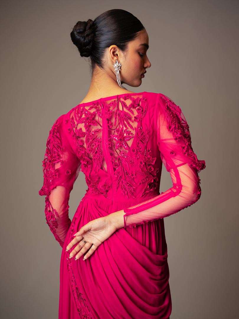 Pink Georgette Bead 3D Embellished Gown Saree