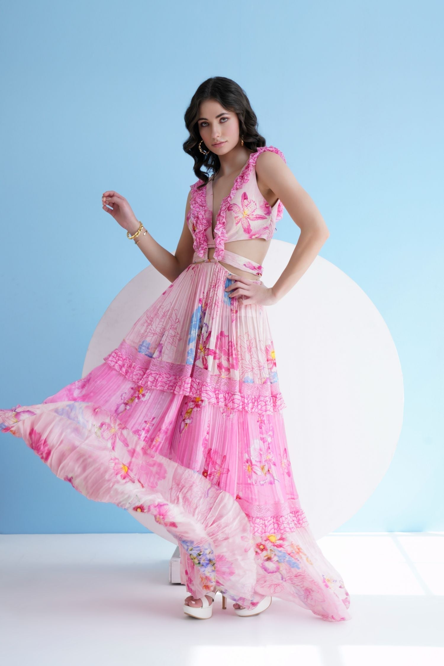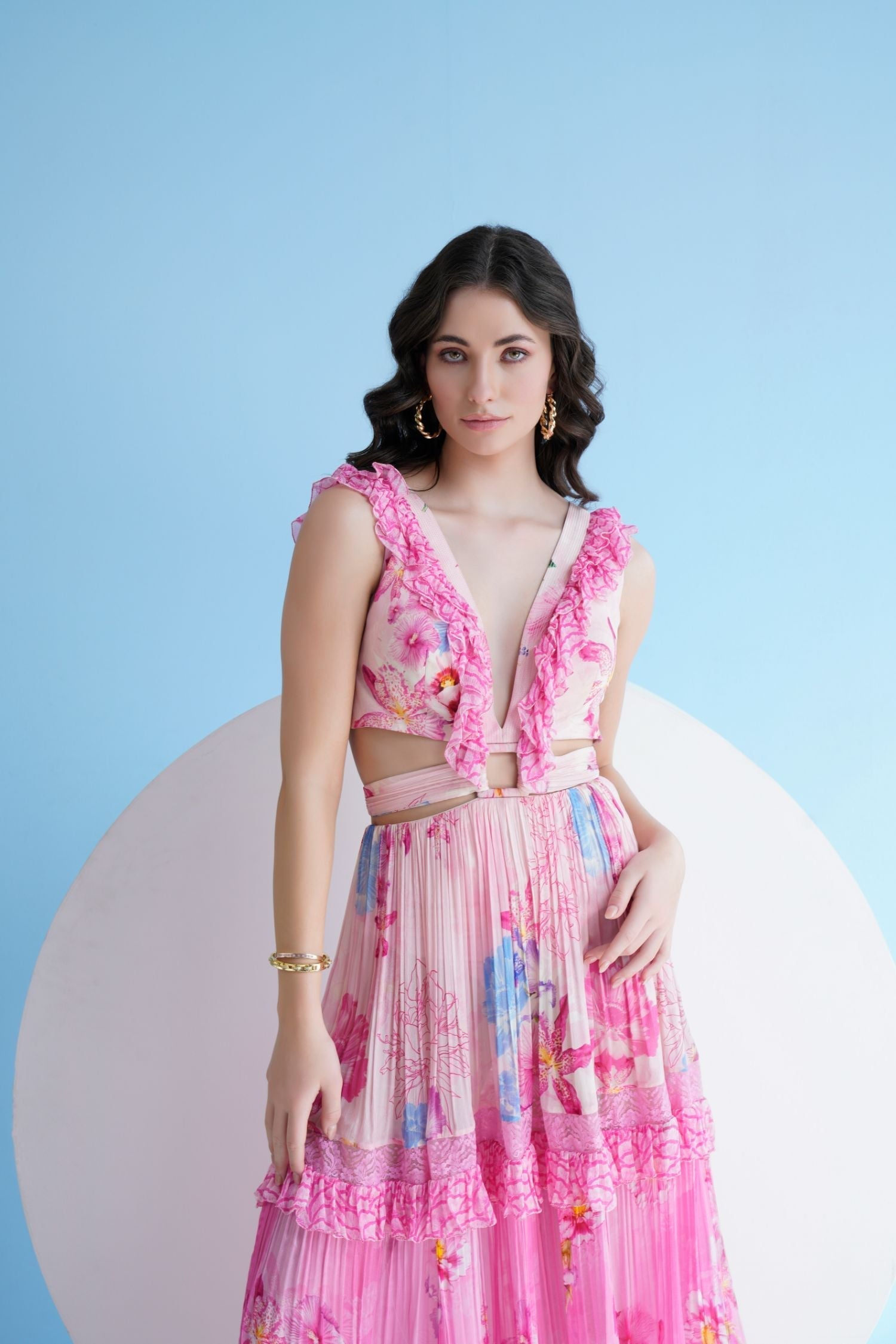 Featuring a pink pastoral printed dress in chiffon with a frilled plunging neckline, waist cutout, and lace detail.