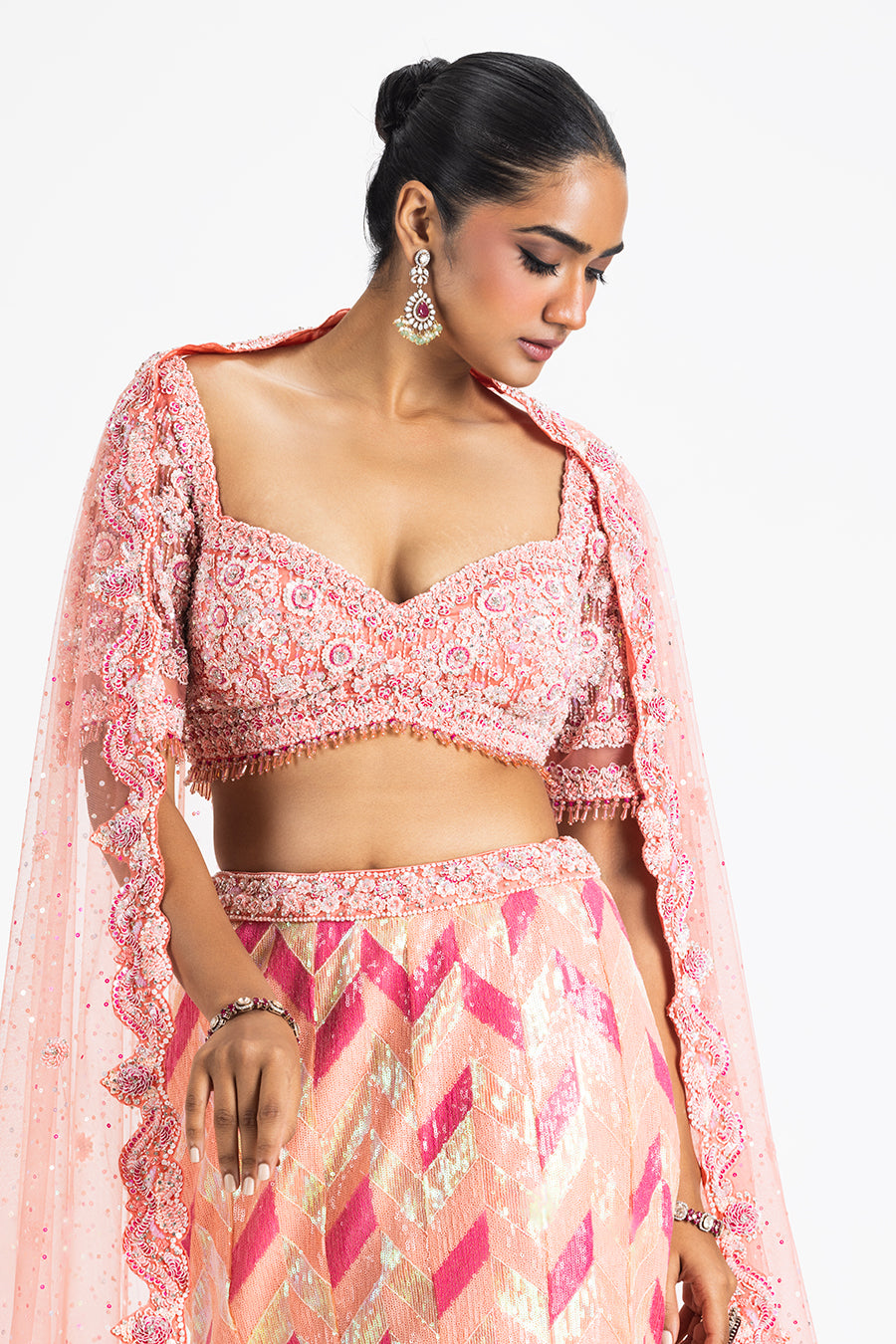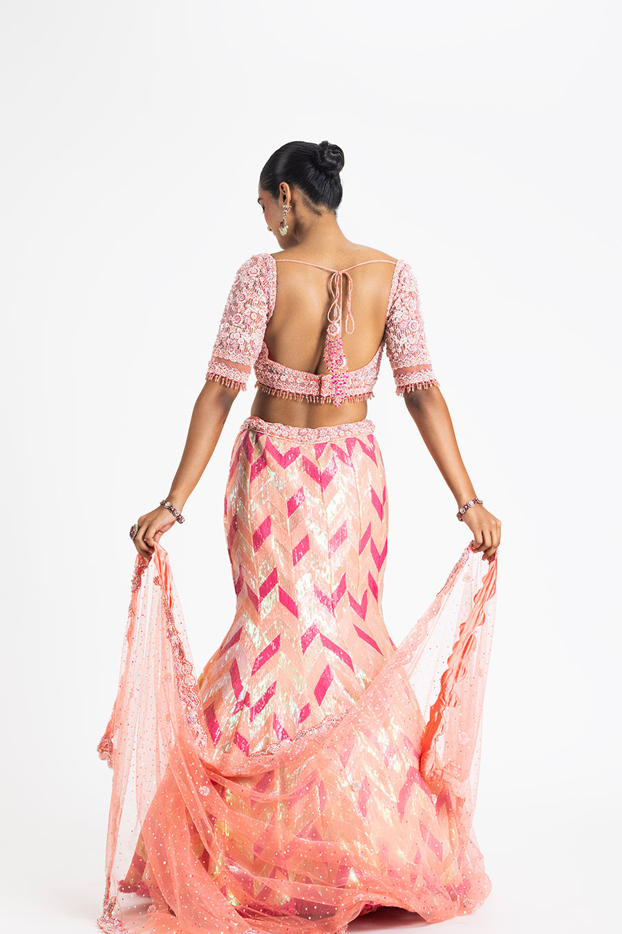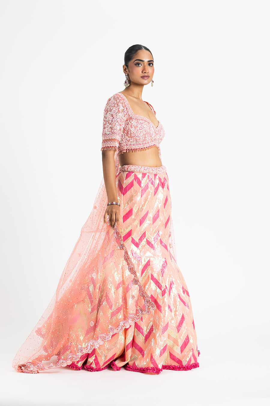 Pink Sequined Fishtail Lehenga In A Zigzag Pattern With A Blouse And Net Dupatta Embroidered In A Delicate Floral Pattern With Sequins, Beads, And Crystals.