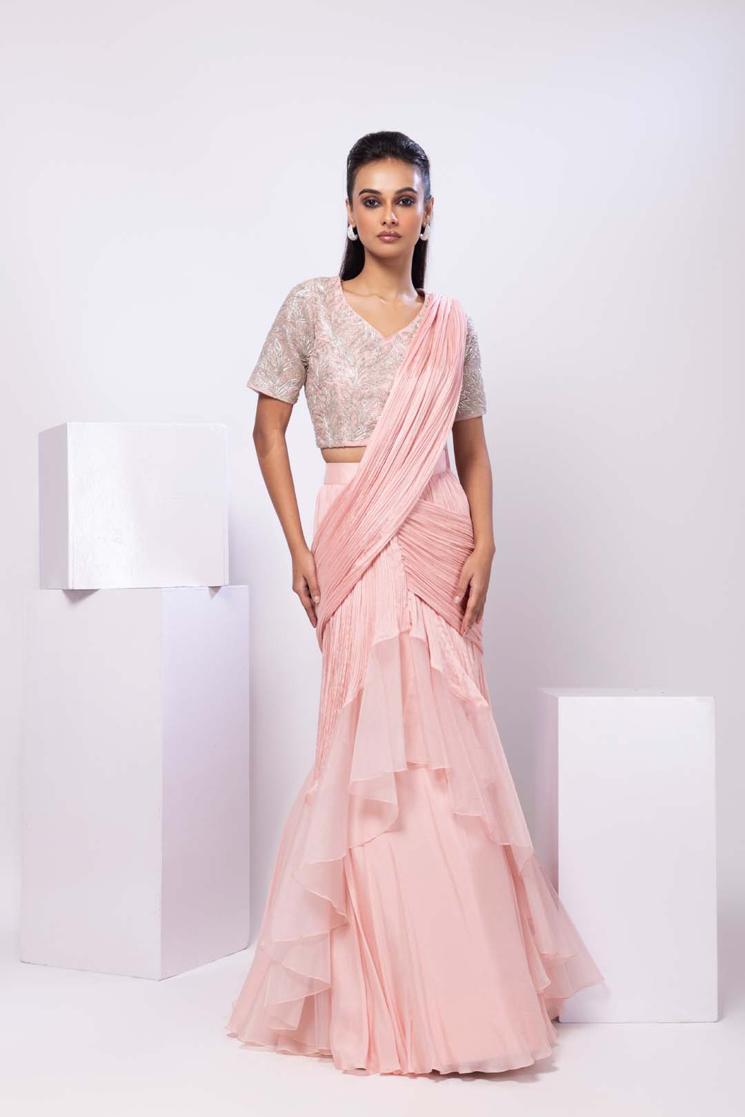Turn it up with a not-so-simple combination of pink lehenga with silver embroidered blouse. The figure hugging cut of the lehenga skirt with attached palla unifies the look ensuring you look exquisite everytime.