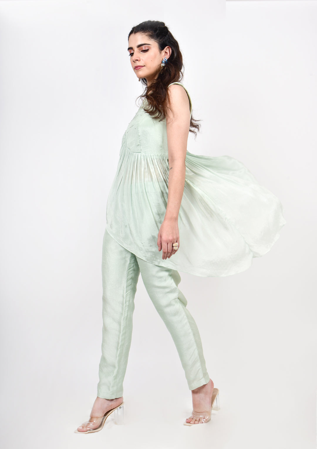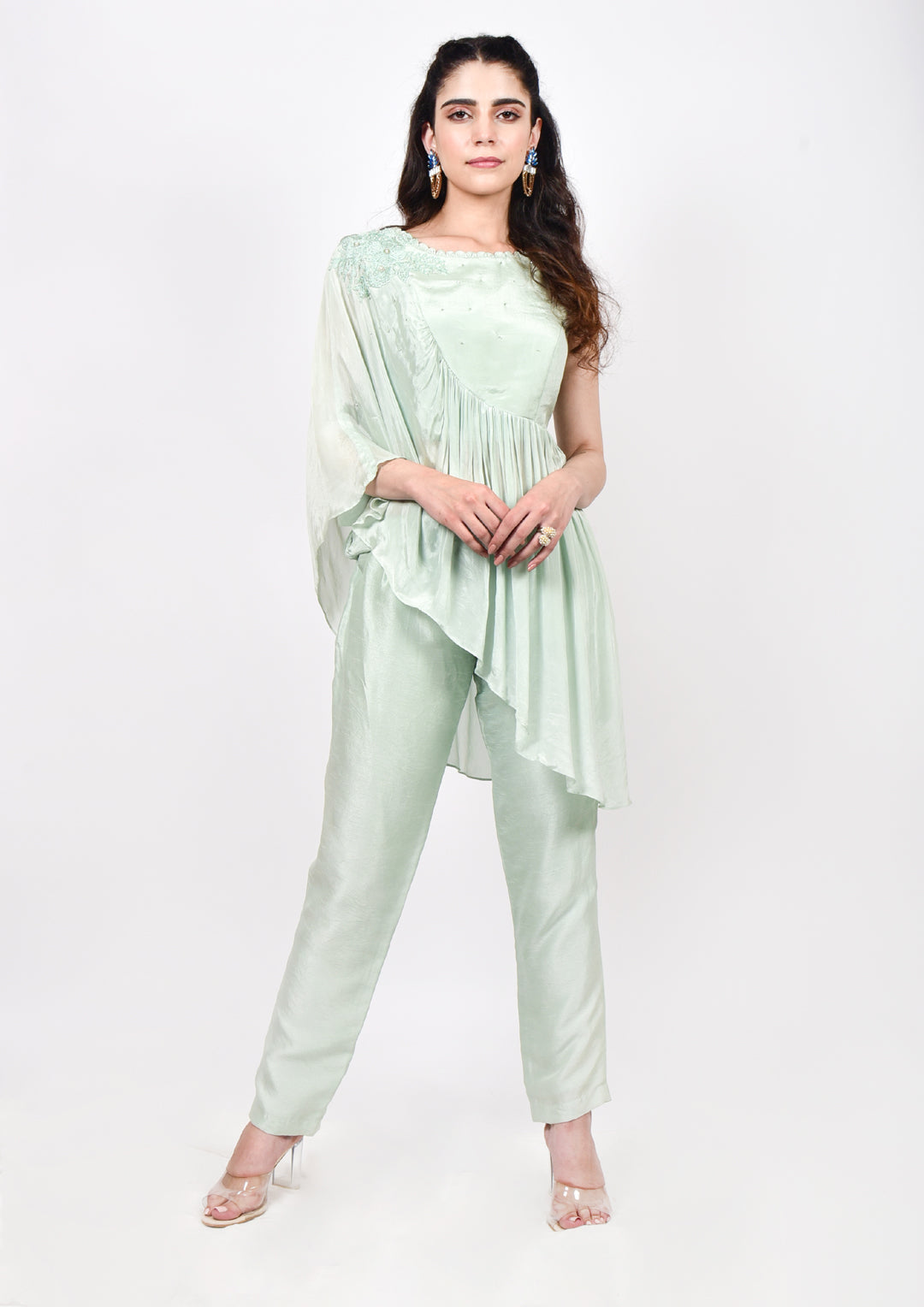 Featuring a pista green asymmetrical peplum embellished with cutdana paired with straightpants. This piece consists of a peplum and a pant. Length :Peplum LONG 42" SHORT 24" , pant 42".
