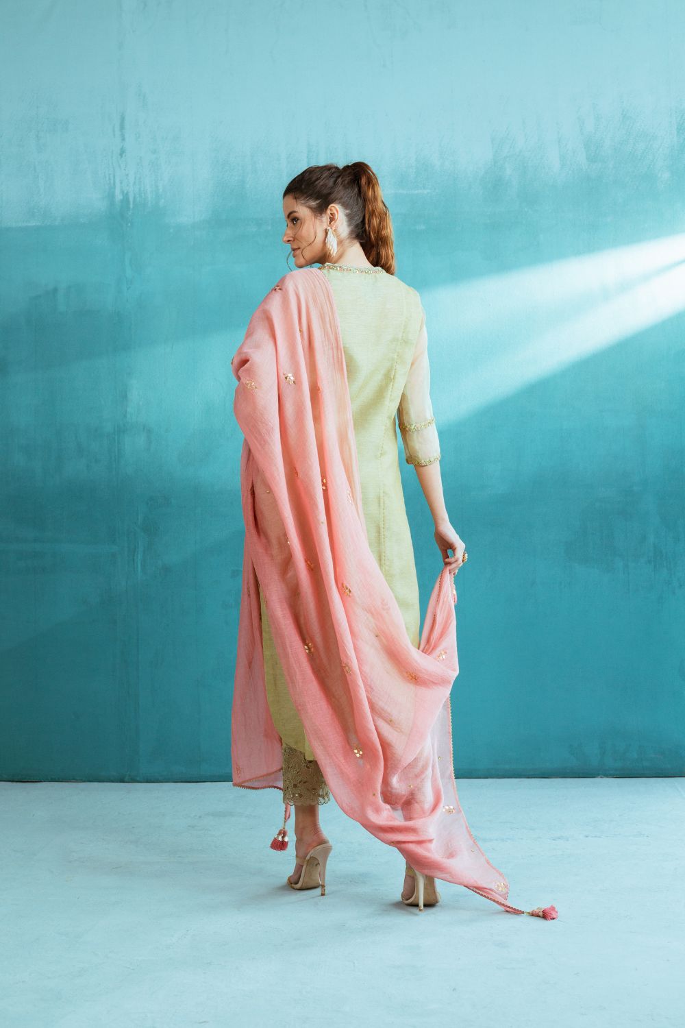 Pista Green Tissue Chanderi Round Hem Embroidered Kurta with Cutwork Embroidered Pencil Pants and Embroidered Chanderi Dupatta.