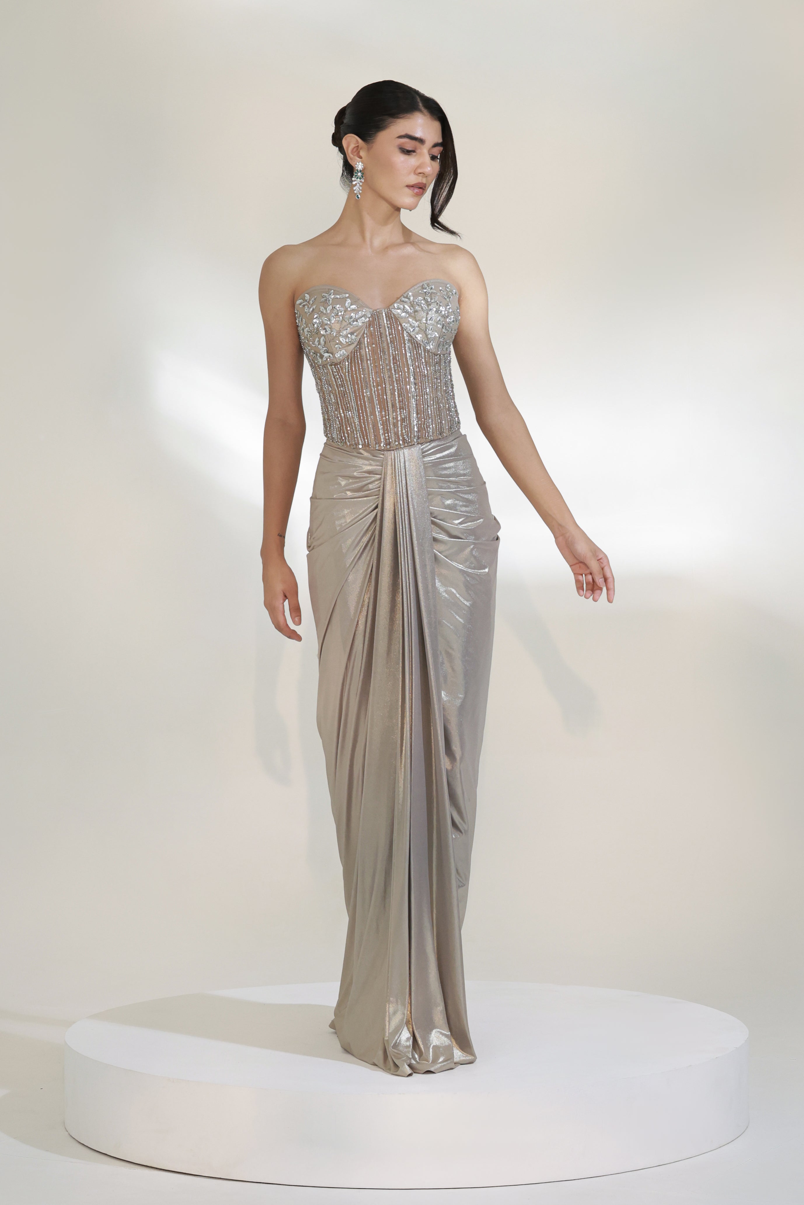 Command attention in this exquisite ensemble. A silver embroidered corset, rich with intricate detailing, pairs perfectly with a flowing drape dhoti skirt, crafting a look that's both opulent and effortlessly chic. Unleash your inner goddess."