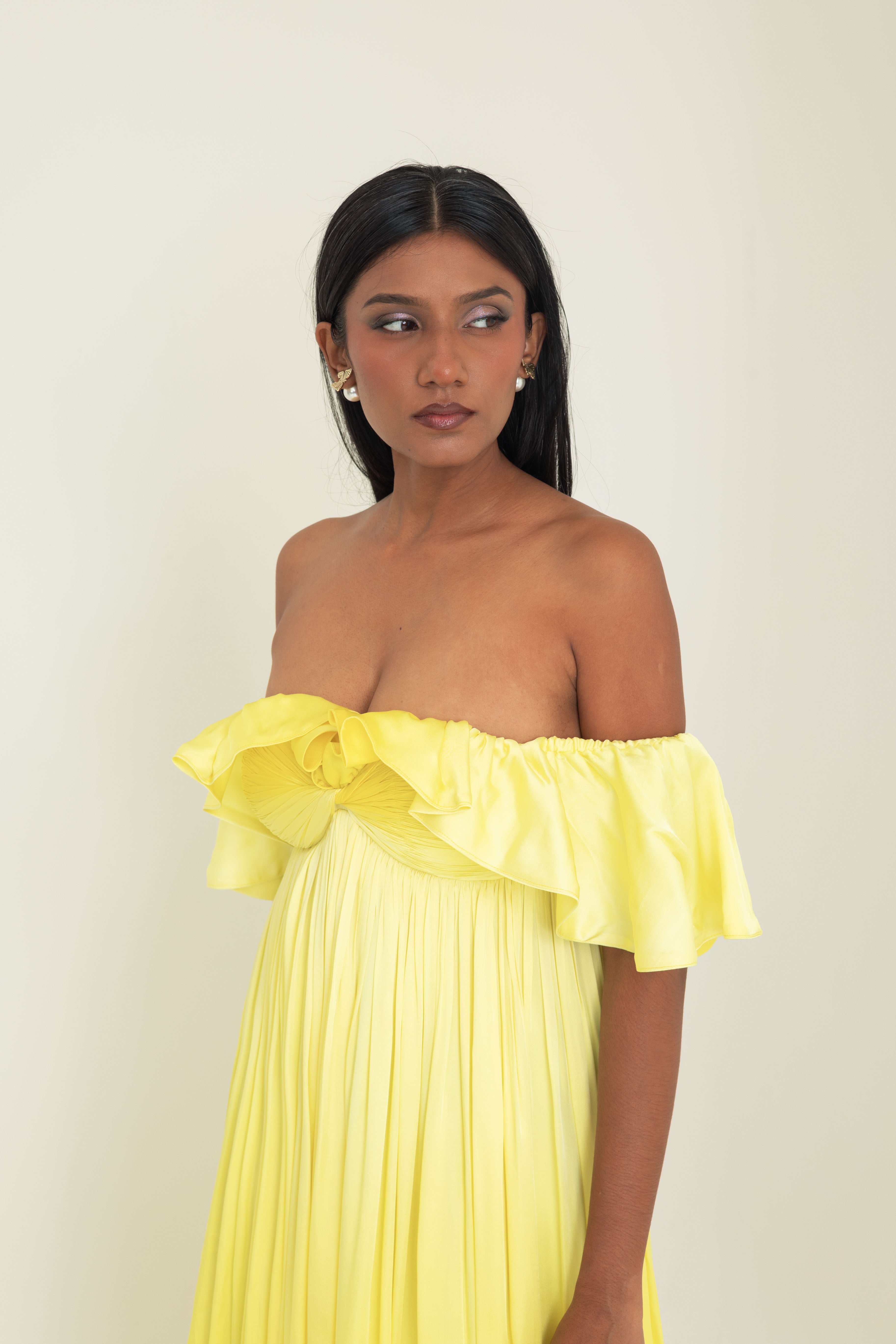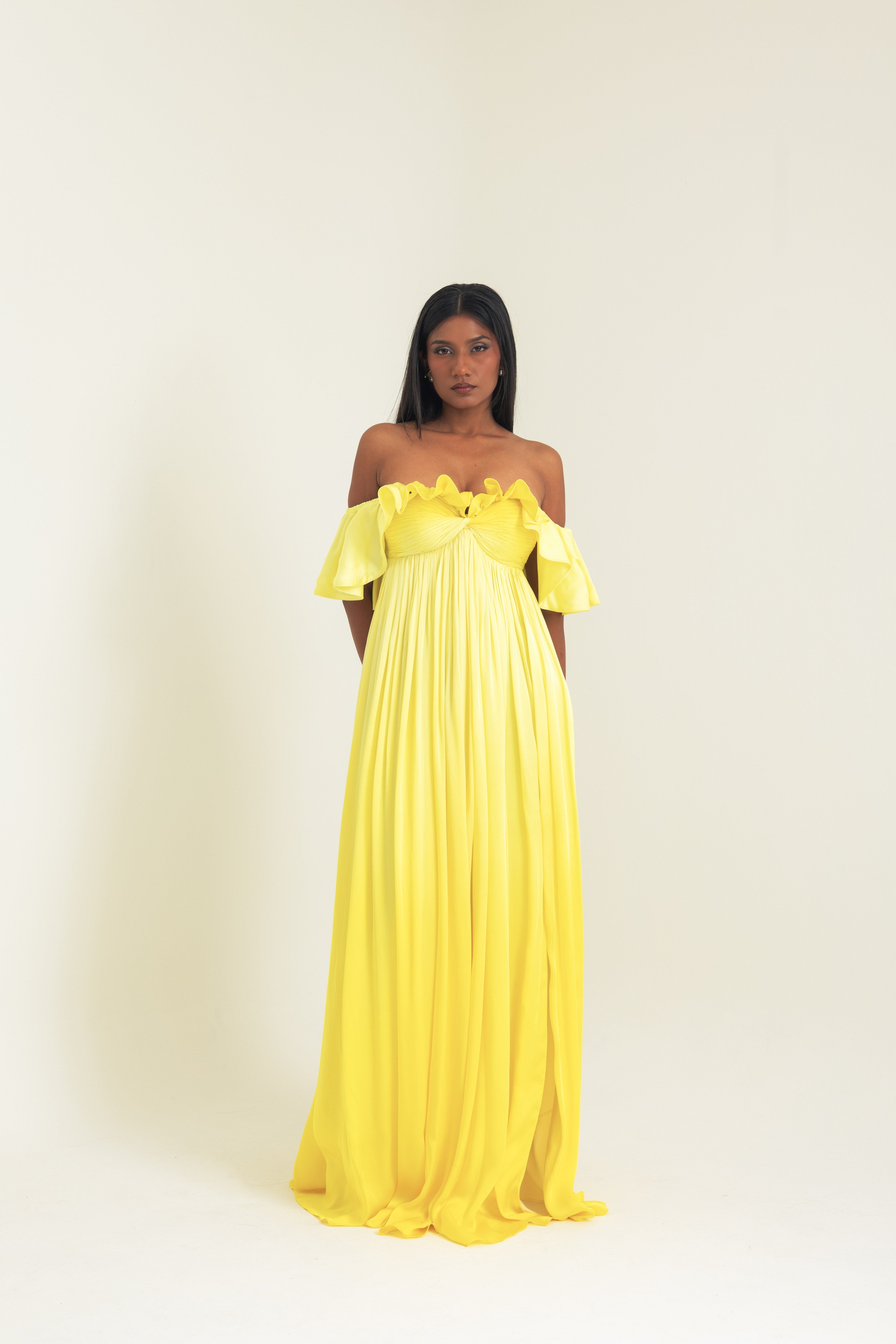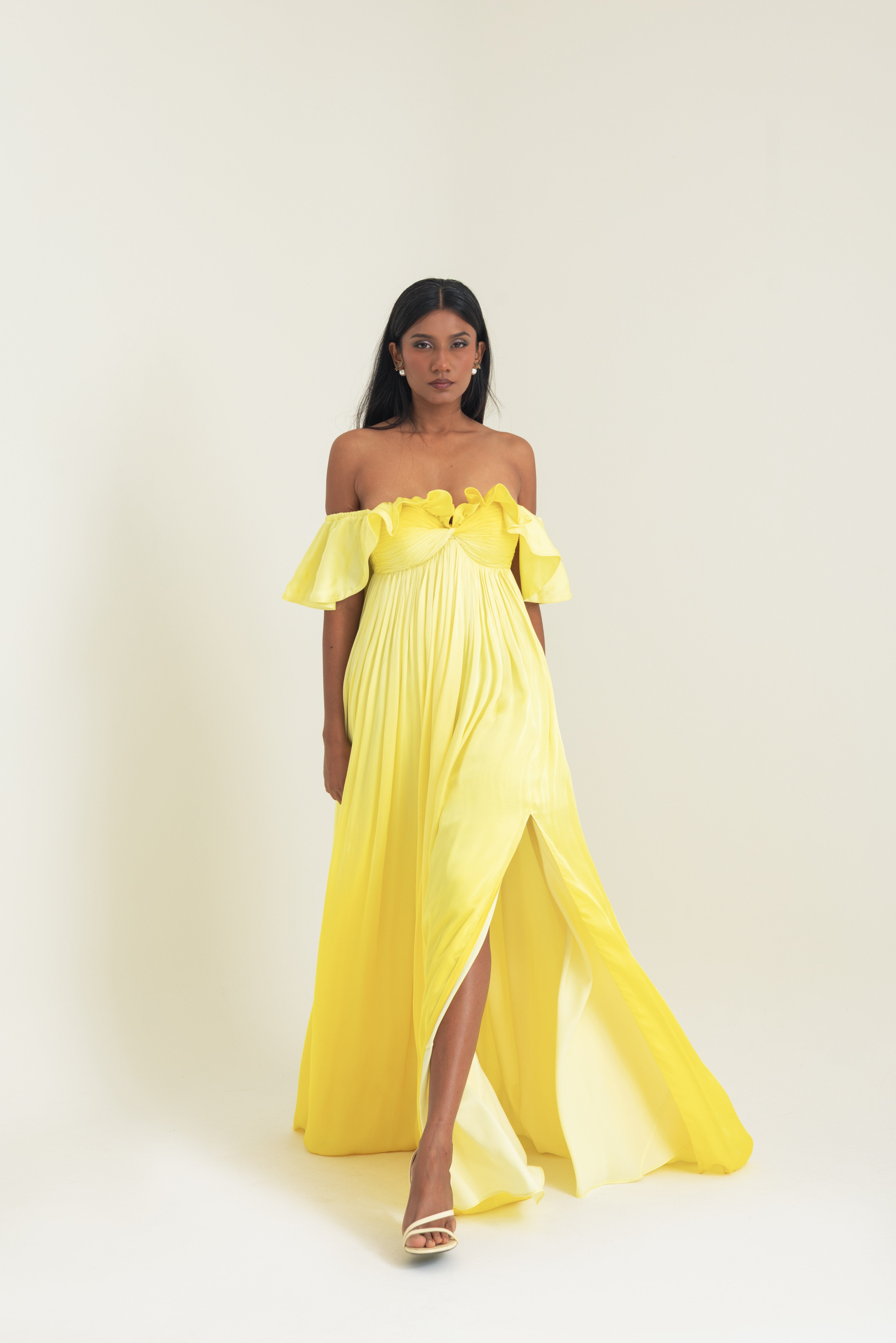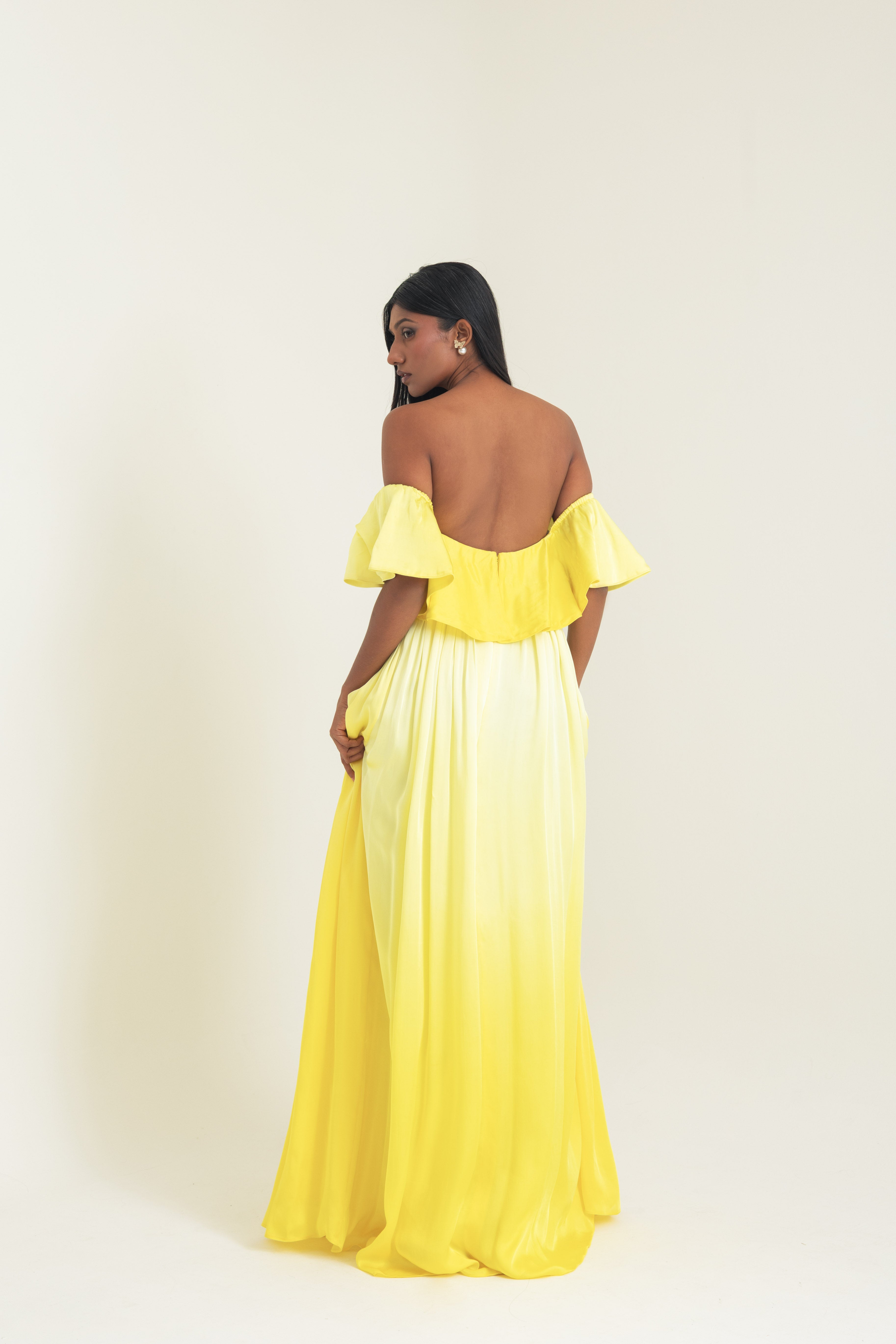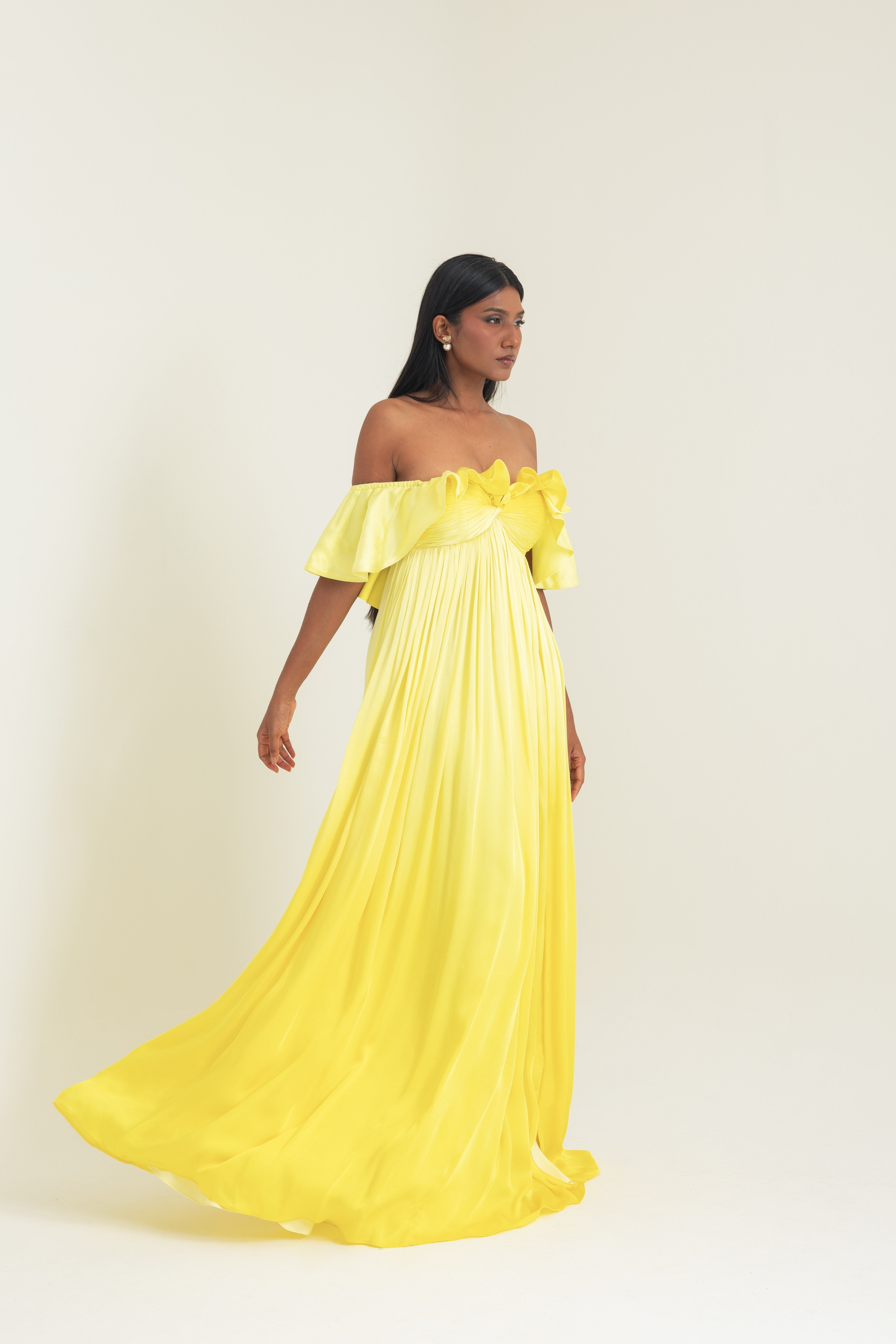 Turn heads with this ethereal shaded yellow gown, crafted in luxurious satin georgette that drapes beautifully and glides with every step. The off-shoulder neckline is adorned with soft ruffles, adding a romantic flair, while the gathered bodice creates a flattering silhouette that flows into a floor-length, pleated skirt. The gradient yellow tone transitions seamlessly from a soft butter hue to a rich golden finish, evoking a sense of sunshine and warmth.